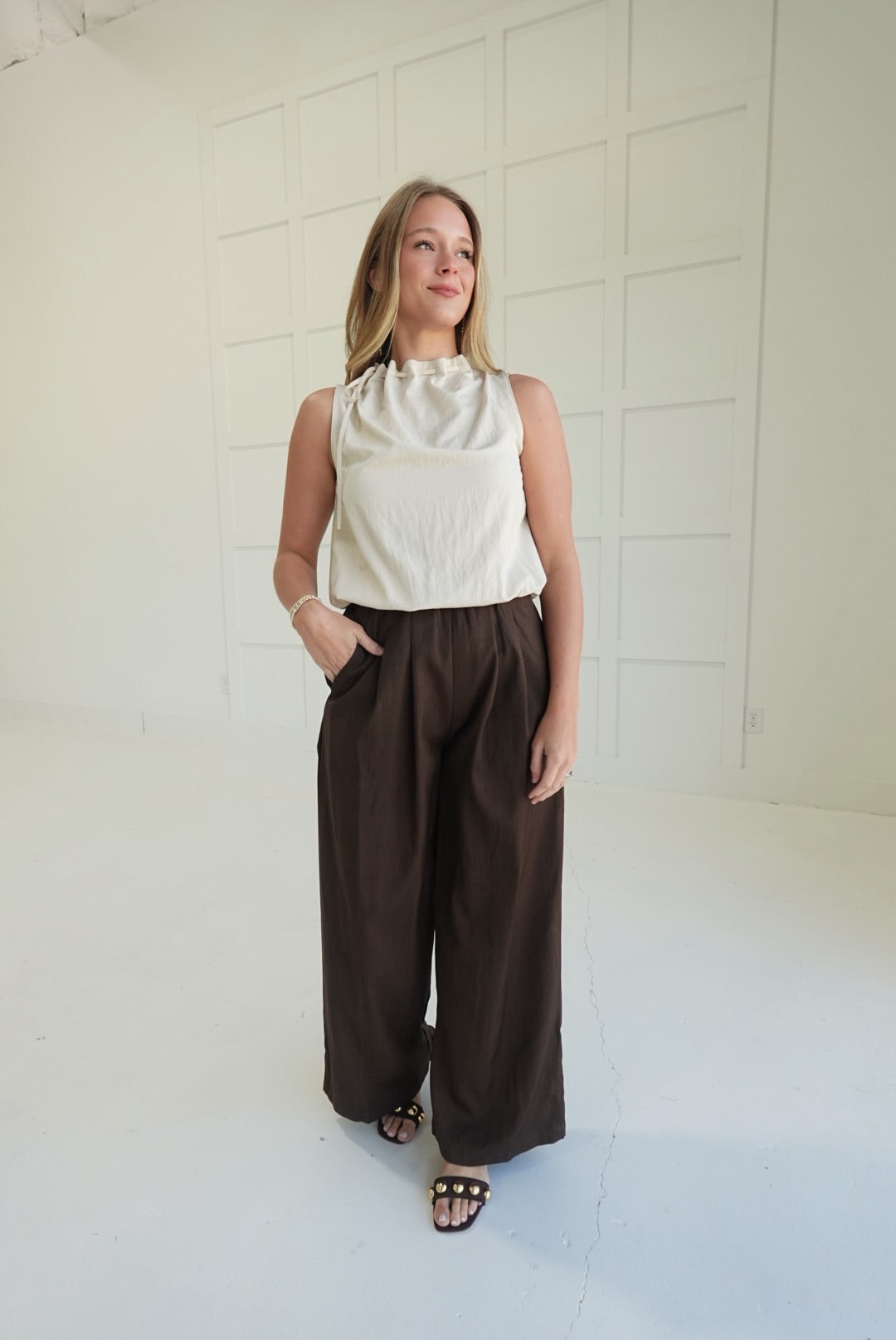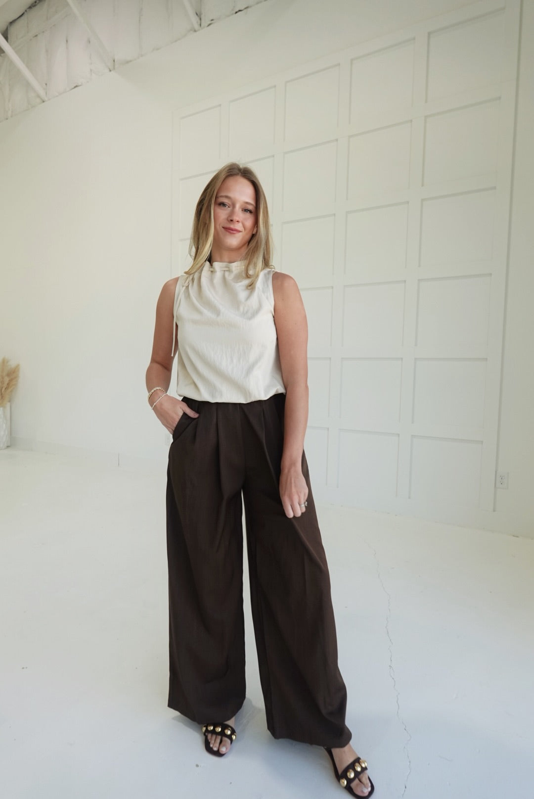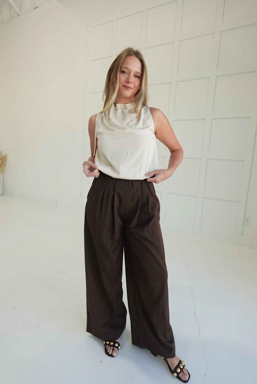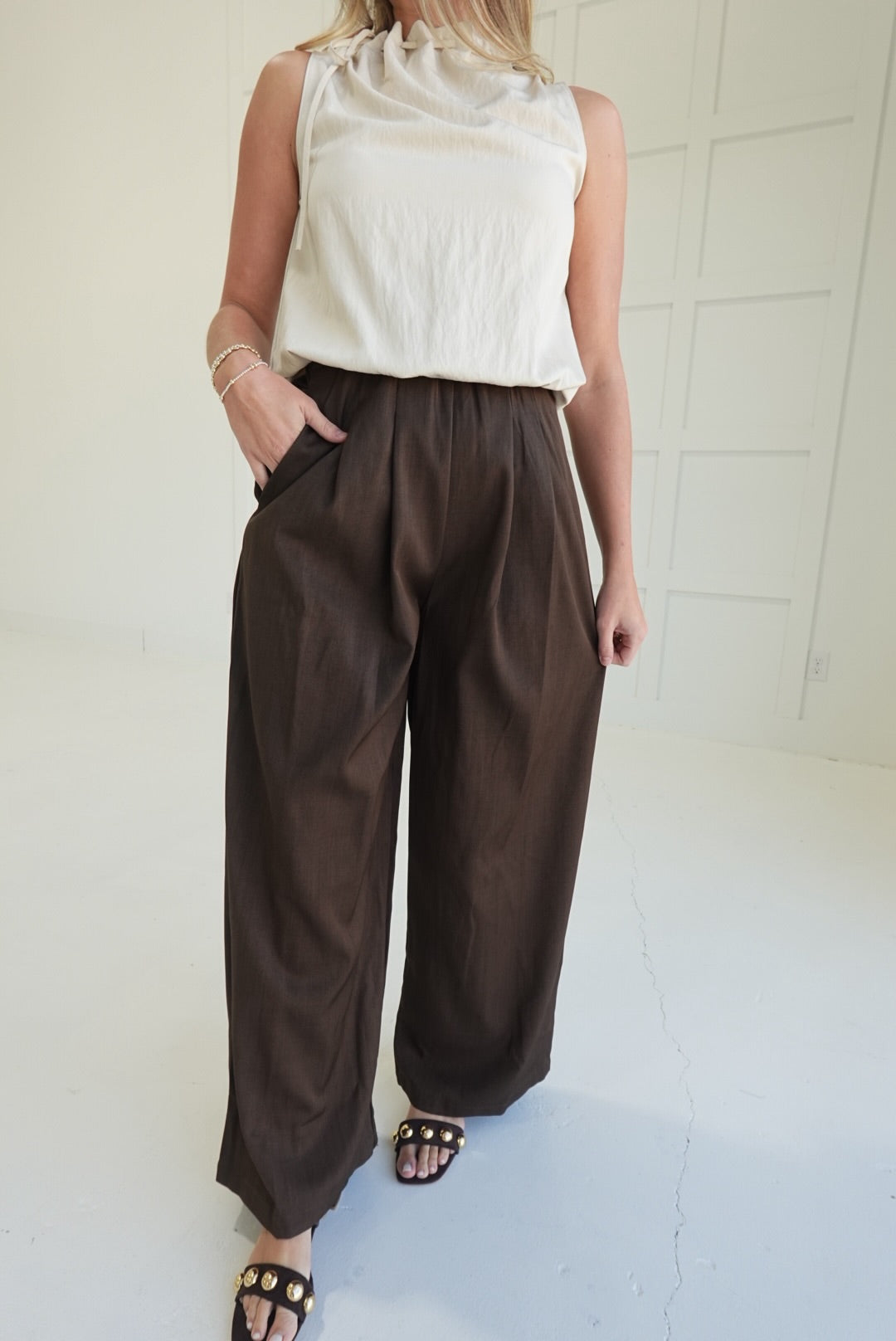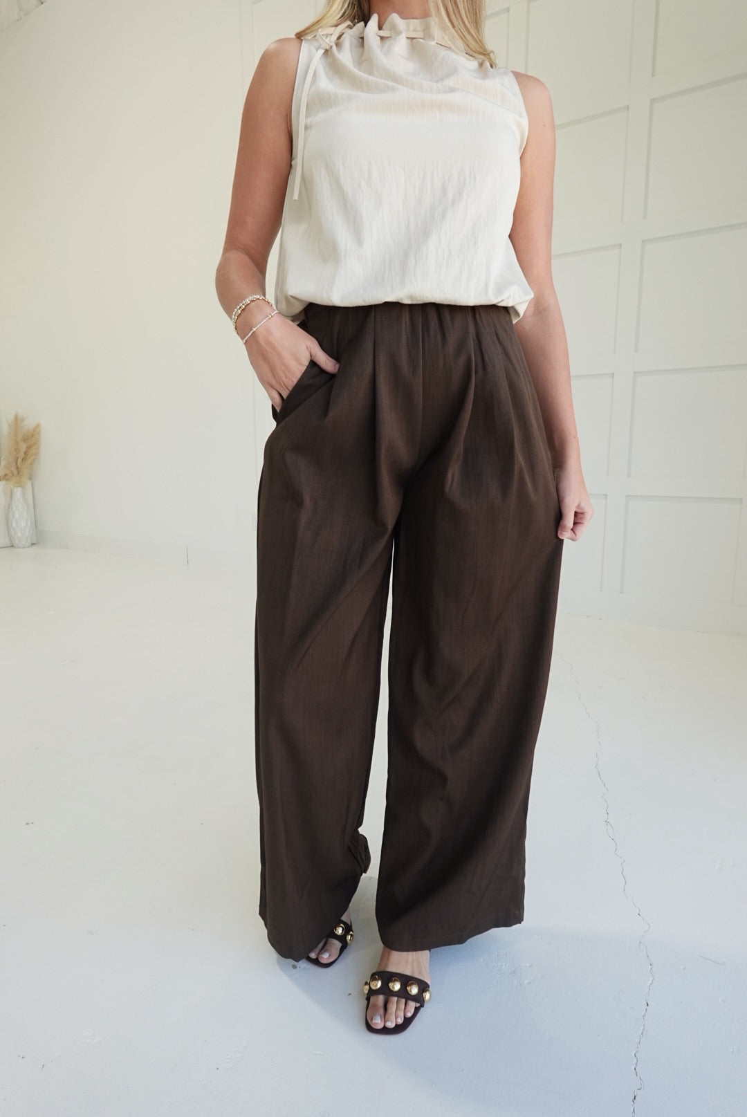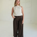Experience comfort and style with the On My Dime Trousers. These pleated, wide-leg tailored trousers offer a flattering fit and elegant silhouette, perfect for both professional settings and casual outings. The pleats add a refined touch while allowing ease of movement, helping you feel confident and comfortable throughout your day. A versatile wardrobe essential designed to support your busy lifestyle with polished sophistication.