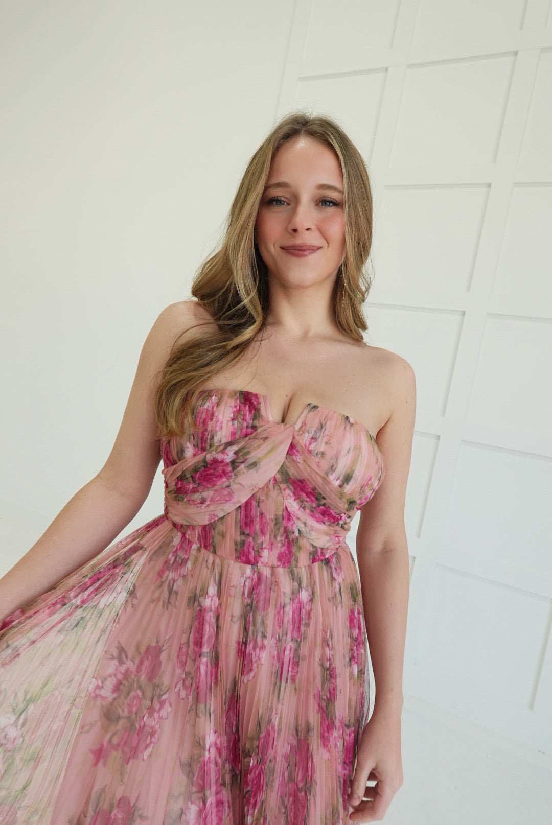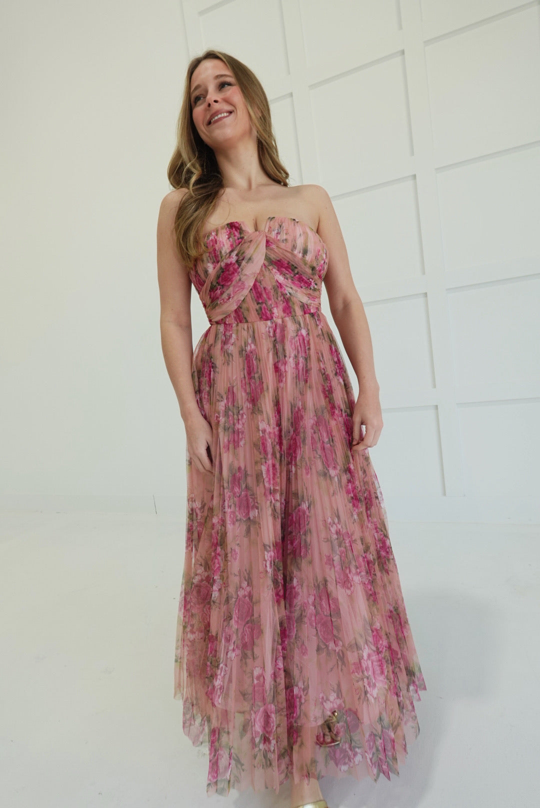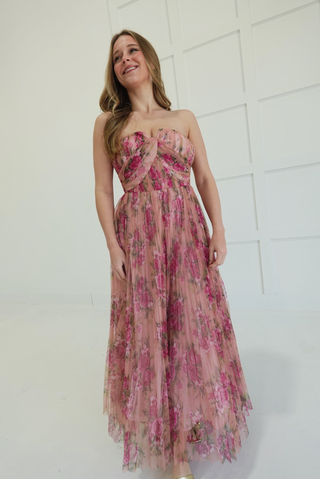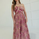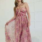 Ophelia commands attention with her bold floral print mesh overlay and daring strapless silhouette. Pleated layers create movement and dimension, while the maxi length delivers sophisticated drama. This is a dress that refuses to blend in—perfect for those ready to make a statement at any occasion. Effortlessly elegant with an edge.
