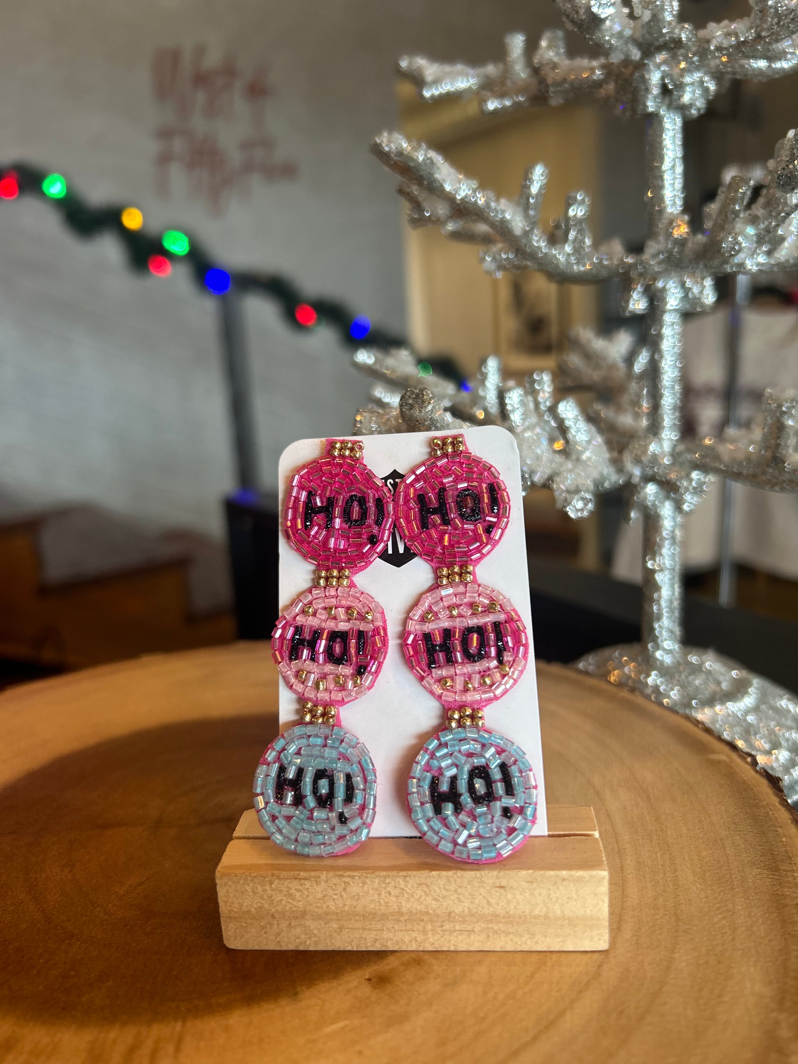 Deck the halls with audacious style. These seed bead ornament trio drop earrings feature three festive baubles suspended in a bold "ho ho ho" design that refuses to play it safe. Hand-crafted with intricate beadwork, they dangle with playful movement and holiday spirit. Perfect for anyone who wants their Christmas cheer to make a statement—unapologetic, eye-catching, and undeniably fun.