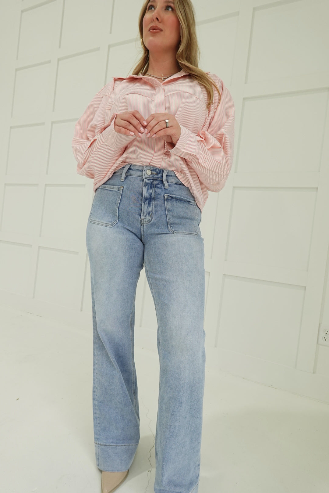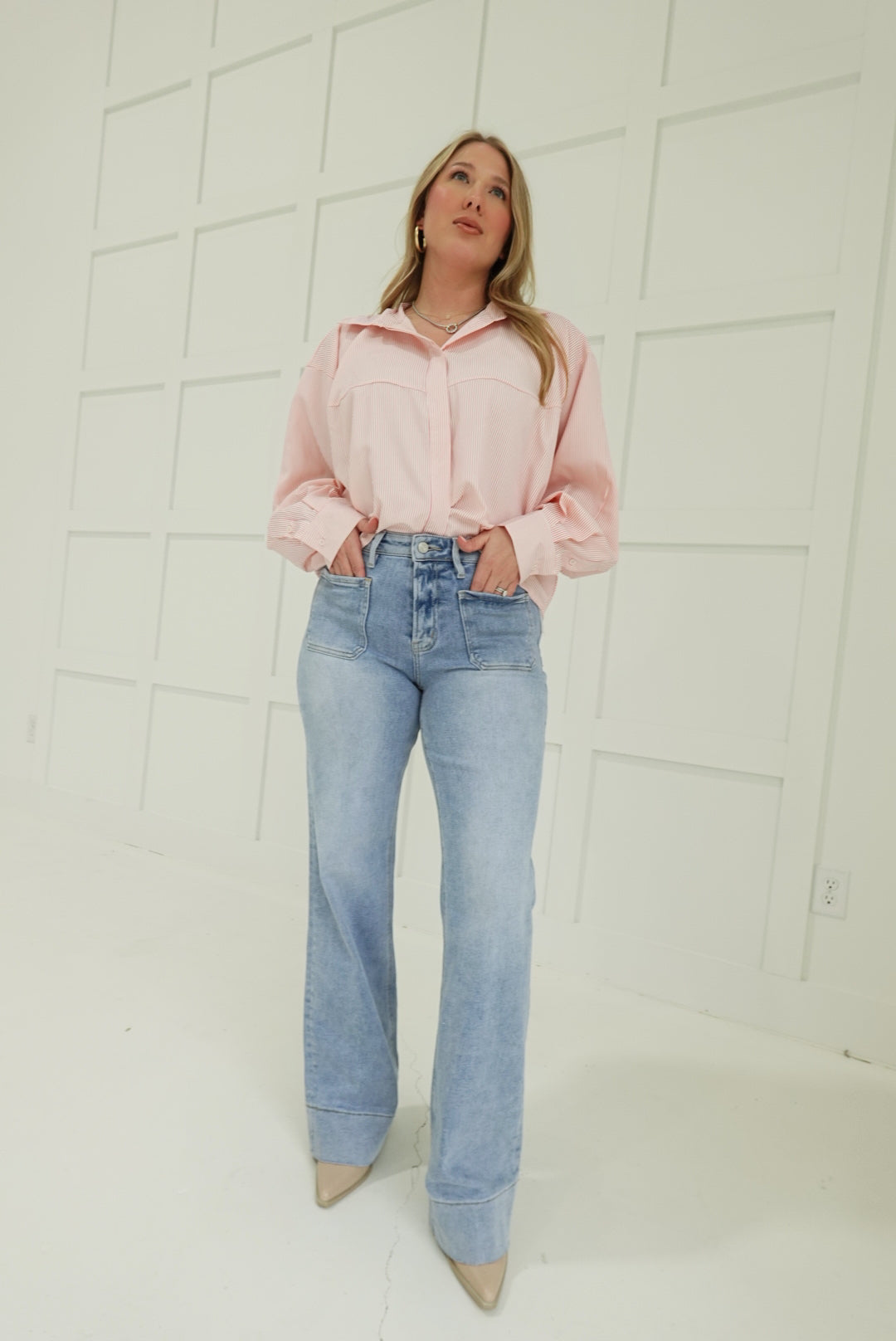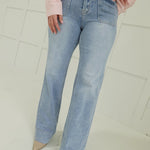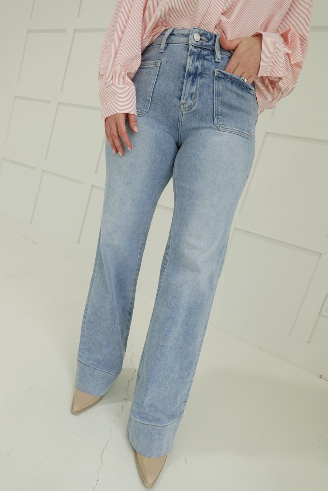 Pardon Me Trouser Jeans Vintage-inspired high-rise flares that command attention. These statement jeans feature a bold silhouette with a flattering front patch pocket, designed for those who refuse to blend in. The high-rise cut elongates your frame while the flared hem makes a confident stride. Perfect for channeling retro cool with a modern edge—pair with anything from crop tops to oversized blazers and own the room.