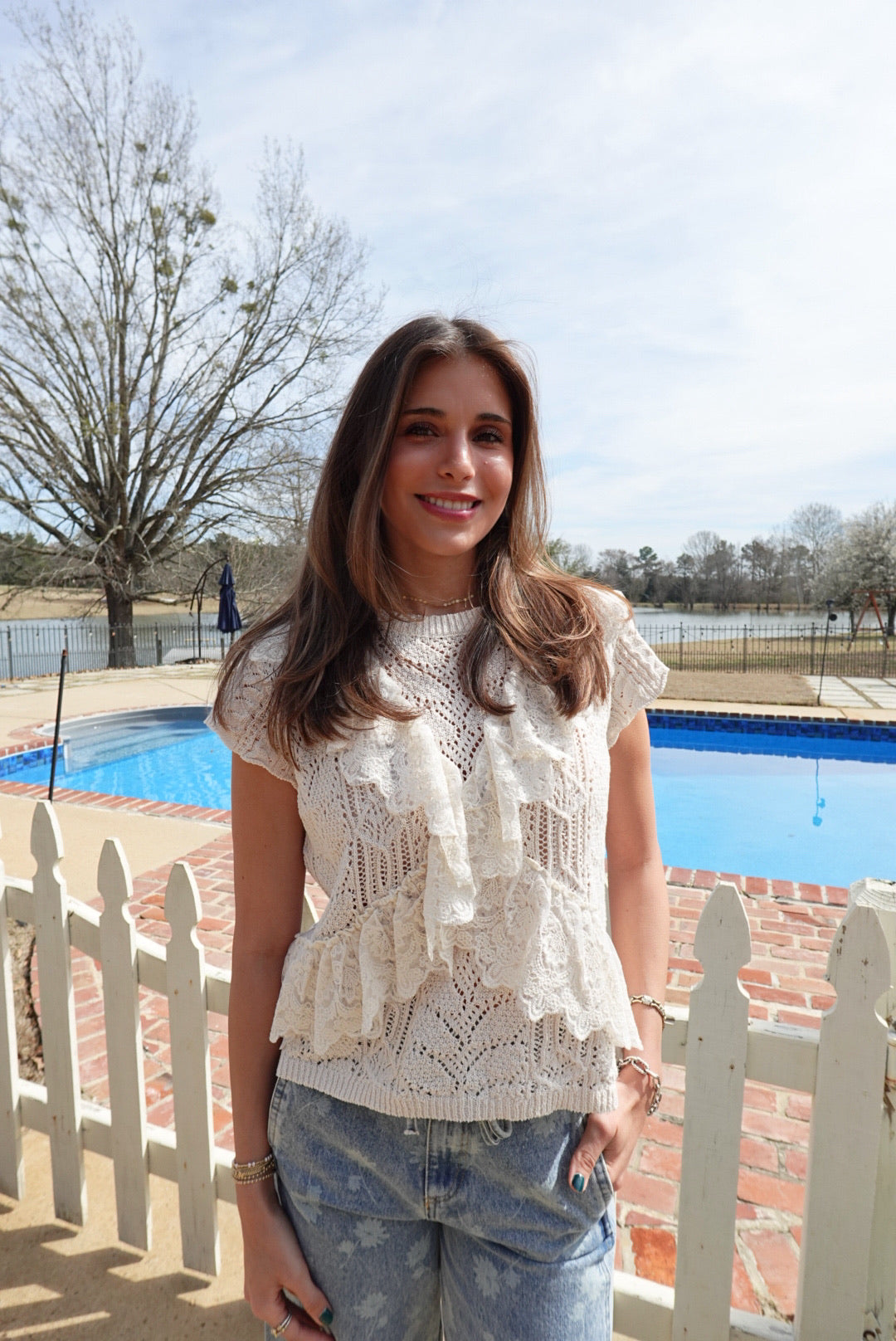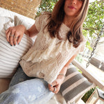 - Crochet-Style Sweater Top With Lace Trim Detail