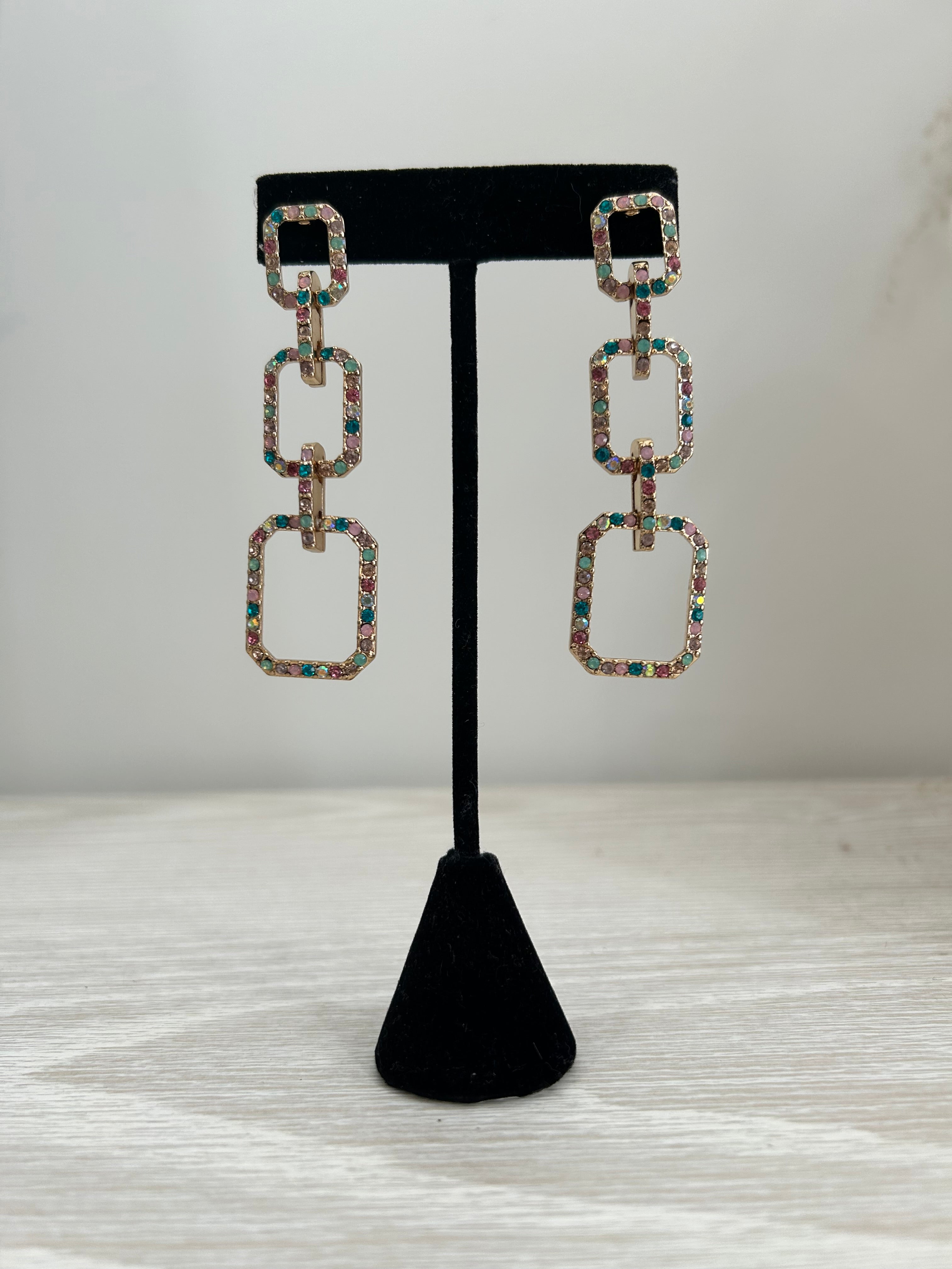 Create a vibrant addition to your jewelry collection with these multicolor pave linked hoop earrings. Each link is adorned with shimmering stones in a variety of colors, adding a playful yet refined touch to your look. Lightweight and comfortable, these earrings effortlessly elevate both casual and dressy outfits, making them a versatile choice for any occasion. Enjoy a blend of color and sparkle that complements your unique style.