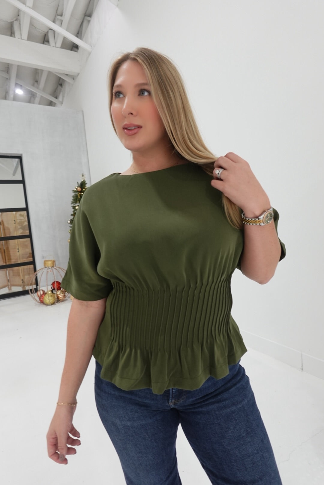 The Pave The Way Blouse in green features a flattering boat neck and comfortable short sleeves, offering a stylish yet easy-to-wear option for your wardrobe. Its versatile design makes it perfect for both casual days and more polished occasions, helping you look and feel confident throughout your day.