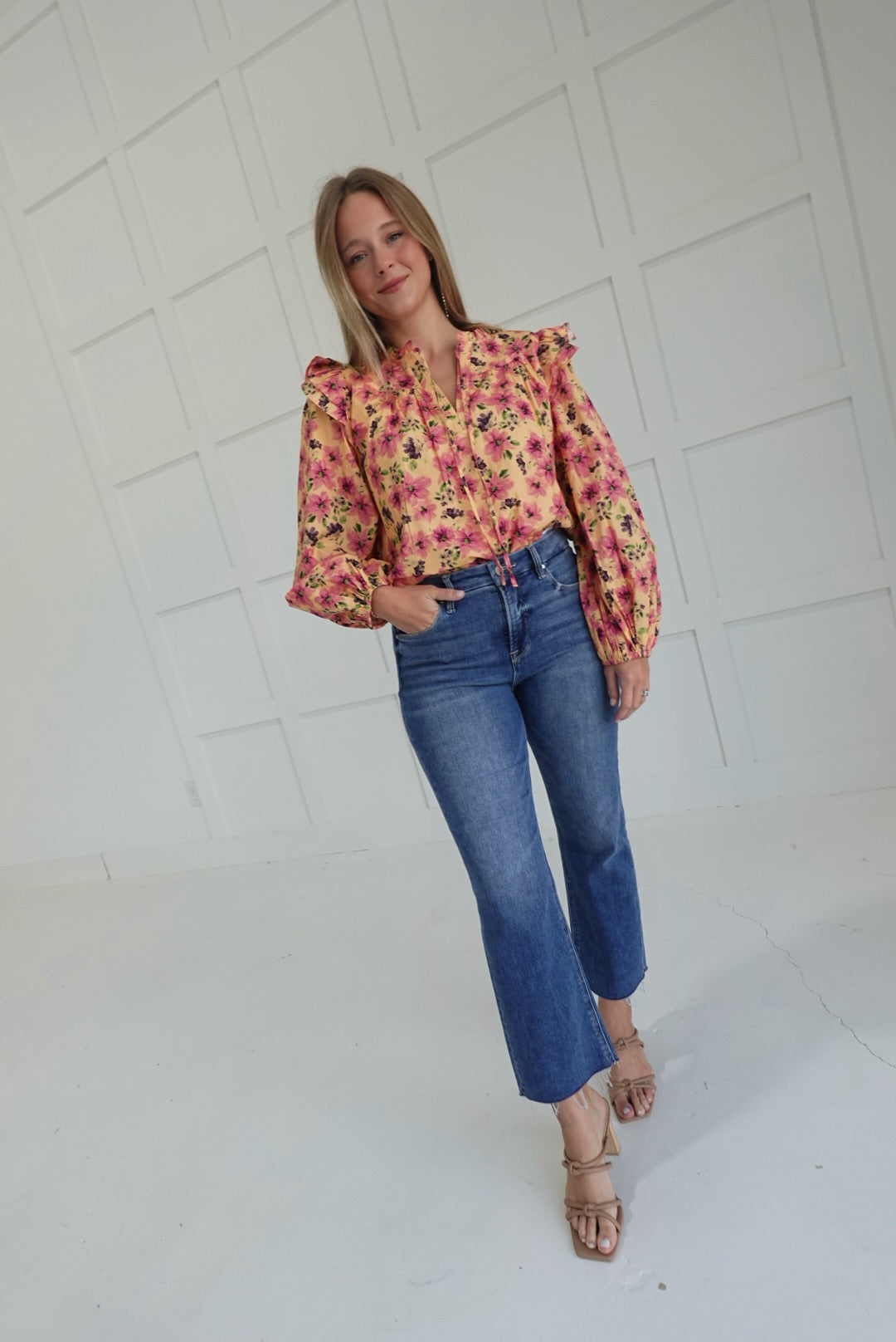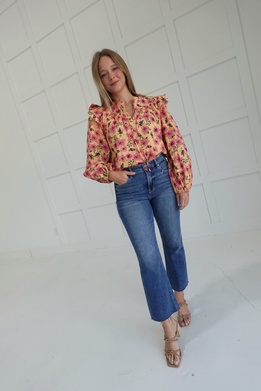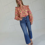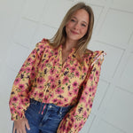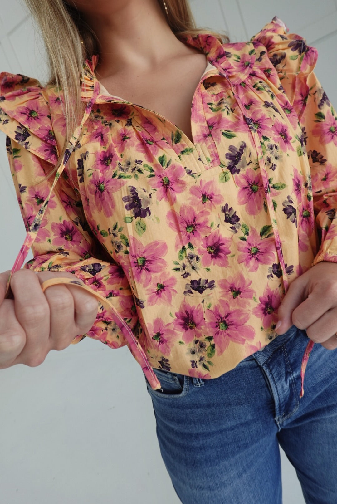 The Peachy Perfection Blouse combines delicate floral prints with charming ruffle details for a feminine touch. Its notched V neckline with a tying closure and ruffled shoulders enhance its graceful design, while long puff sleeves with elastic cuffs provide comfort and style. The relaxed bodice ensures a flattering fit that moves with you, making this blouse a versatile and comfortable choice for any occasion. Feel confident and effortlessly elegant every time you wear it.