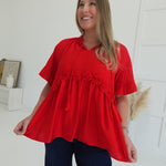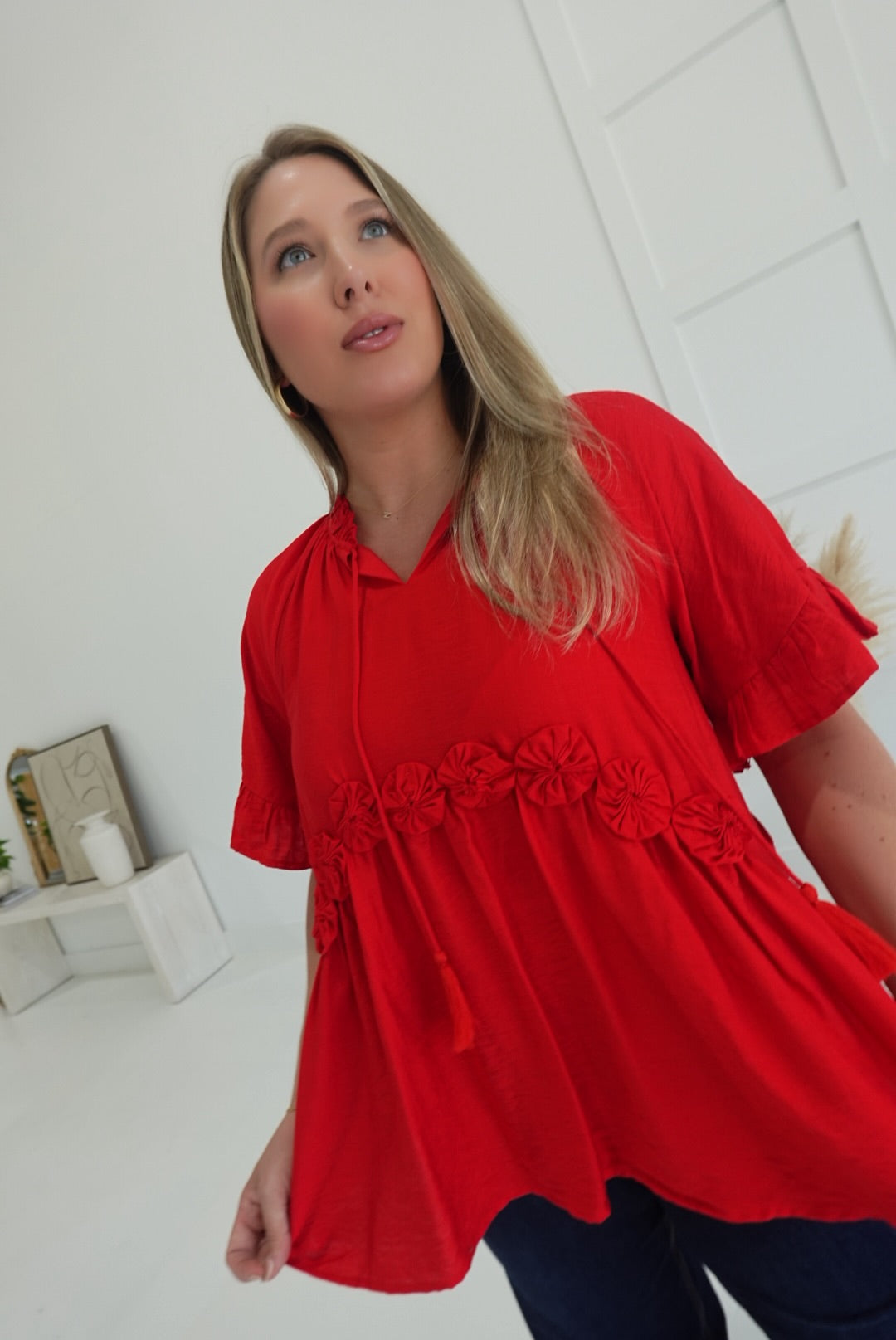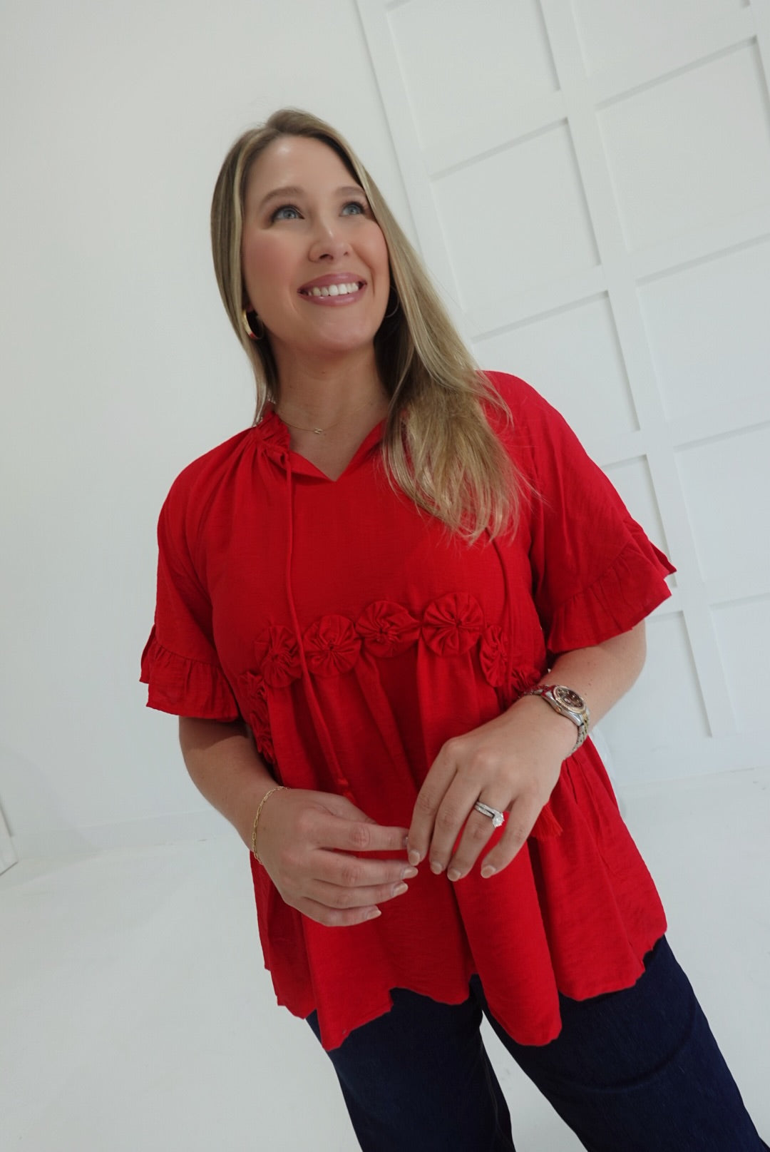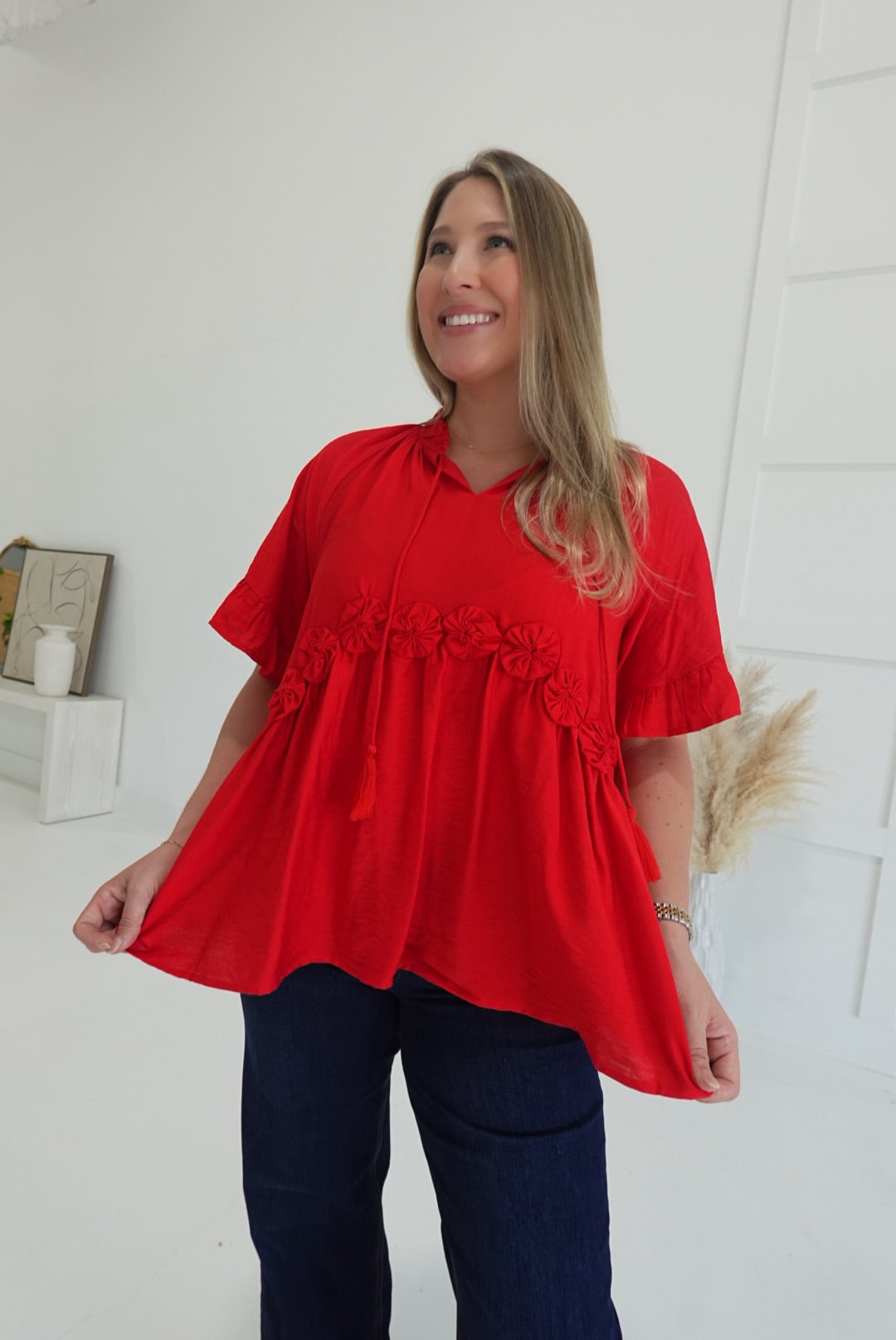 The Peppa Rosette Blouse features a charming tassel neck tie and delicate rosette details at the front waist, adding a touch of elegance to your look. Its short ruffle sleeves offer a feminine flair while keeping you comfortable throughout the day. Perfect for dressing up or down, this blouse supports your style with subtle sophistication and effortless grace.