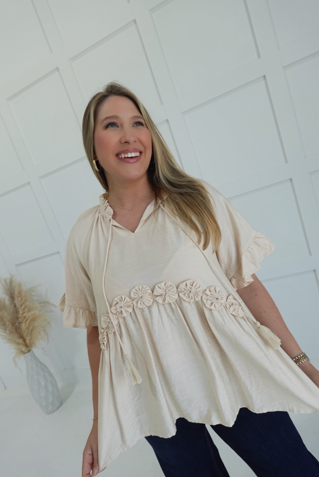 The Peppa Rosette Blouse features a charming tassel neck tie and delicate rosette details at the front waist, adding a touch of elegance to your look. Its short ruffle sleeves offer a feminine flair while keeping you comfortable throughout the day. Perfect for dressing up or down, this blouse supports your style with subtle sophistication and effortless grace.