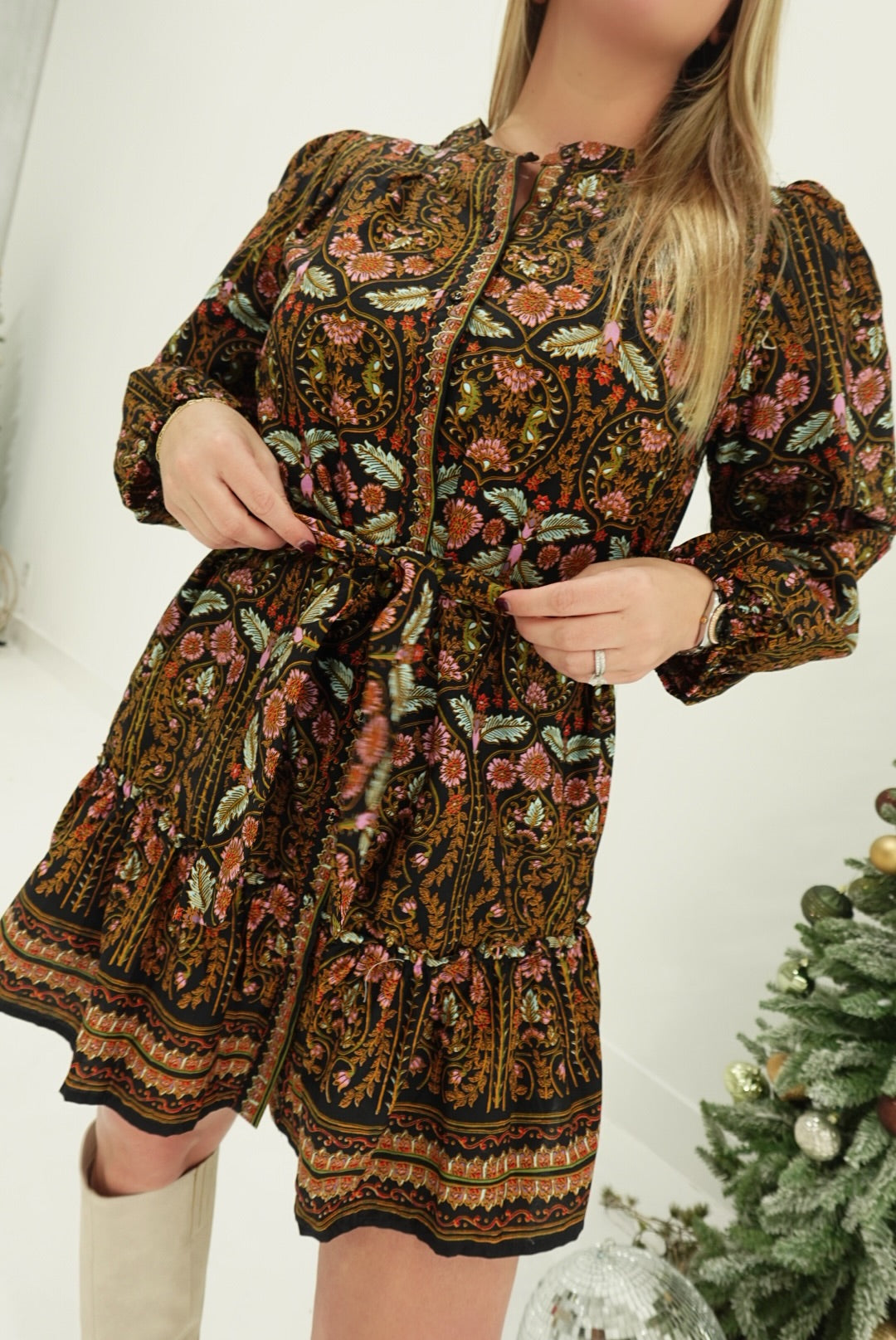 Elevate your everyday style with the Persona Mini Dress, a charming floral print button-down that combines classic elegance with modern versatility. The fitted silhouette is beautifully defined by an adjustable belt, creating a flattering shape that works for any occasion. From casual brunches to evening outings, this dress transitions seamlessly through your day. The button-down front offers easy styling options, while the mini length keeps things fresh and contemporary. Perfect for those who appreciate timeless pieces with a feminine touch.