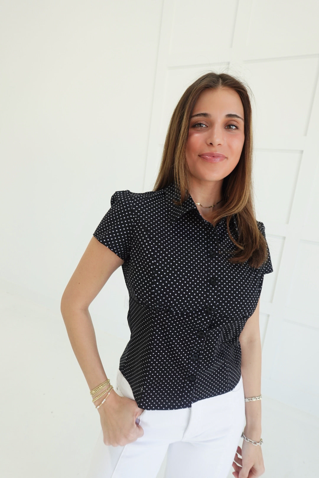 Fearless femininity meets everyday versatility in the Phoebe Top. This stretch woven shirt commands attention with its bold dot print and architectural back smocking—a daring detail that transforms a classic silhouette into something unforgettable. Cap sleeves and a button-down front keep it polished and practical, while the structured fabric moves with you. Perfect for those who refuse to blend in.