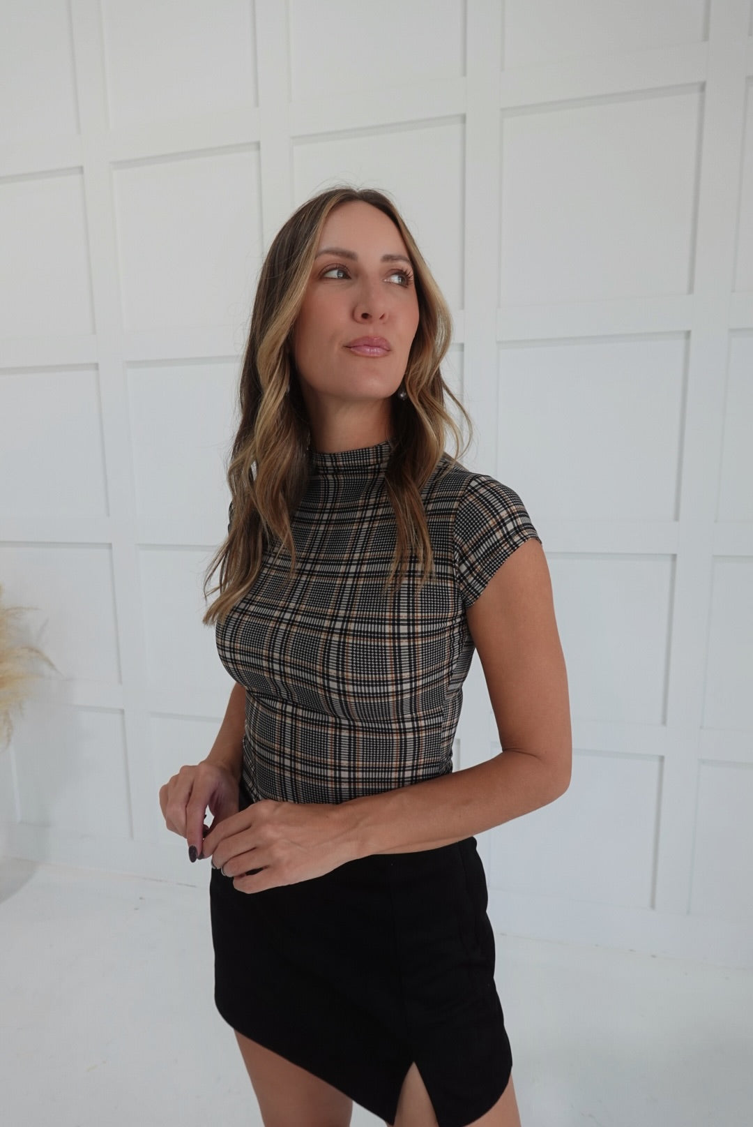 - Mock neck plaid top