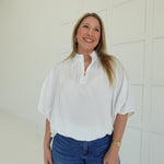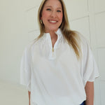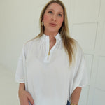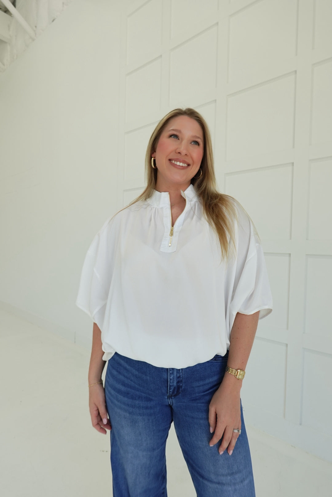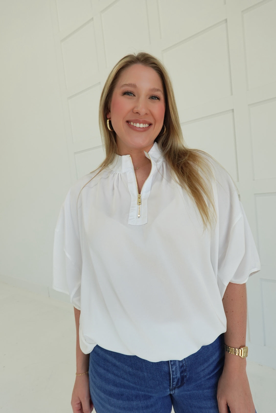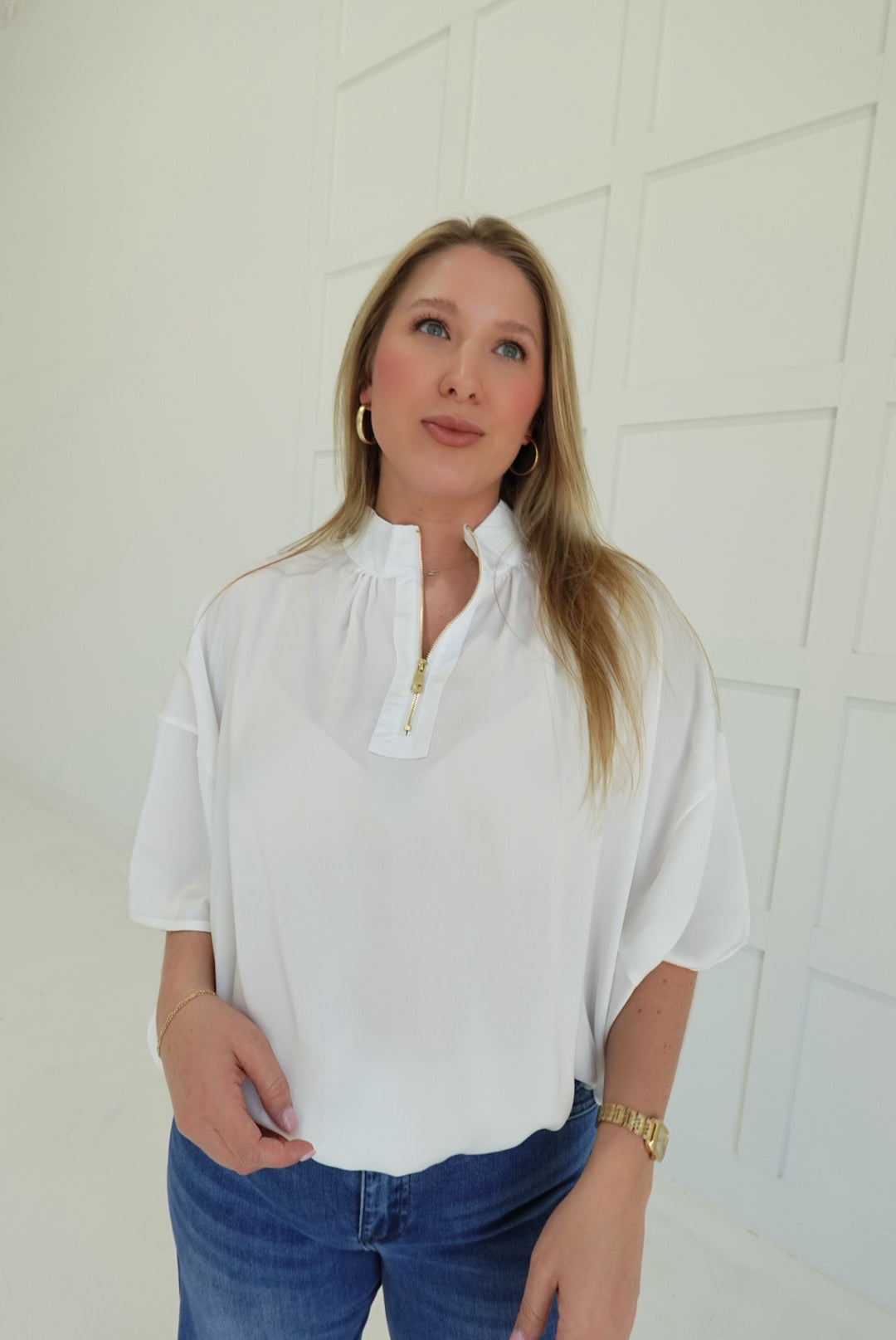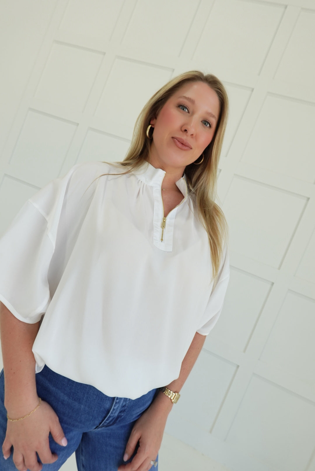 Elevate your everyday with this daring satin blouse that refuses to play it safe. The cream hue strikes that perfect balance between bold and wearable, while the half-zip neckline adds an unexpected edge—zip it up for polished sophistication or leave it open for effortless cool. Elbow-length sleeves keep things refined without sacrificing movement. Crafted in luxe satin, it drapes beautifully and catches the light just right. Layer it, tuck it, or wear it solo. This is the piece that transforms a basic outfit into something unforgettable.