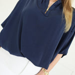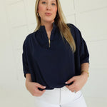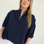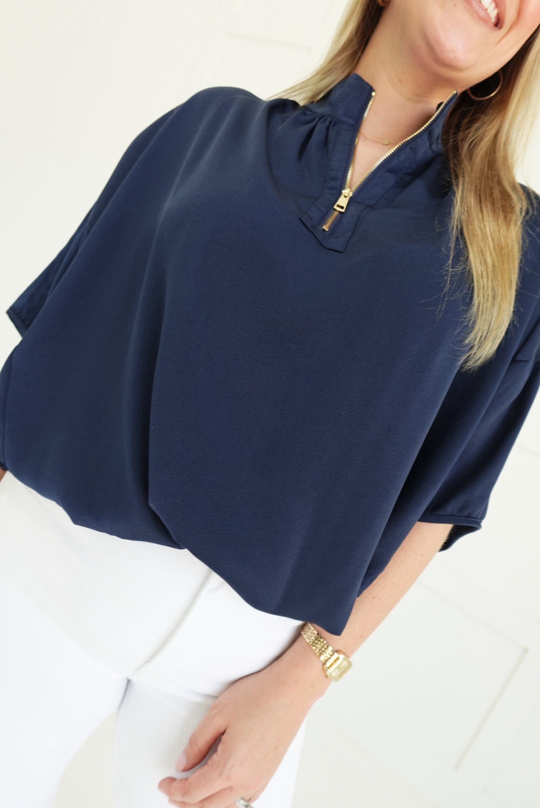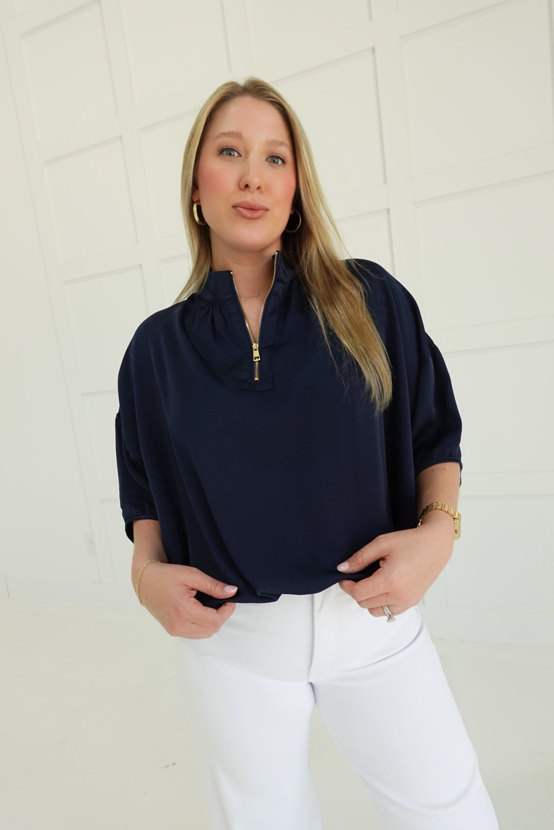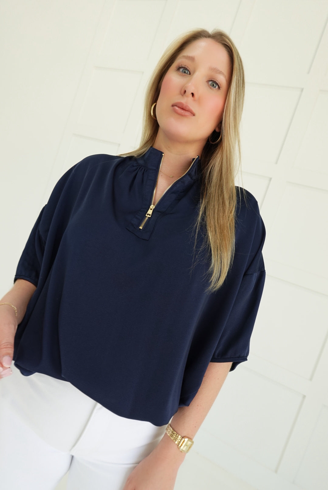 Elevate your everyday with this daring satin blouse that refuses to play it safe. The navy hue strikes that perfect balance between bold and wearable, while the half-zip neckline adds an unexpected edge—zip it up for polished sophistication or leave it open for effortless cool. Elbow-length sleeves keep things refined without sacrificing movement. Crafted in luxe satin, it drapes beautifully and catches the light just right. Layer it, tuck it, or wear it solo. This is the piece that transforms a basic outfit into something unforgettable.