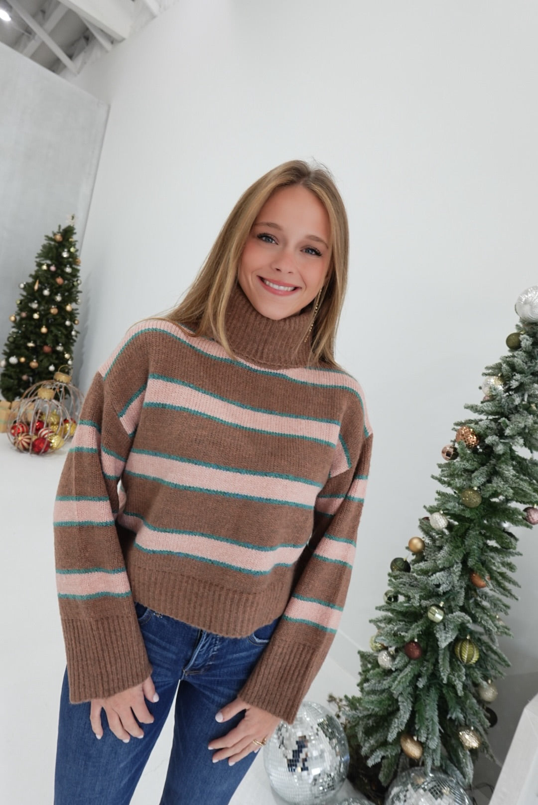 Embrace timeless style with the Put To Test Sweater in a sophisticated brown combo stripe. This classic turtleneck delivers warmth and versatility, perfect for layering through cooler months or wearing solo. The refined striped pattern adds visual interest while remaining effortlessly wearable with your everyday wardrobe. Quality construction ensures this piece becomes a reliable favorite you'll reach for season after season.