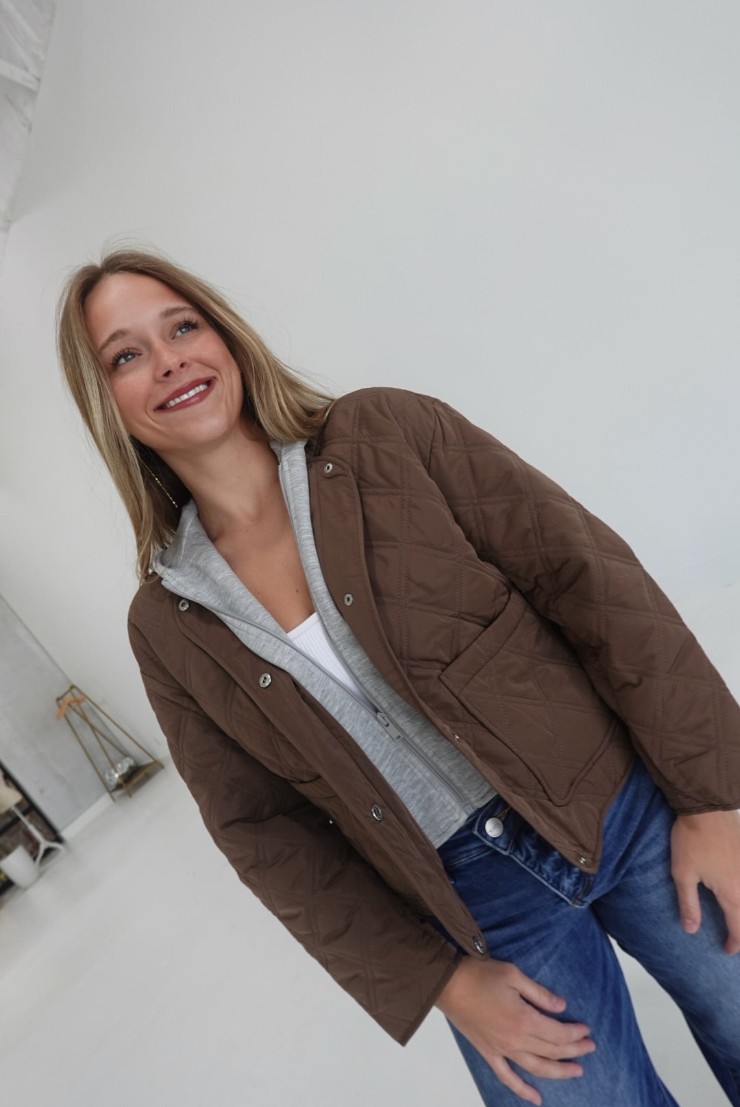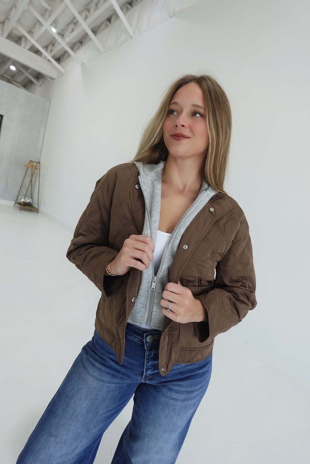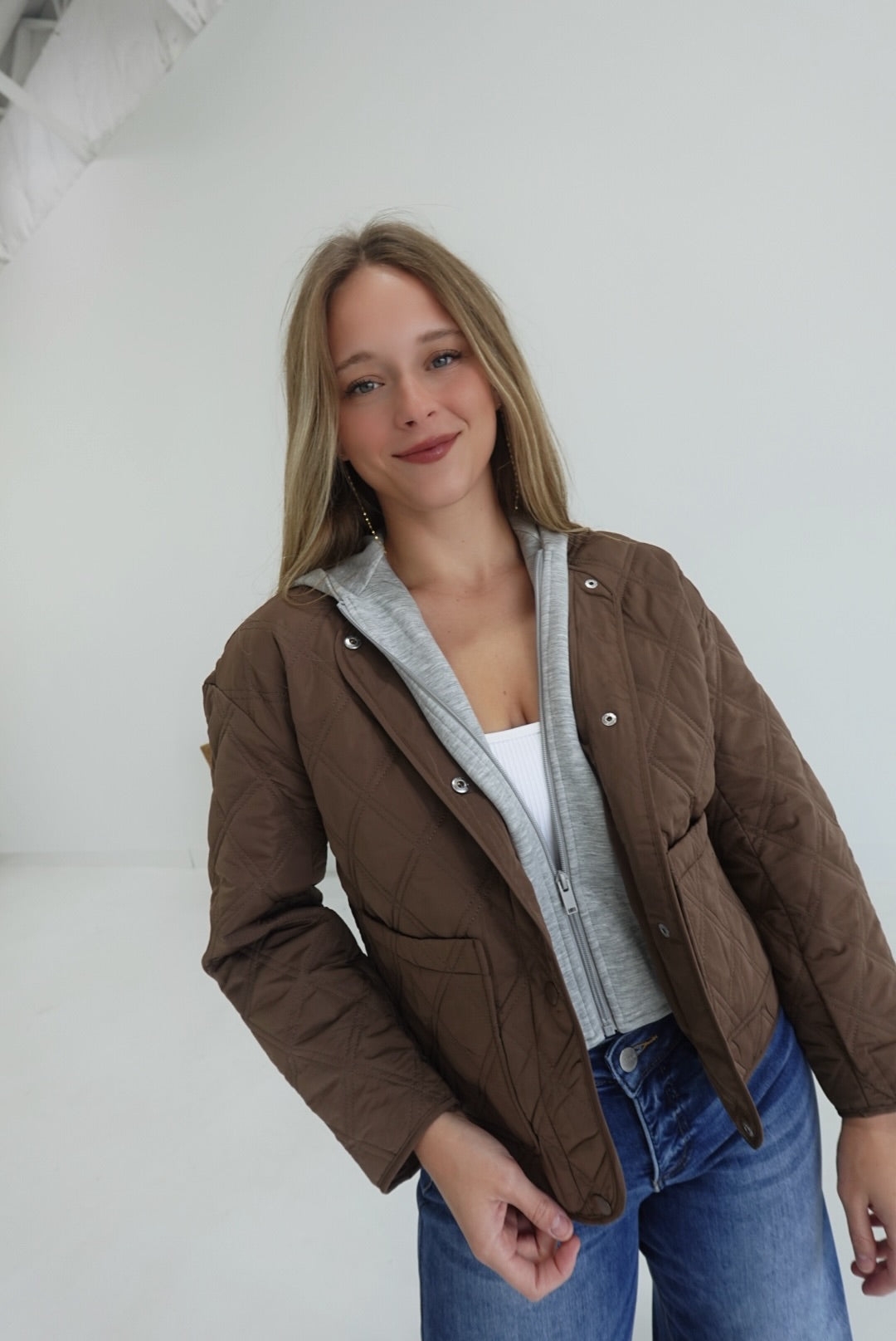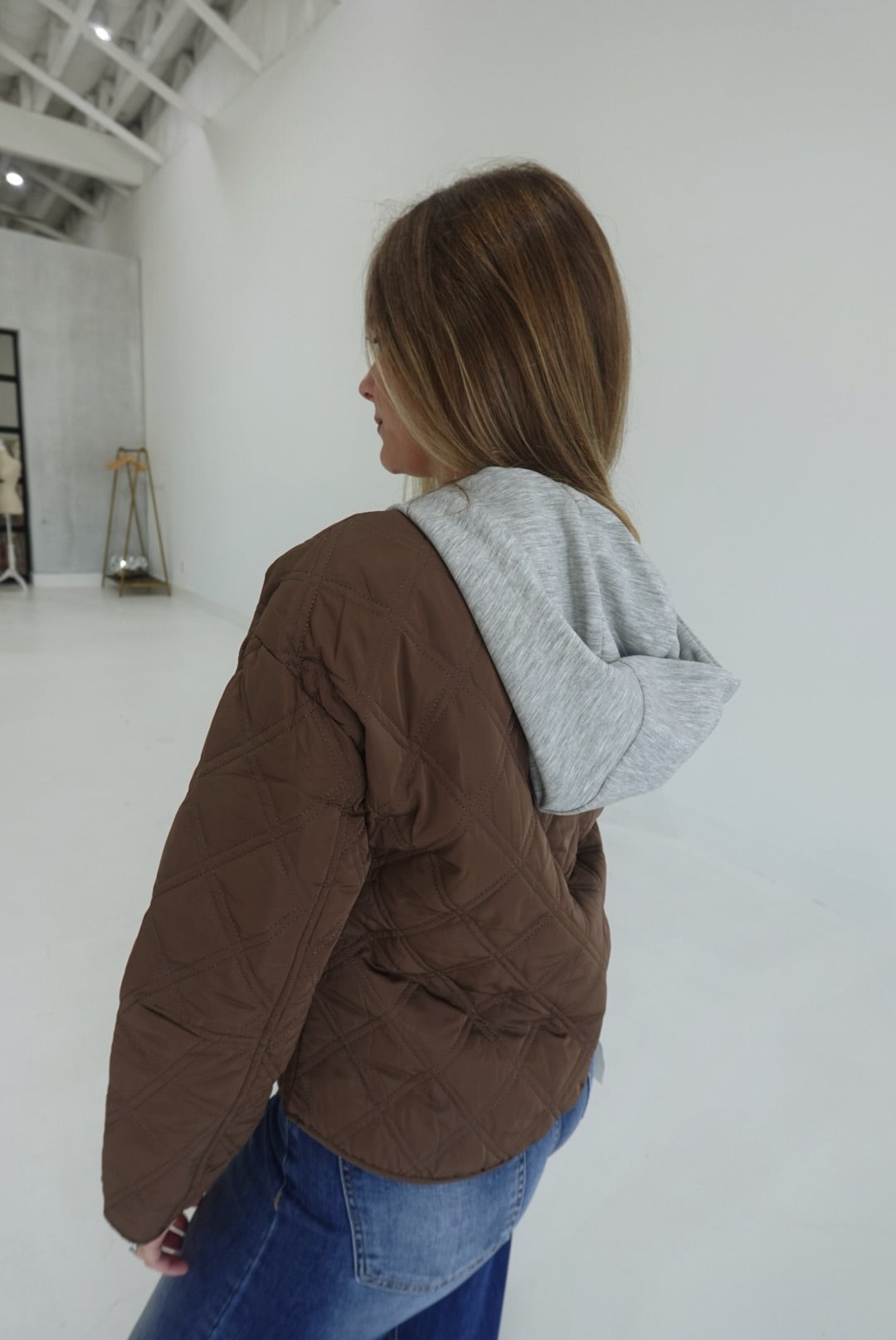 Stay comfortable and stylish in the Quilted Combo Jacket - Cocoa. Featuring a cozy hood and a striking contrast design, this jacket offers warmth and versatility for unpredictable weather. Its quilted construction provides lightweight insulation, while the combination of fabrics ensures both comfort and durability. Perfect for layering, it supports your everyday adventures with practical style and dependable protection.