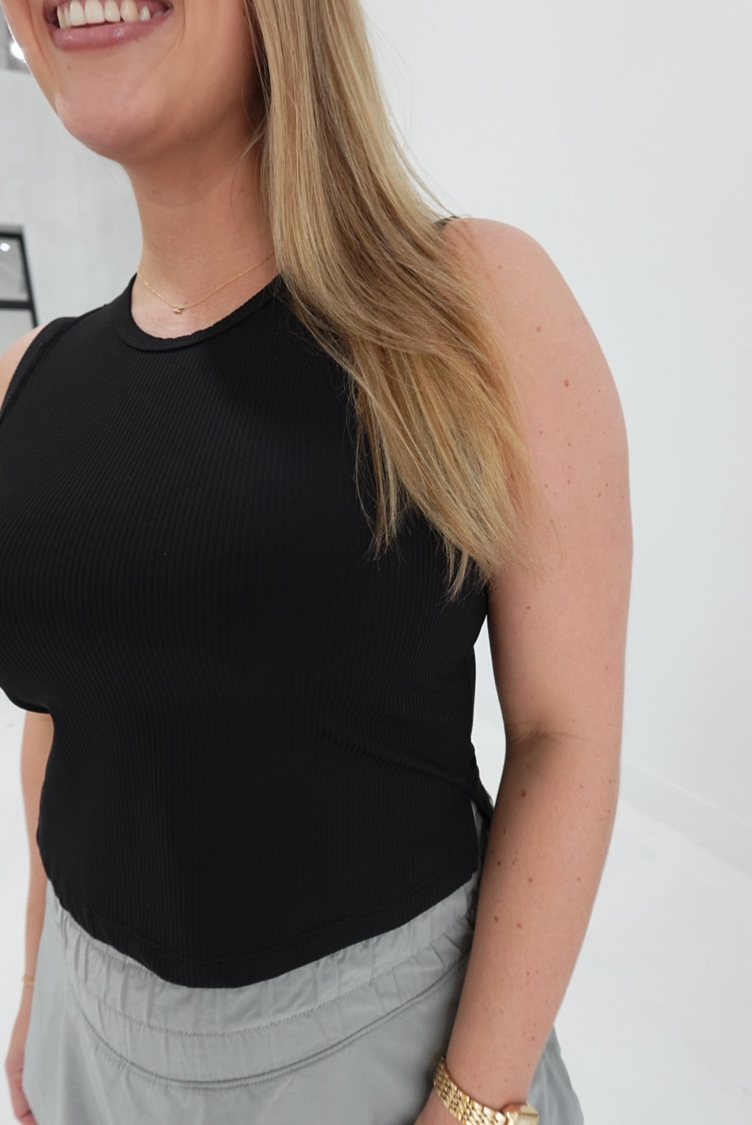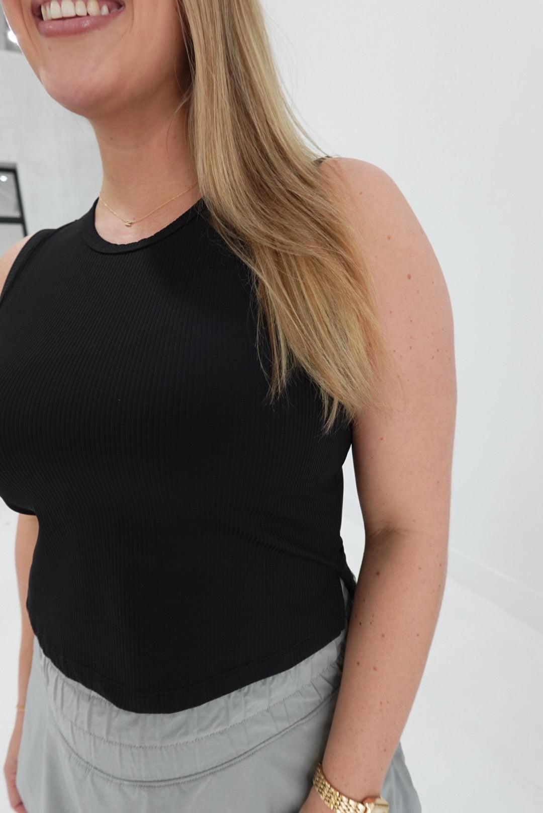 Elevate your workout wardrobe with this ribbed athletic top designed for comfort and performance. The textured ribbed fabric provides gentle support while allowing full freedom of movement, making it perfect for yoga, gym sessions, or everyday wear. The sleek black colorway pairs effortlessly with any athletic ensemble. Built to move with you, this versatile piece delivers the confidence and support you need to tackle any fitness goal.