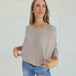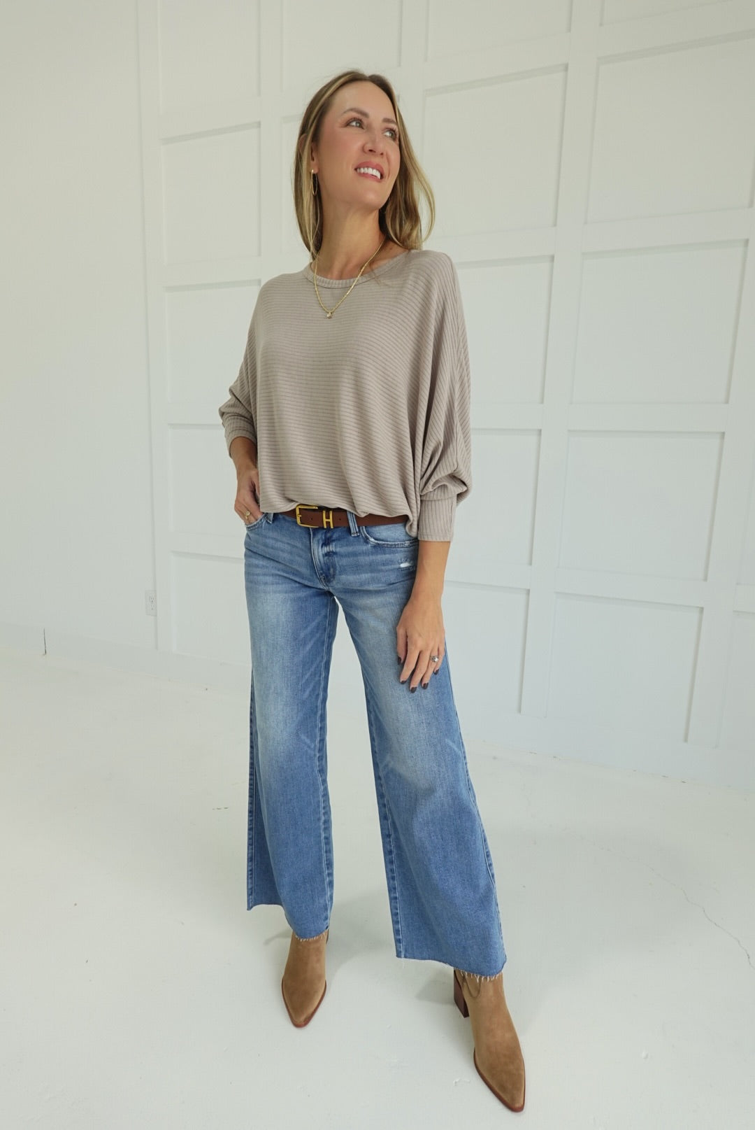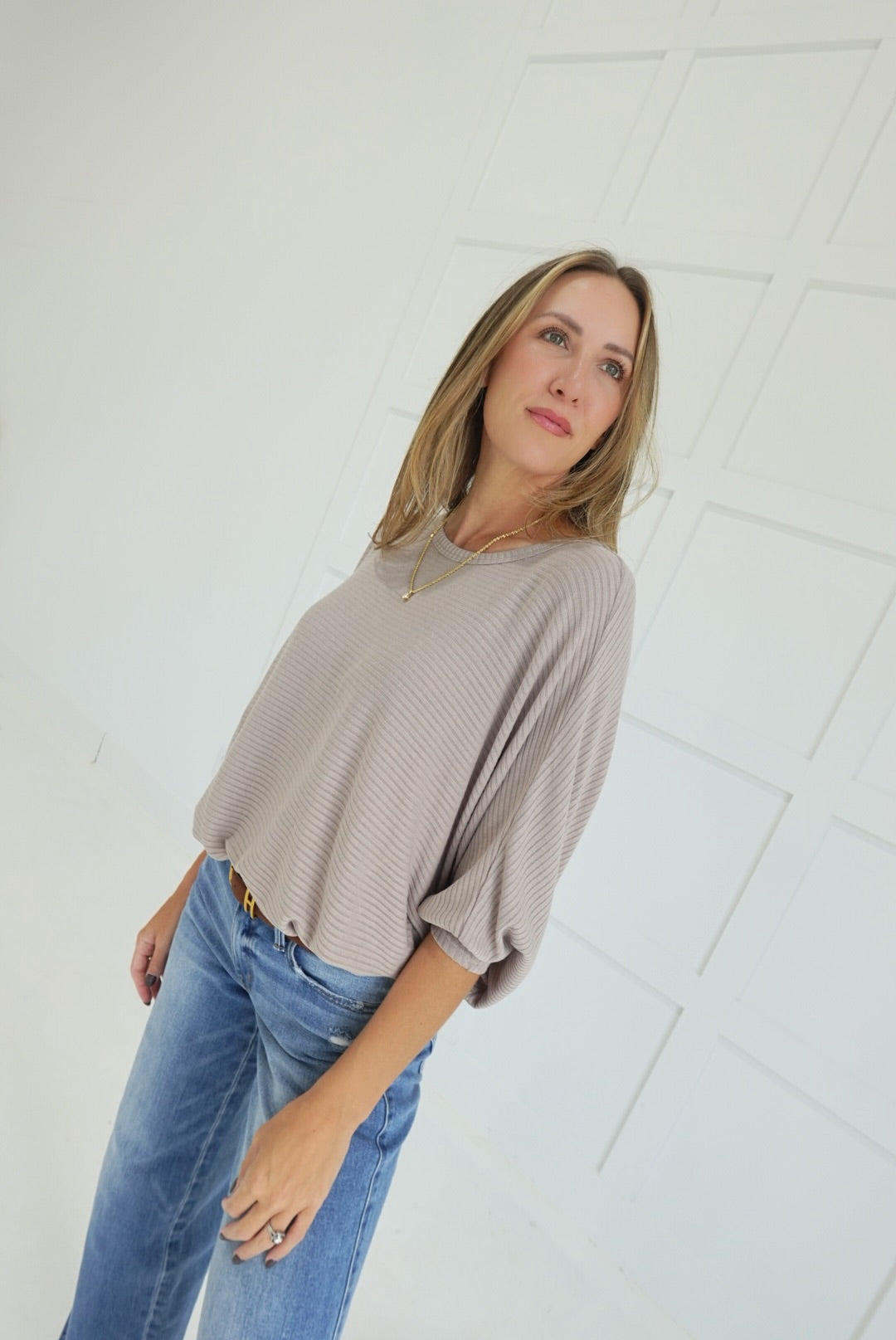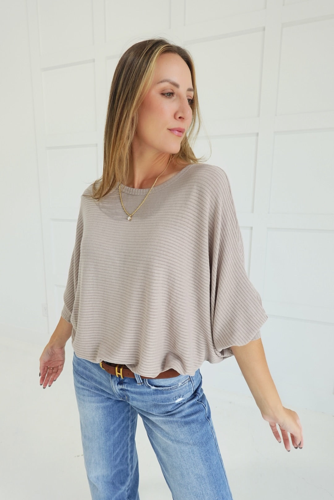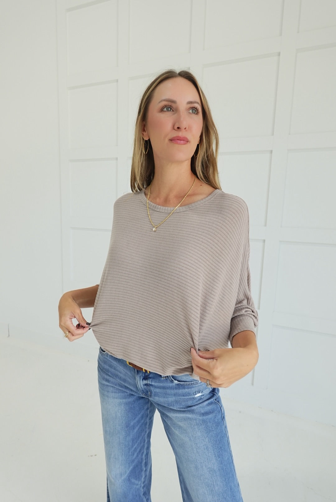 Stay comfortable and stylish in the Ribbed + Ready Top in Ash Mocha. Featuring a flattering boat neck and relaxed batwing sleeves, this ribbed sweater offers ease of movement and cozy warmth. Its soft fabric and thoughtfully designed fit make it an ideal choice for everyday wear, supporting your confidence with both comfort and subtle elegance.