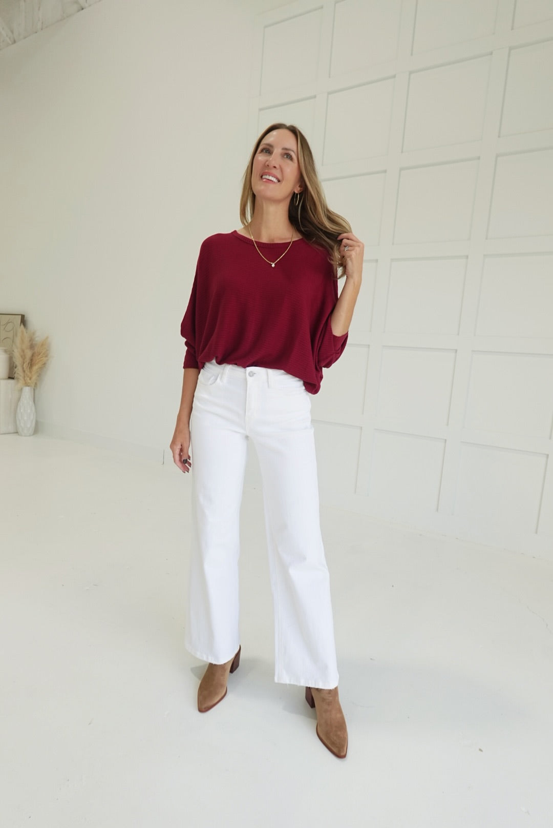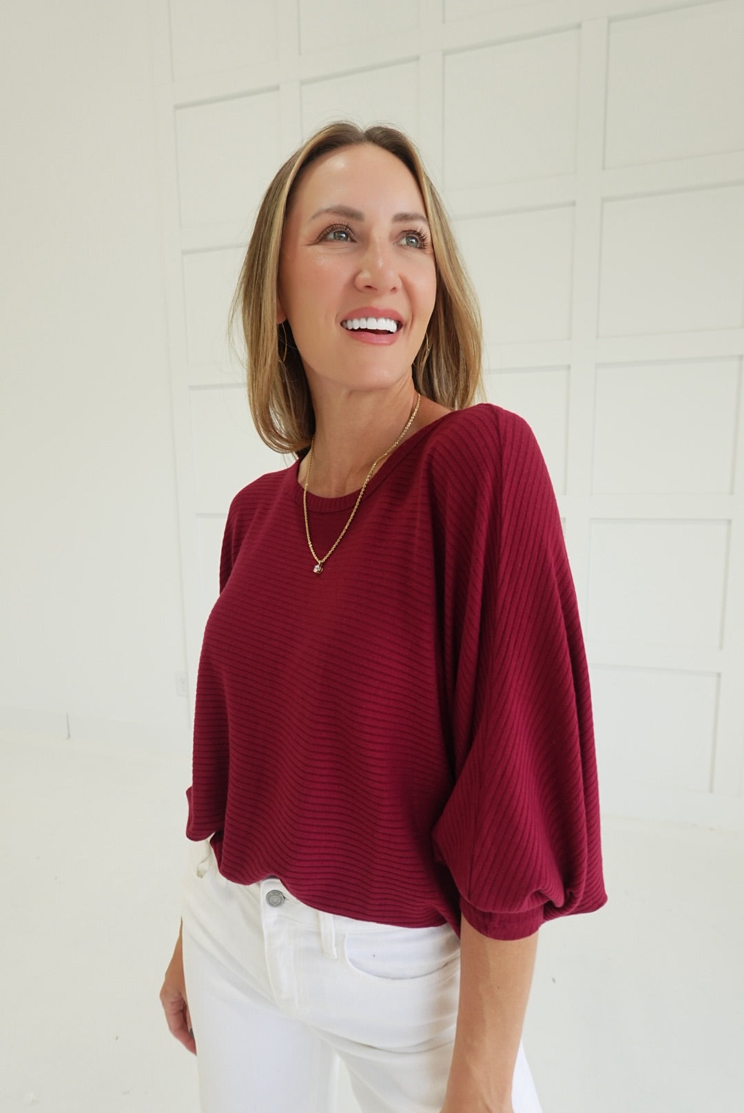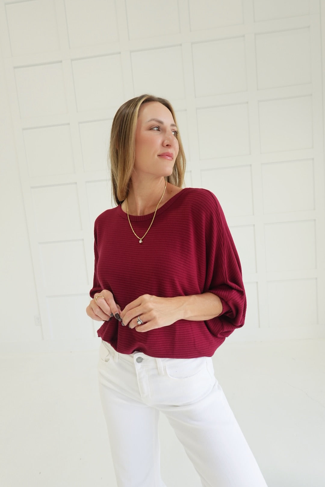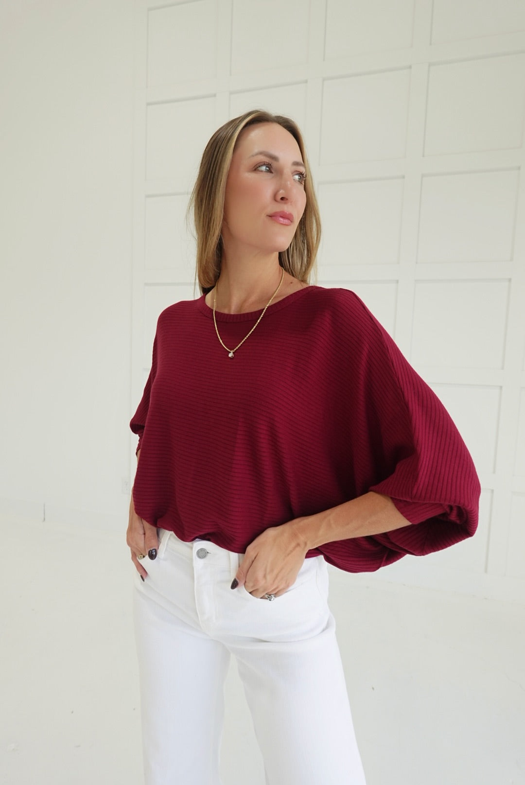 Stay comfortable and stylish in the Ribbed + Ready Top. Featuring a flattering boat neck and relaxed batwing sleeves, this ribbed sweater offers ease of movement and cozy warmth. Its soft fabric and thoughtfully designed fit make it an ideal choice for everyday wear, supporting your confidence with both comfort and subtle elegance.
