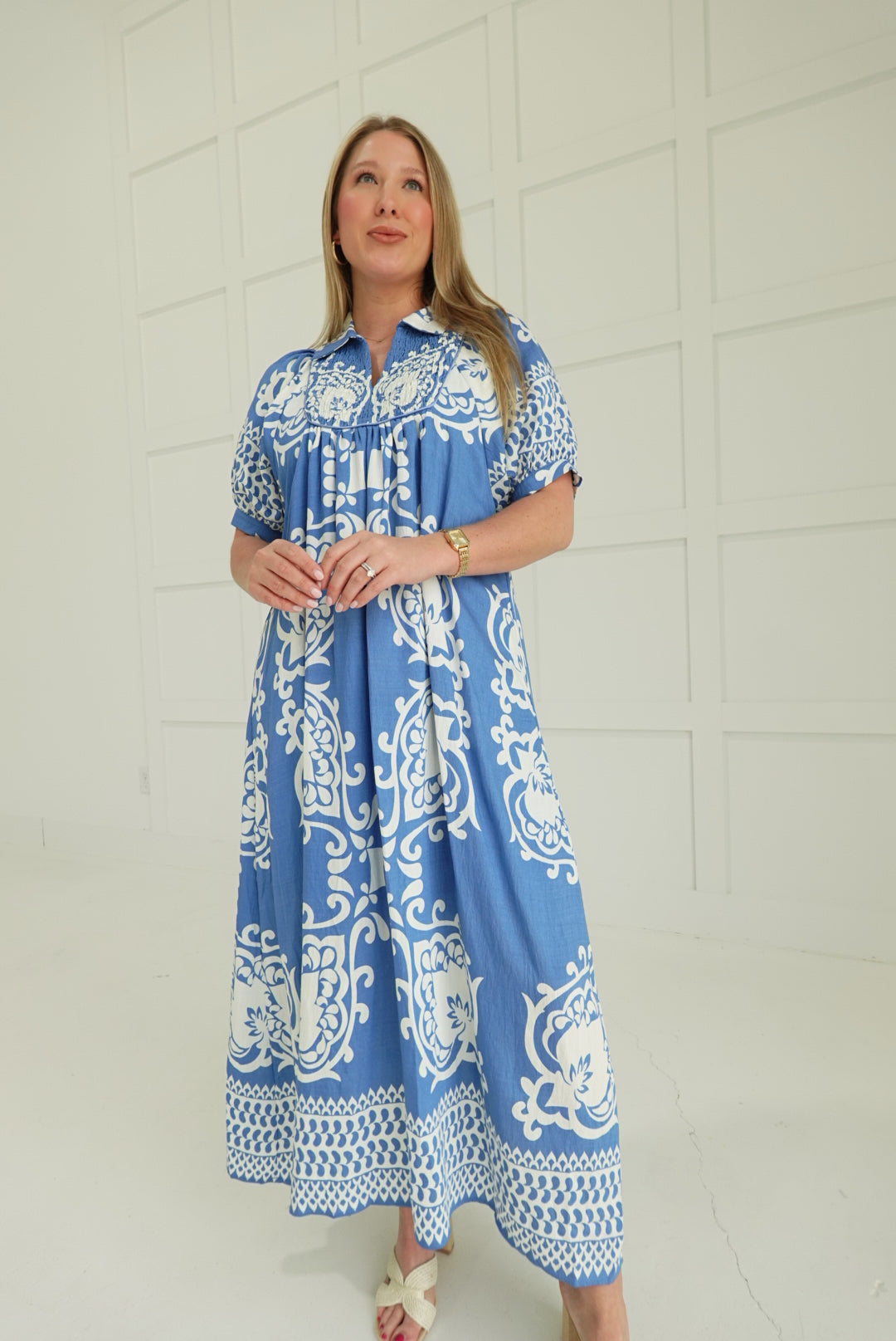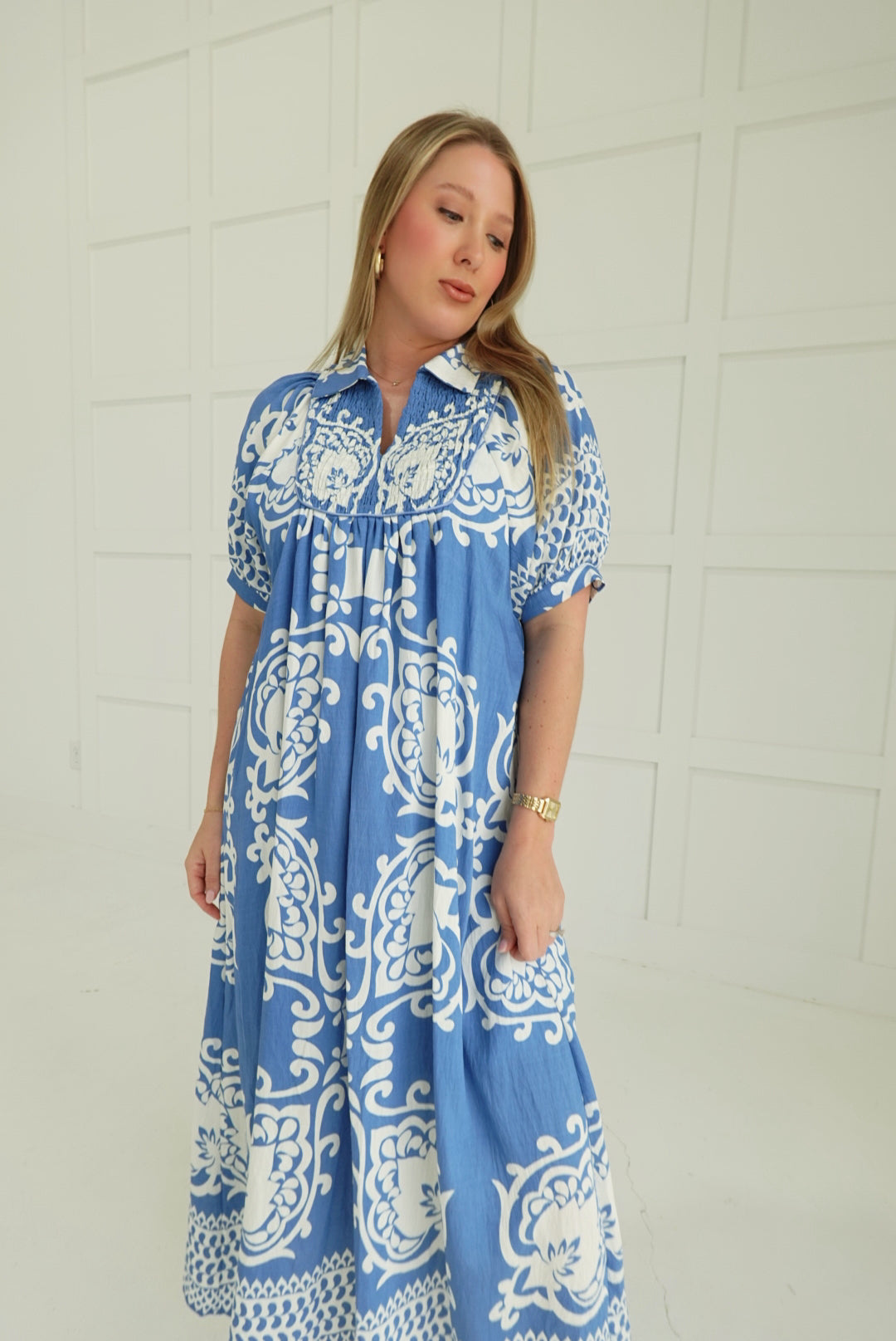 The Riviera Midi Dress commands attention with its bold mixed print design and architectural silhouette. Structured short puff sleeves frame the shoulders with understated drama, while the smocked front yoke creates dimensional texture and a flattering gathered effect at the bodice. The midi length offers sophisticated coverage without sacrificing edge. Perfect for those ready to make a statement—wear it to elevate an ordinary day or anchor an editorial-worthy evening look.