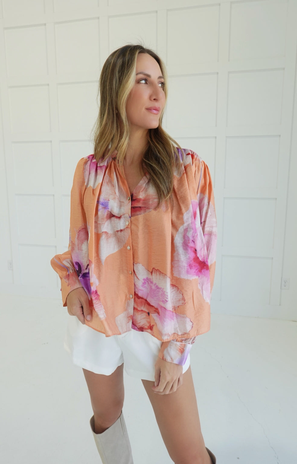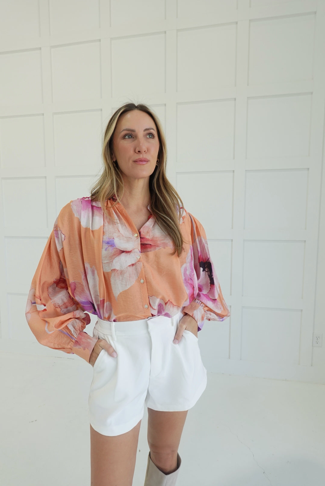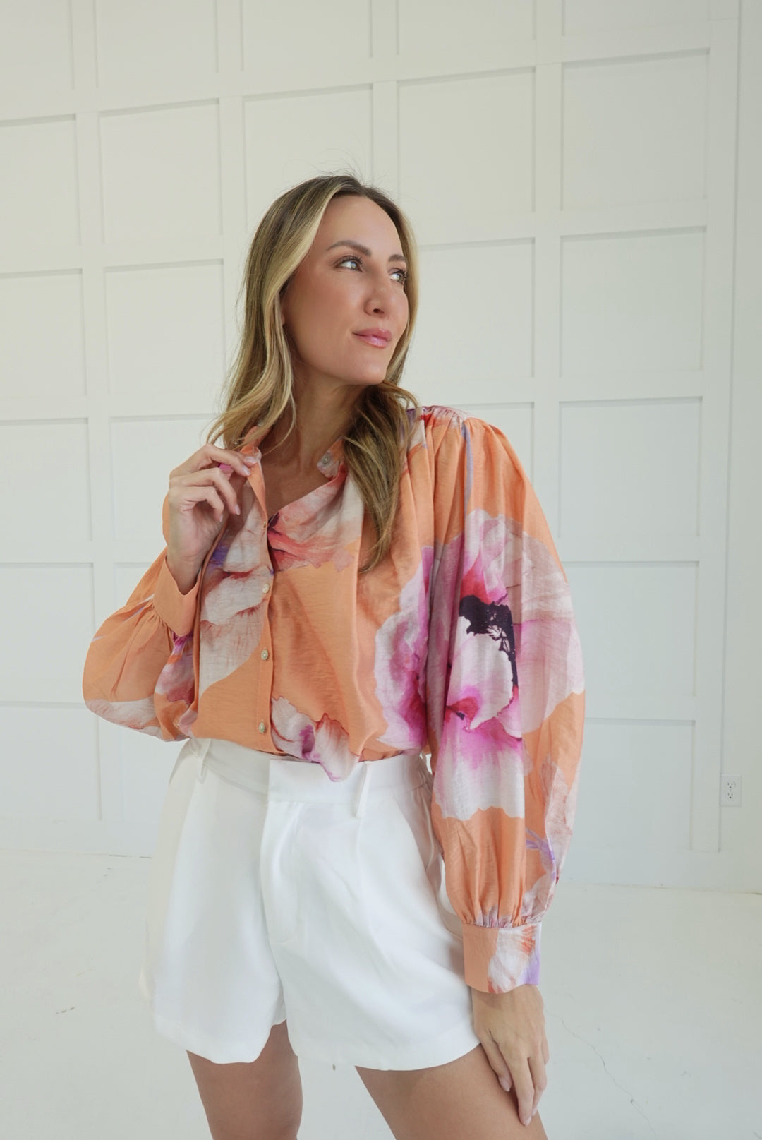 - Floral Button Down Blouse With Voluminous Sleeves