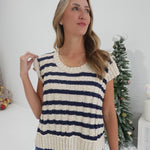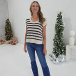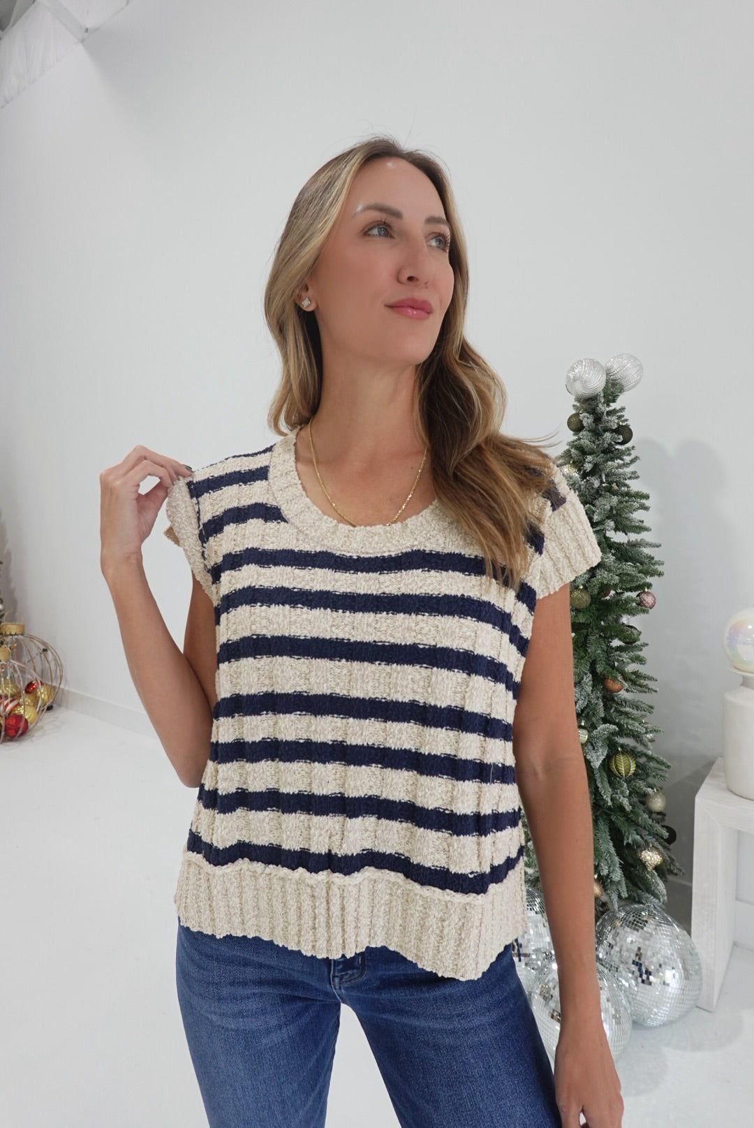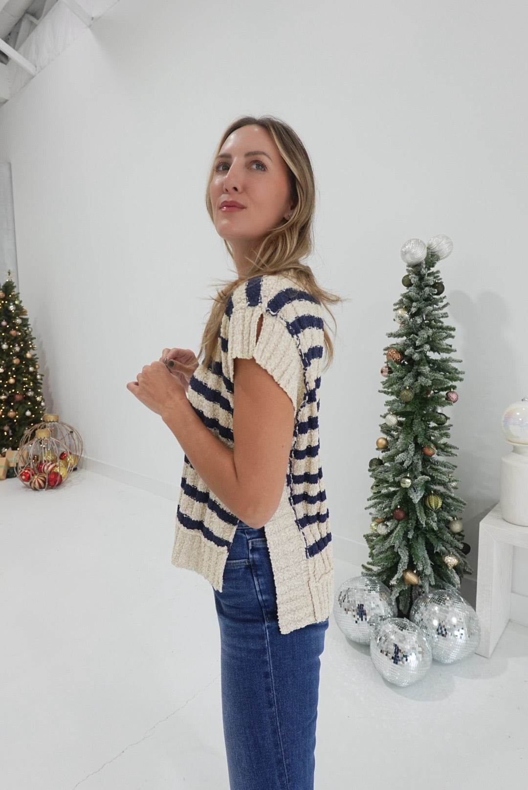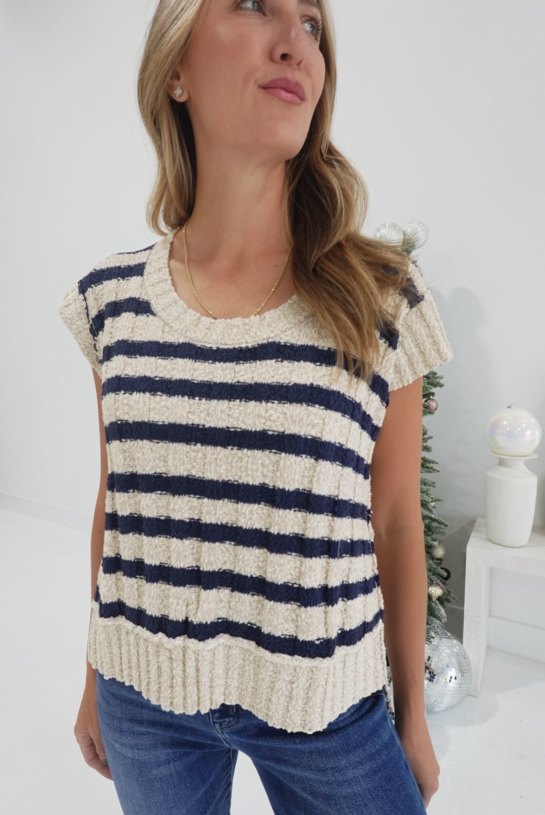 This lightweight striped knit short sleeve sweater in navy offers a comfortable fit that's perfect for layering or wearing on its own. Its breathable fabric keeps you cool while adding a stylish touch to your everyday wardrobe. Designed to move with you, it’s an easy choice for casual days when you want to feel cozy without overheating.