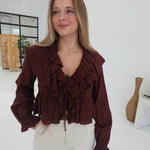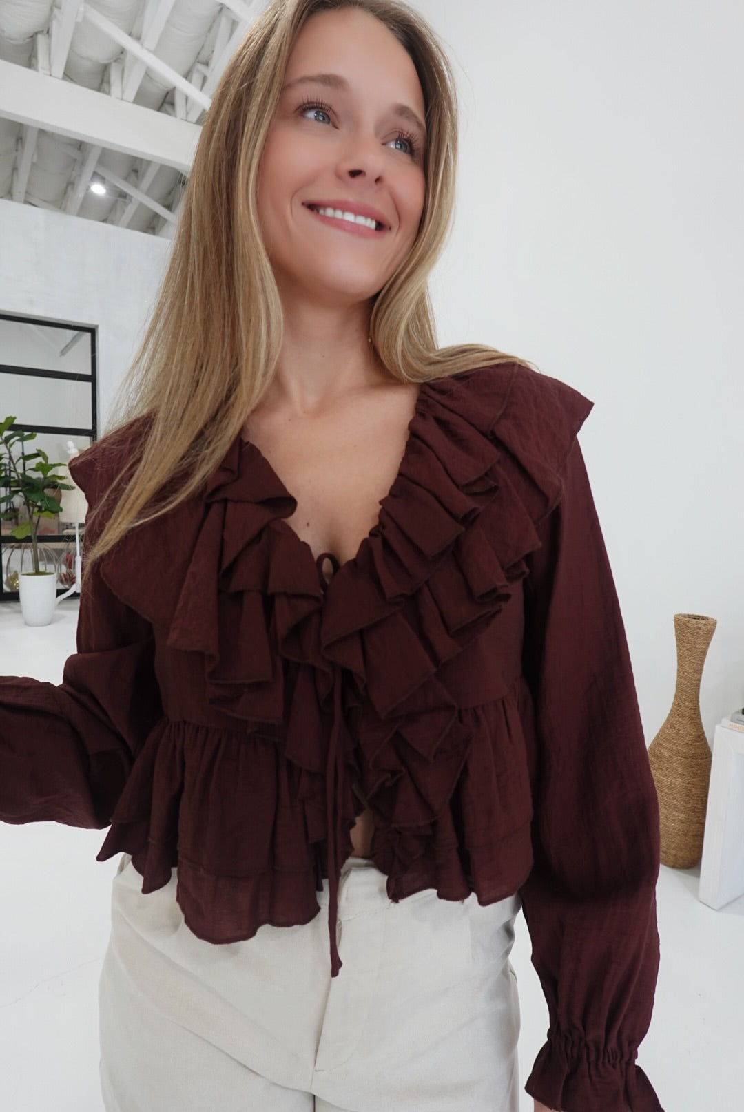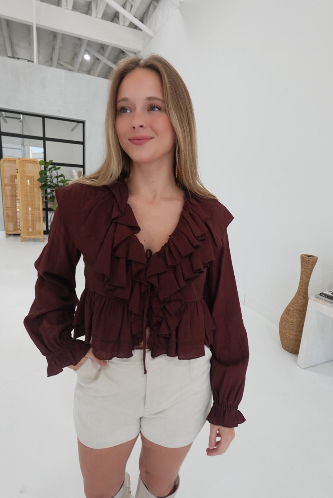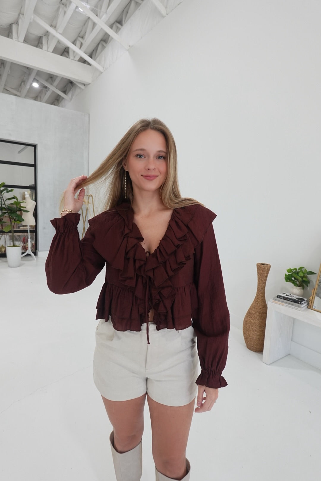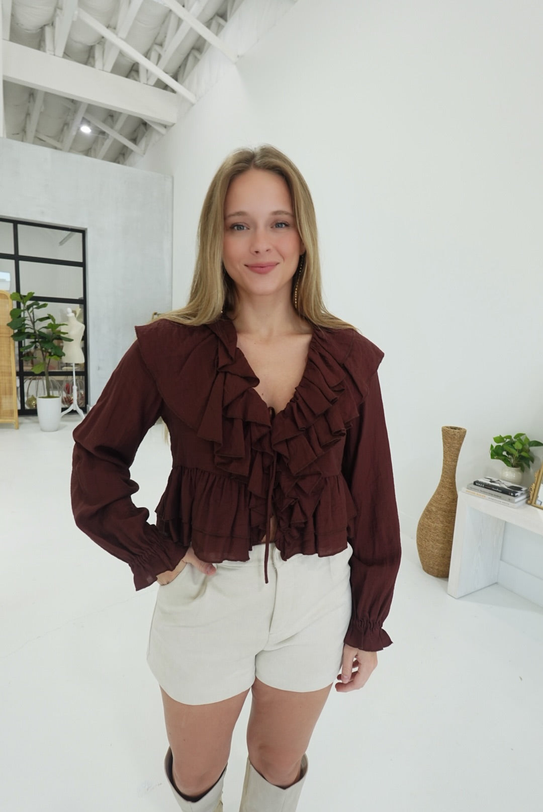 This Roped In Ruffle Blouse combines feminine charm with contemporary style. Featuring a flattering V-neck and delicate ruffle details along the cropped silhouette, it offers a light, airy feel perfect for layering or wearing on its own. Its long sleeves provide just the right touch of coverage, making it an ideal choice for transitional weather or dressing up casual looks with confidence and grace.