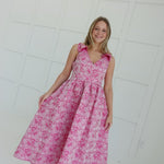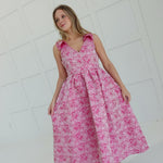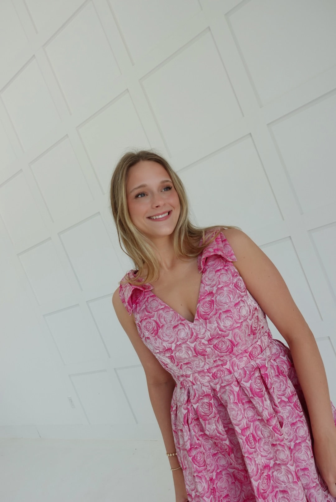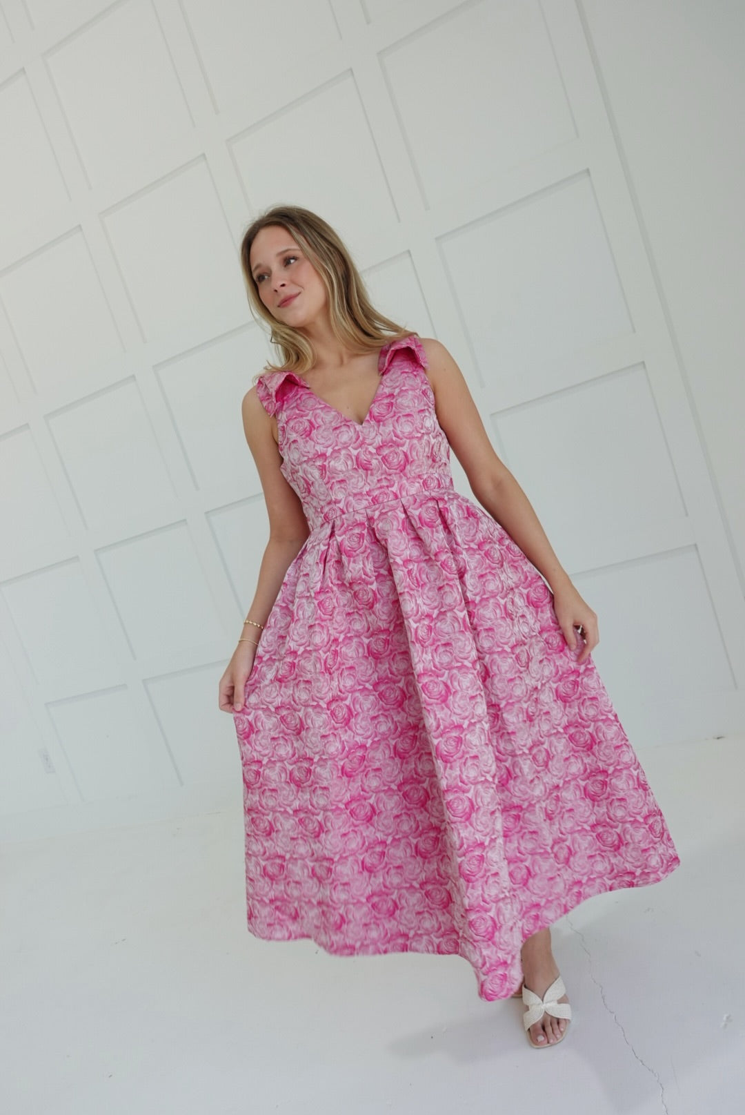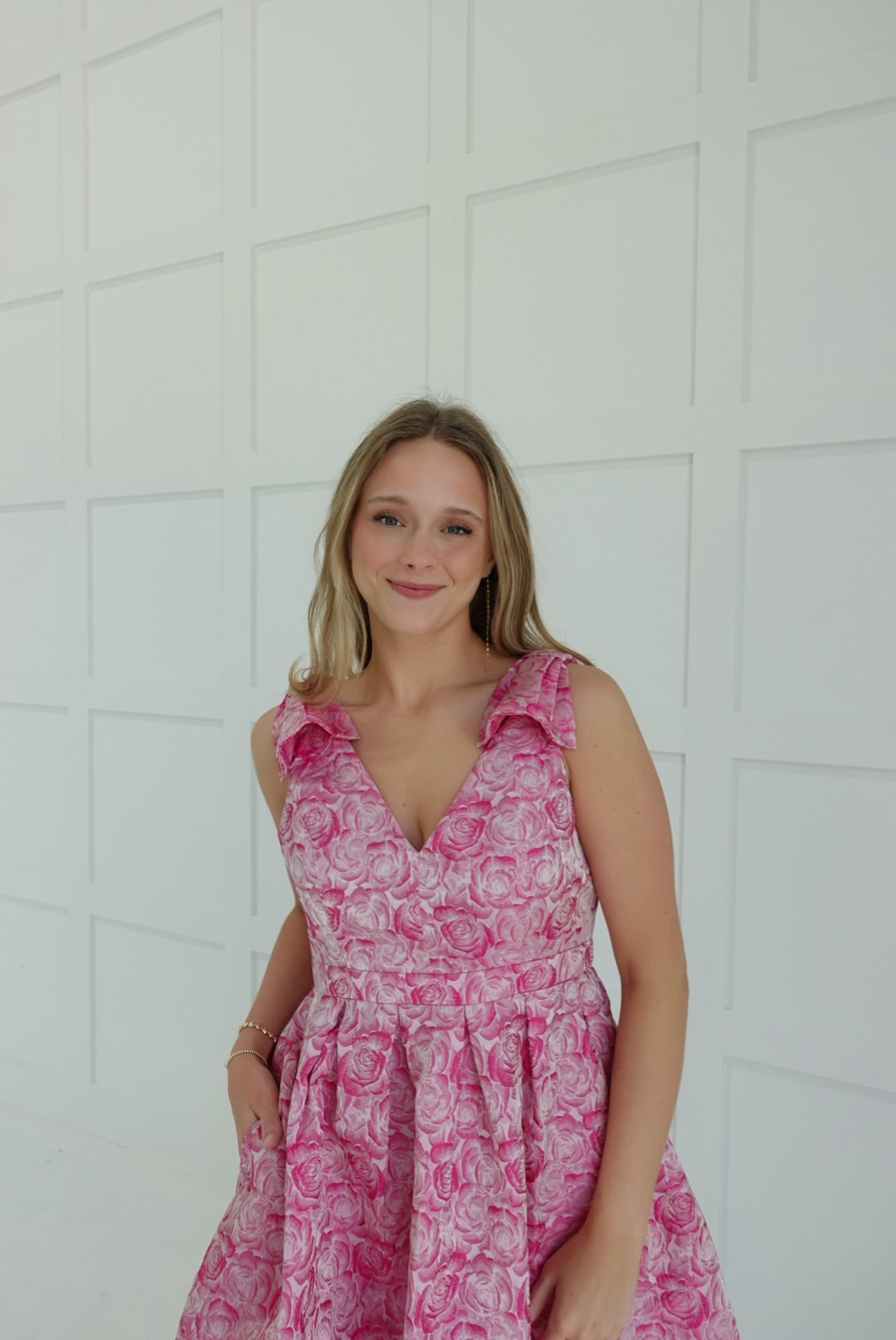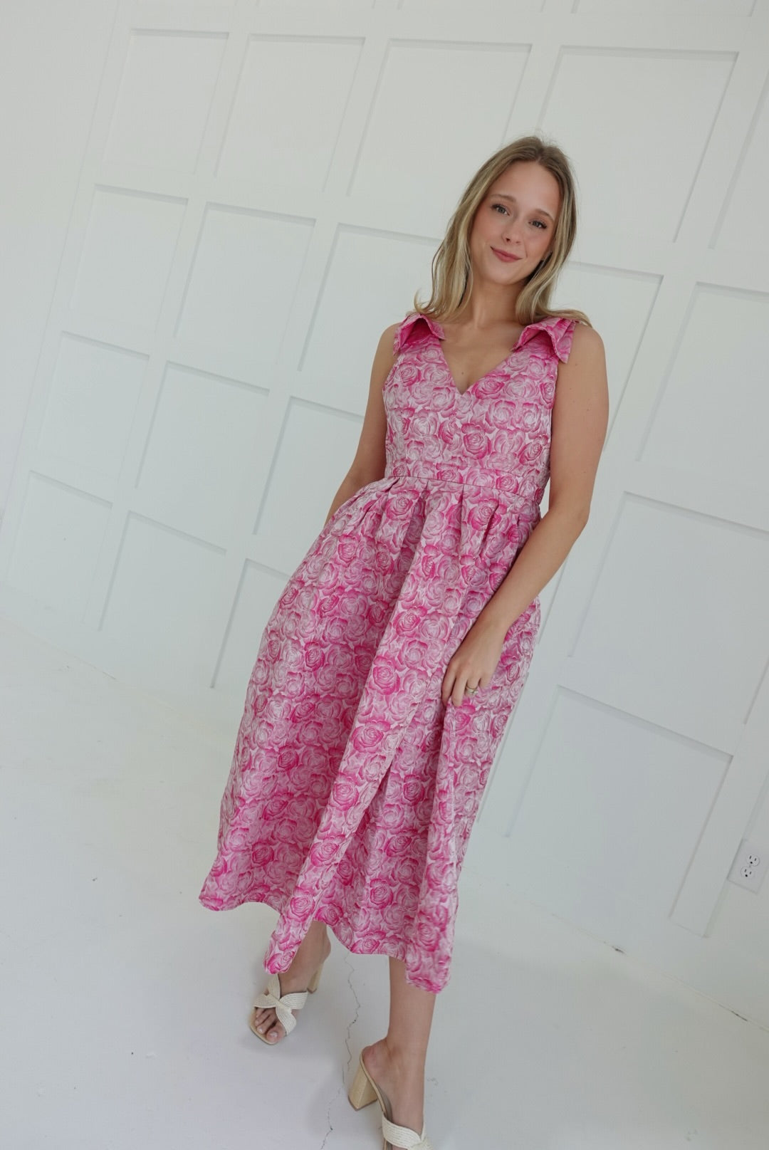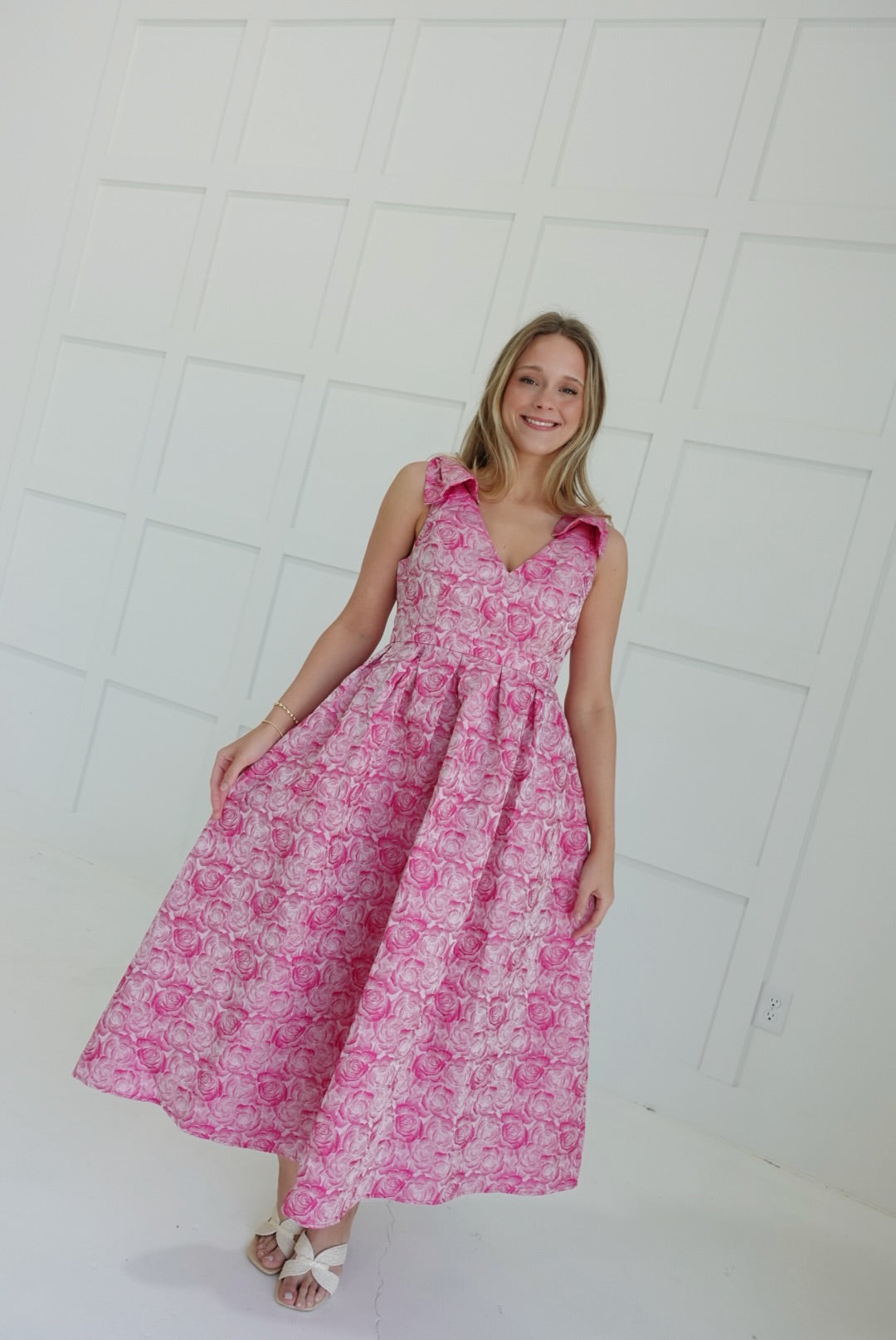 Get ready to turn heads in our Rosette Midi Dress! This floral textured dress features a V-neck design with an oversized bow accent on the shoulder, adding a touch of playfulness to your look. With convenient side pockets and a zipper closure at the back, this dress is both stylish and functional. Stay comfortable and cool in the lightweight, non-sheer fabric, perfect for any occasion.