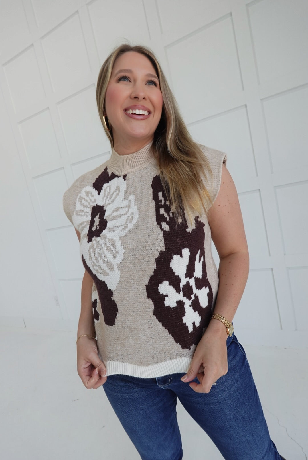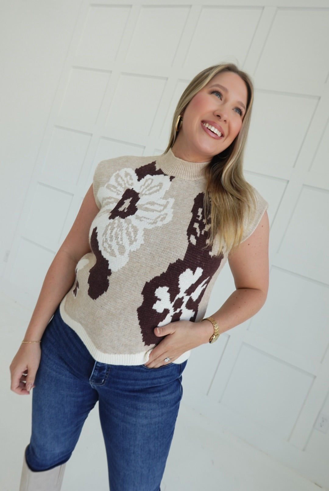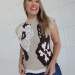 This Roundhouse Sweater Top in oatmeal features a delicate floral pattern on a lightweight, knit muscle tee design. Its unlined, non-sheer fabric offers comfortable breathability while providing subtle coverage. Perfect for layering or wearing on its own, this pullover combines style and ease for everyday wear.