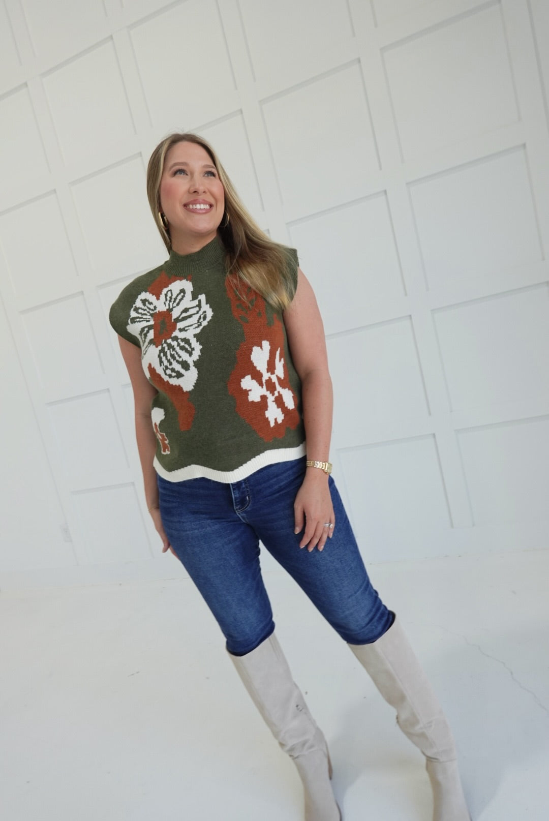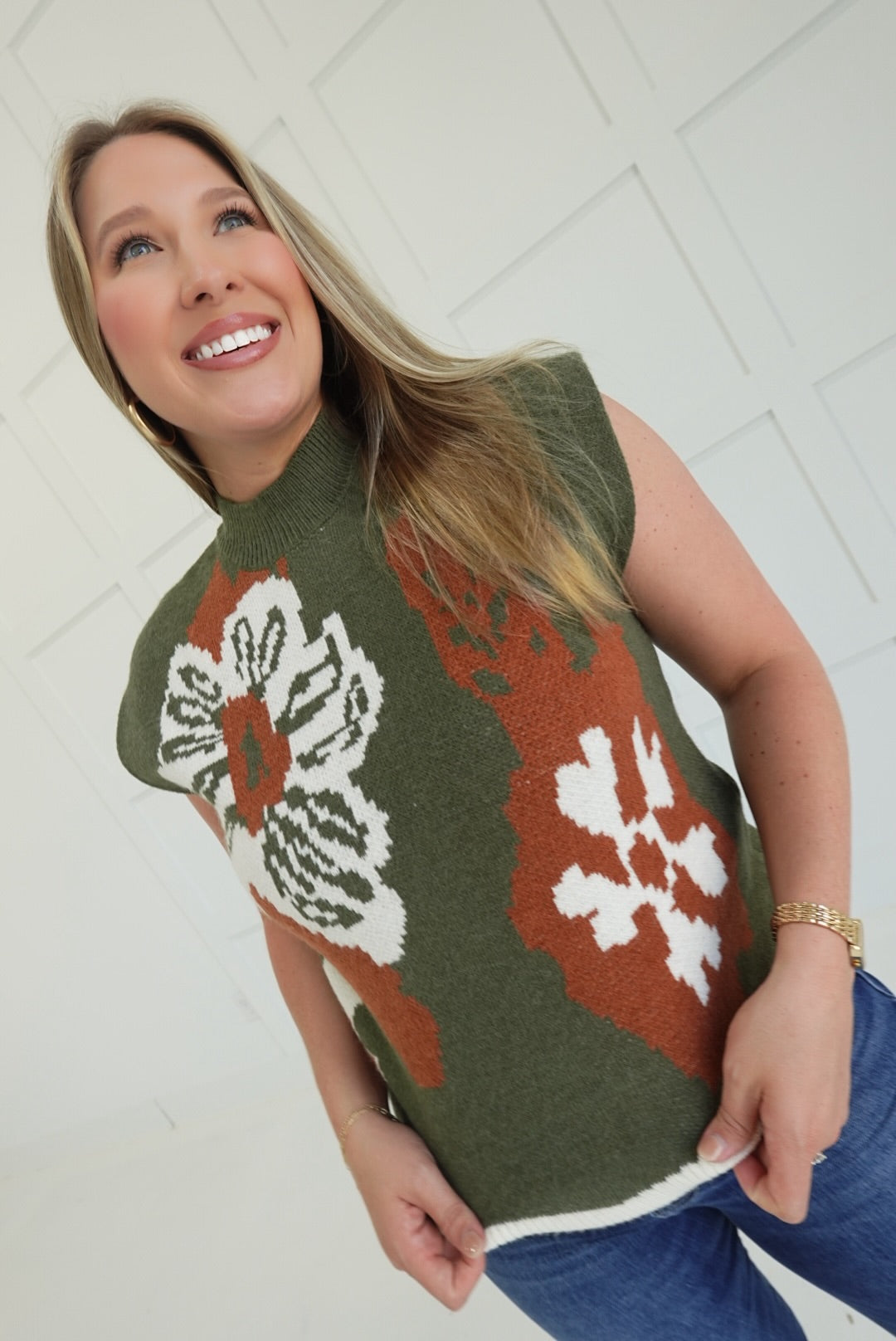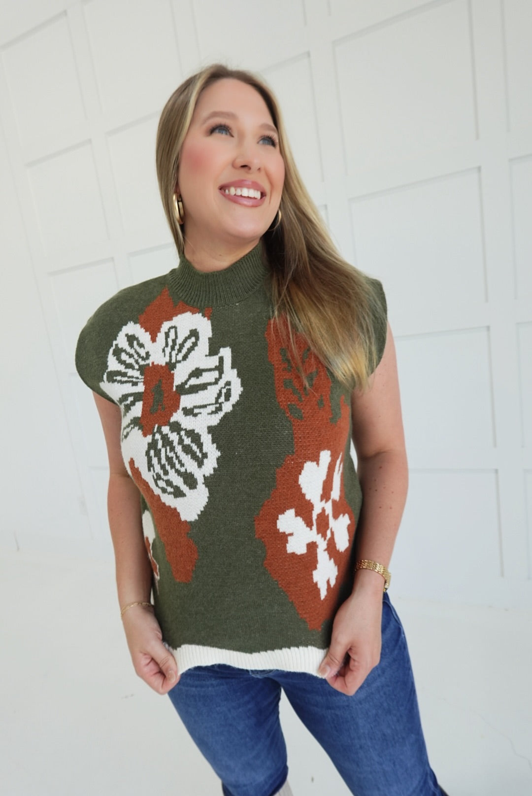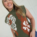 This Roundhouse Sweater Top in olive features a delicate floral pattern on a lightweight, knit muscle tee design. Its unlined, non-sheer fabric offers comfortable breathability while providing subtle coverage. Perfect for layering or wearing on its own, this pullover combines style and ease for everyday wear.