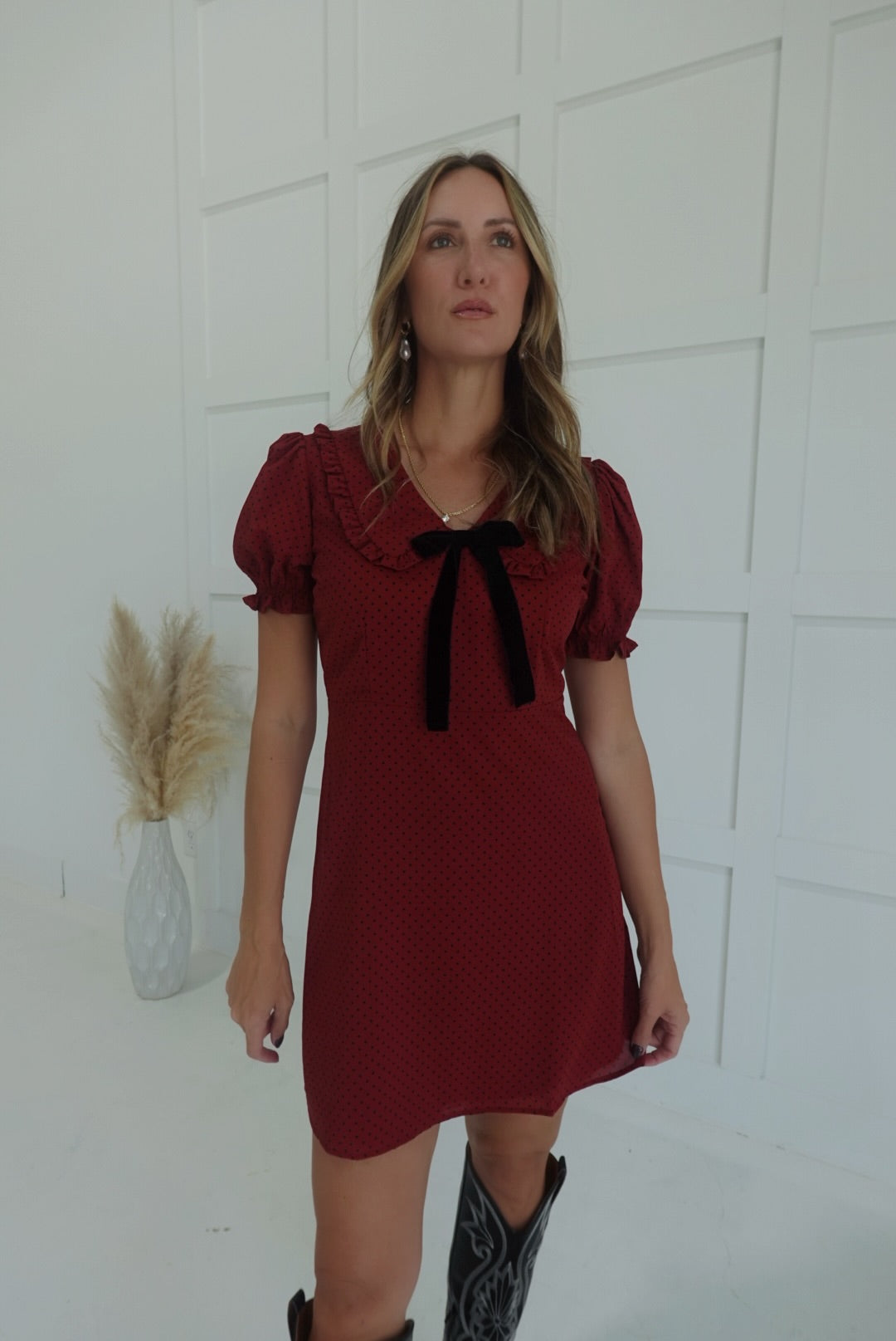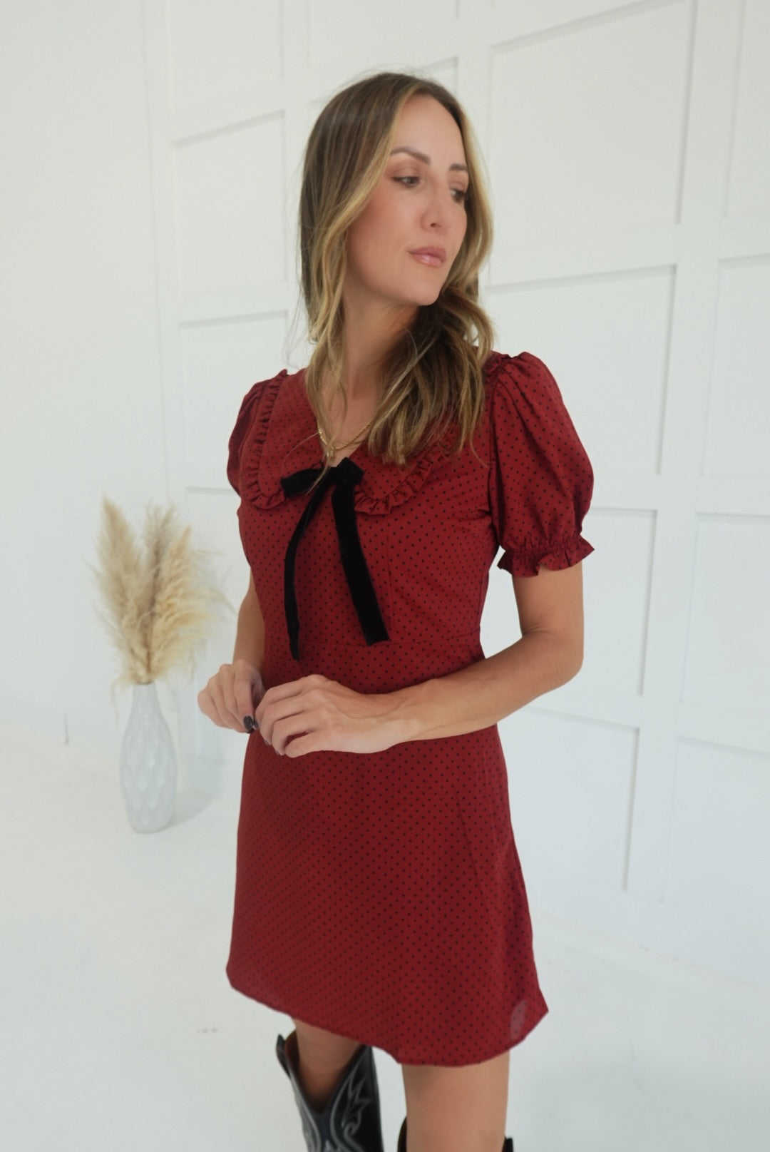 The Rule Follower Mini Dress combines playful polka dots with a soft velvet texture for a stylish yet comfortable look. Featuring a classic collar and a tie at the waist, it flatters your silhouette while adding a touch of elegance. Perfect for day or night, this dress offers both charm and versatility to keep you confident wherever you go.