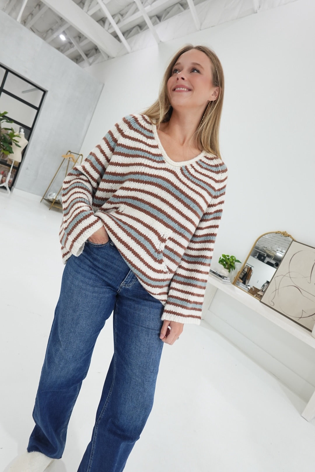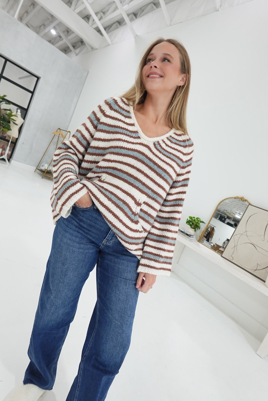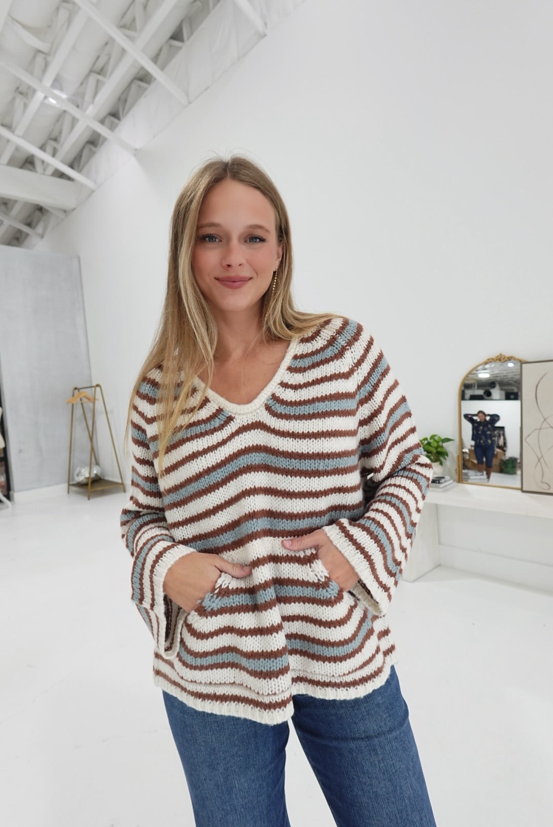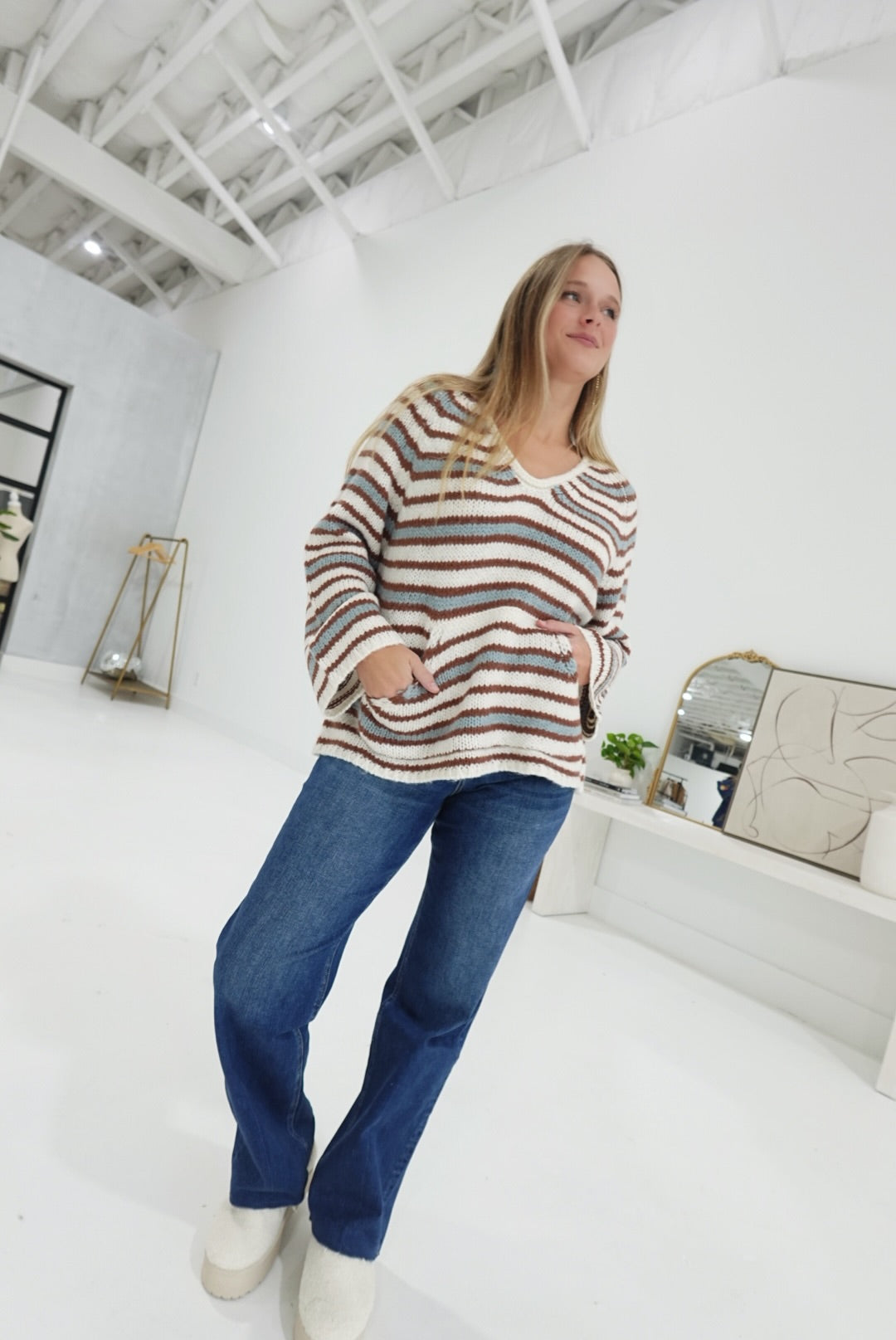 - Striped Kangaroo Pocket Sweater