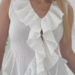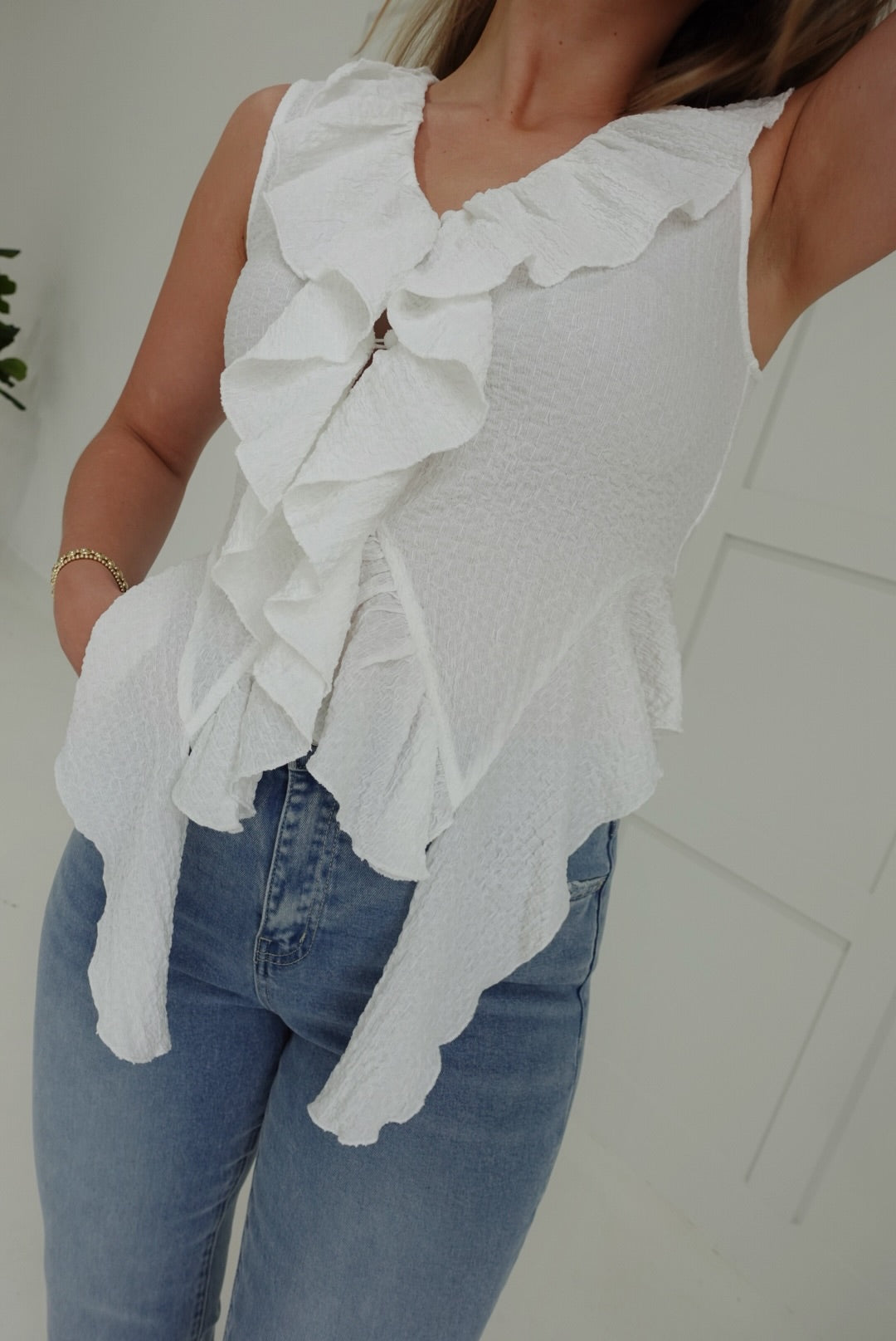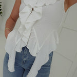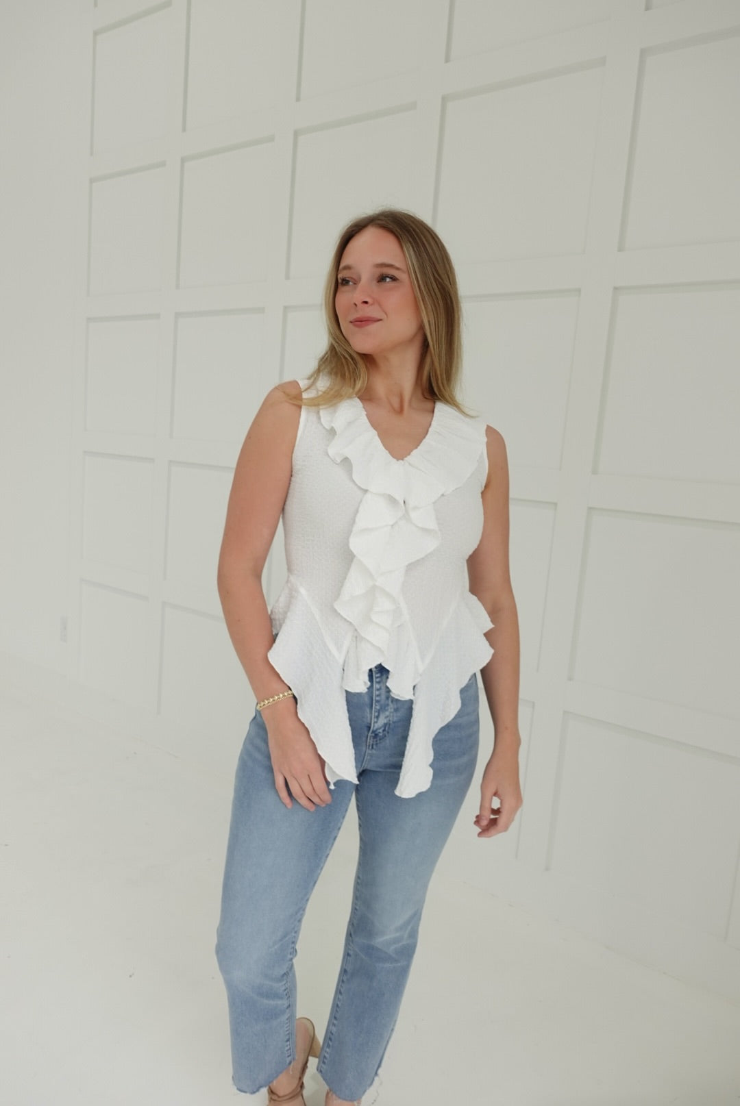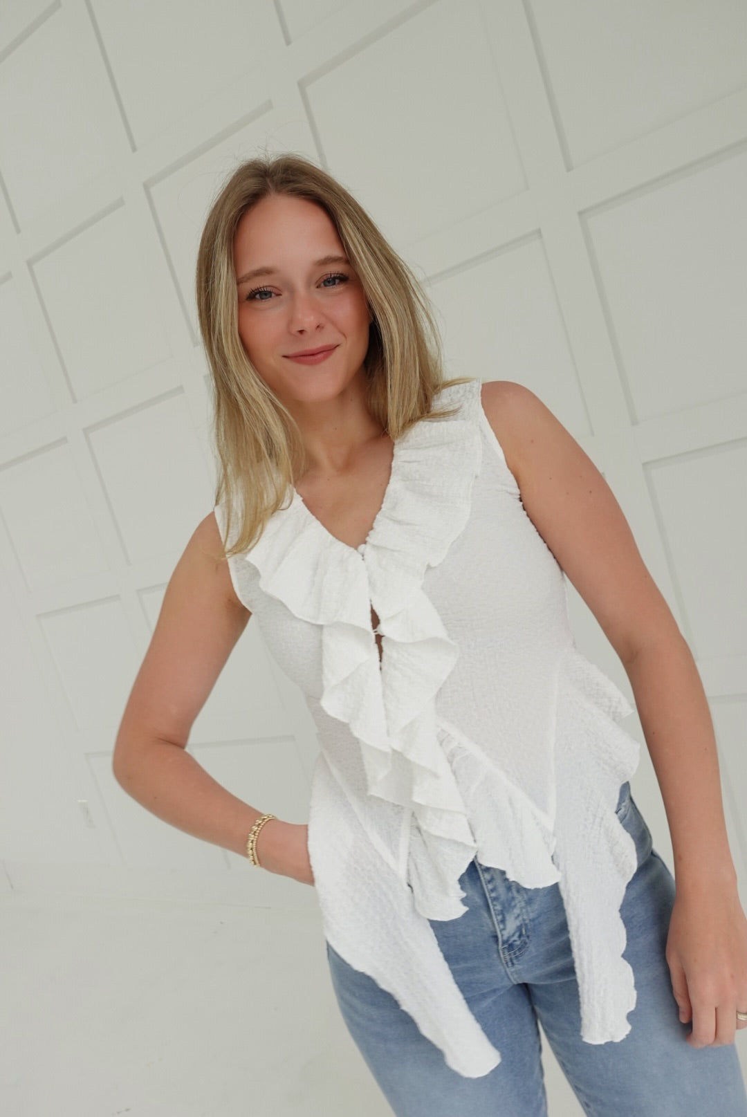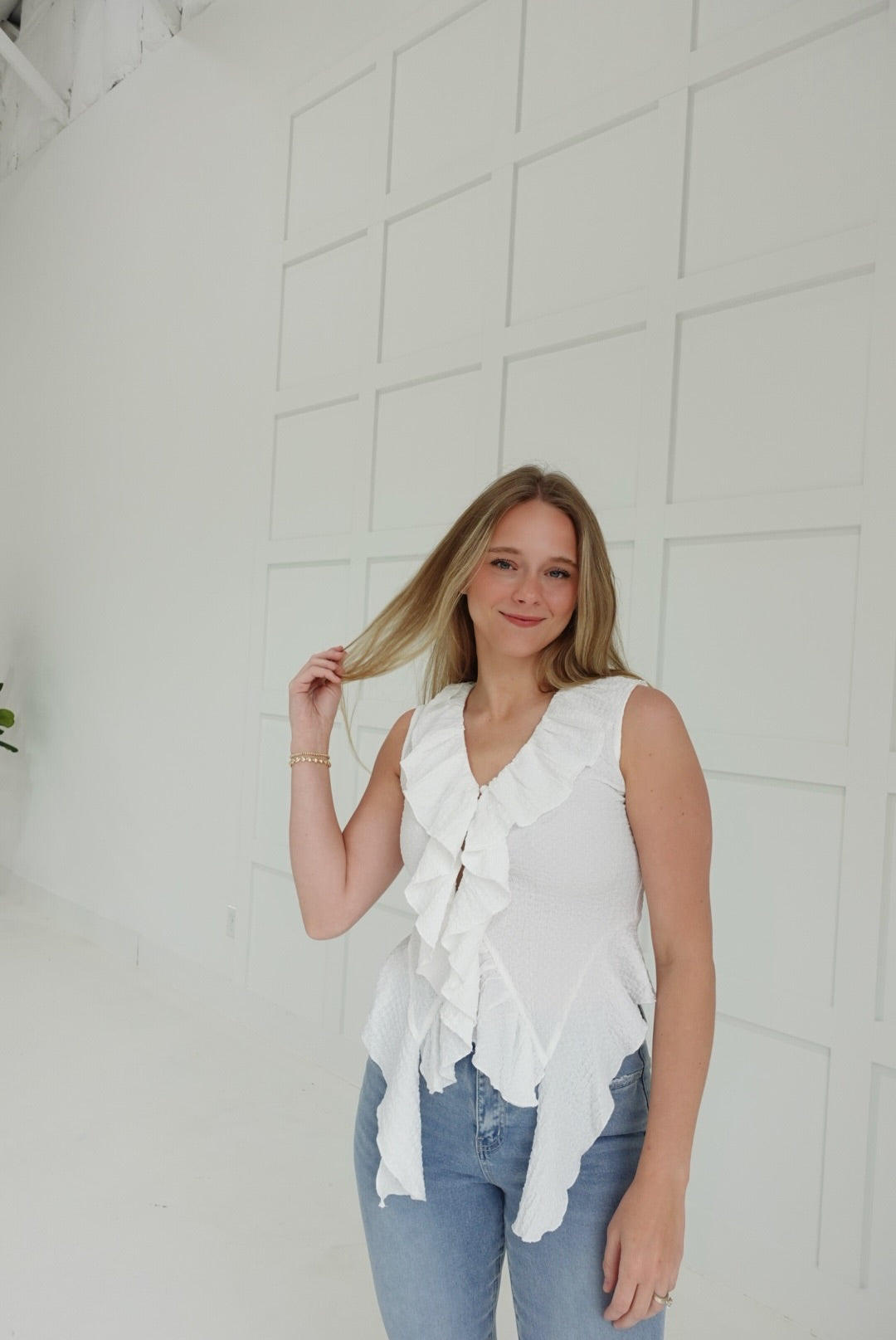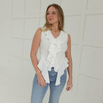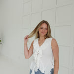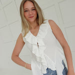 Introducing the Rylee Ruffle Top - the perfect blend of playful and chic. This sleeveless v neck top features trendy ruffle details, adding a touch of fun to any outfit. With its versatile design, it's a must-have for any wardrobe.