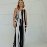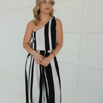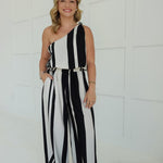 Get ready to turn heads in the Safav Striped Set! This playful set features a one shoulder knot top paired with wide leg striped pants. Perfect for a night out, this set will have you feeling confident and stylish!