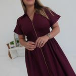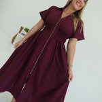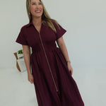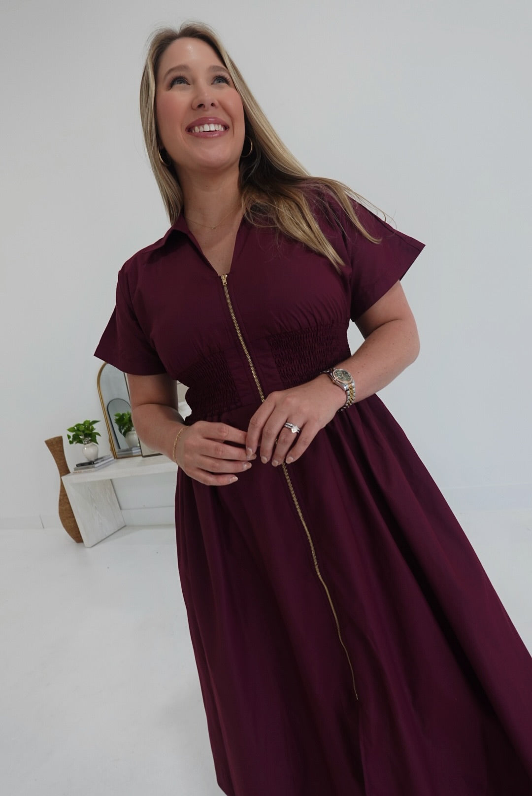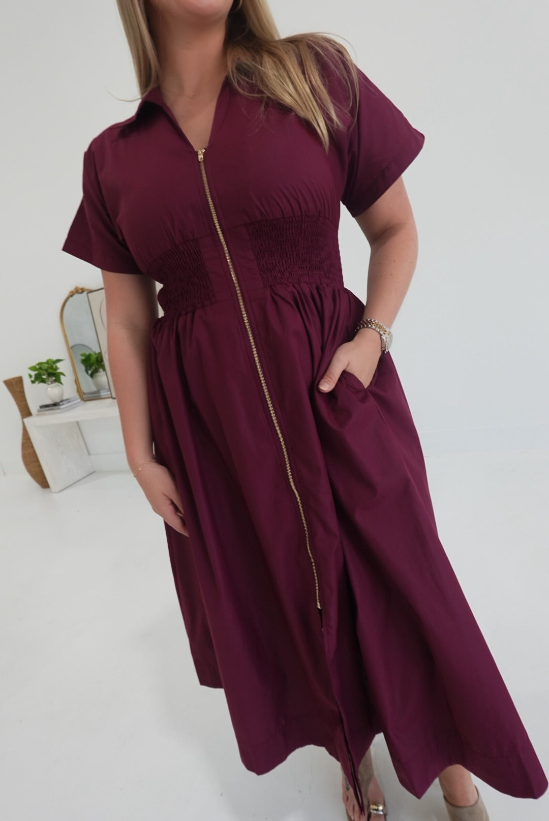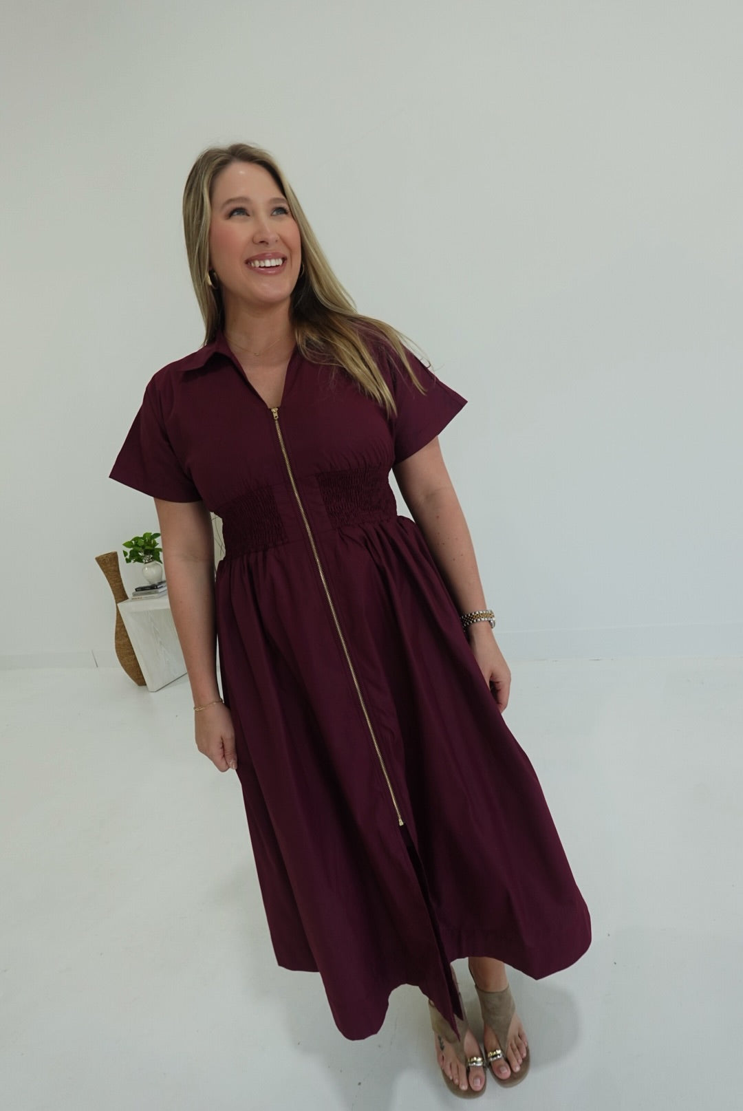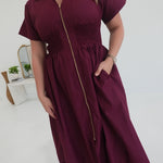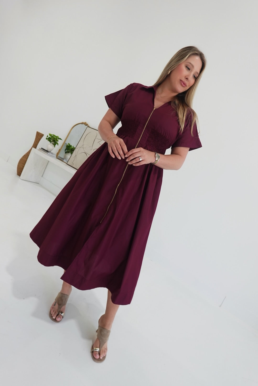 This solid burgundy midi dress combines comfort and style with its lightweight woven fabric and non-sheer lining. The smocked waist gently shapes your silhouette, while the zip-up front ensures easy wear. Practical side pockets add convenience without sacrificing elegance. Perfect for everyday wear or special occasions, this dress offers both ease and a flattering fit.