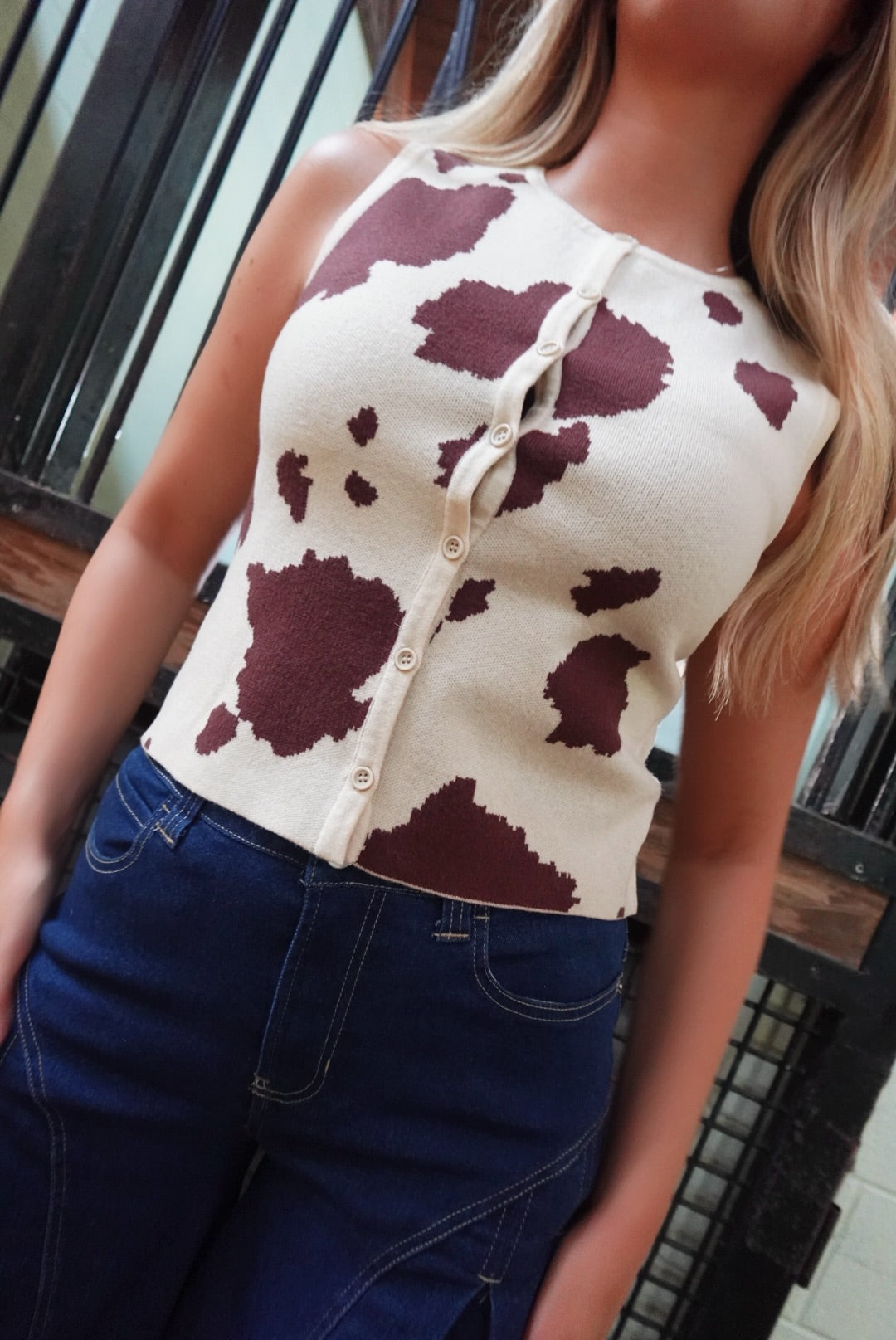 Embrace effortless style with the Santi Sleeveless Cardigan, featuring a cozy beige and brown cow print pattern. This button-down top offers a comfortable, breathable fit perfect for layering or wearing on its own. Its sleeveless design allows for easy movement, making it a versatile addition to your wardrobe that supports your day-to-day comfort and confidence.