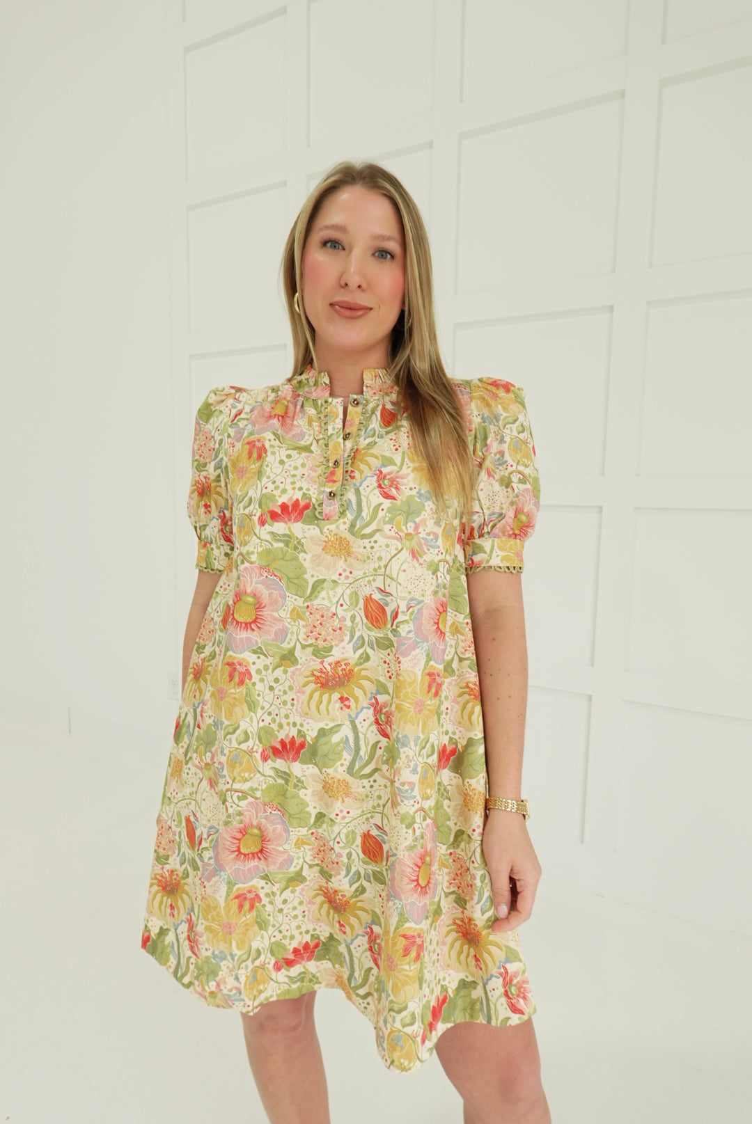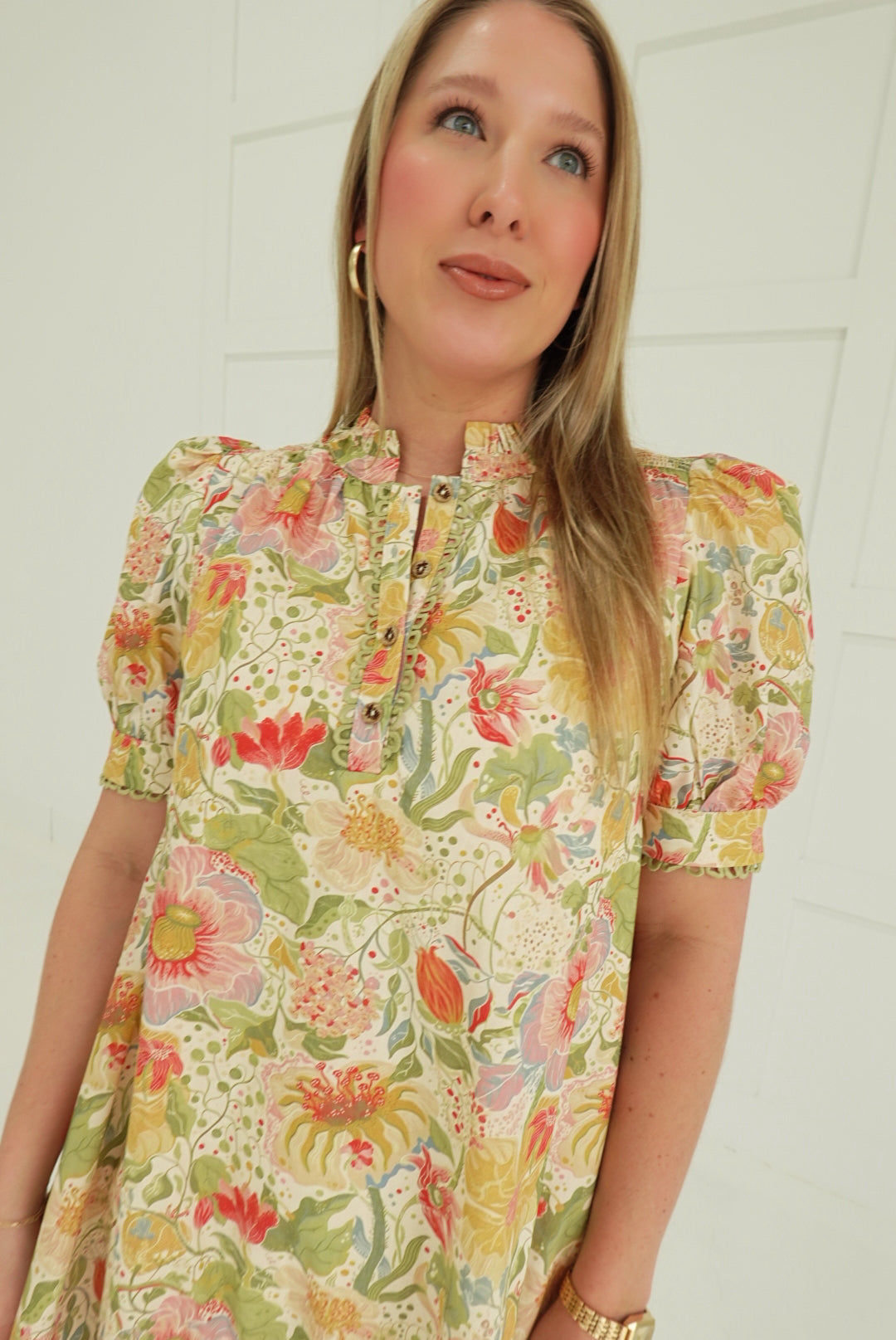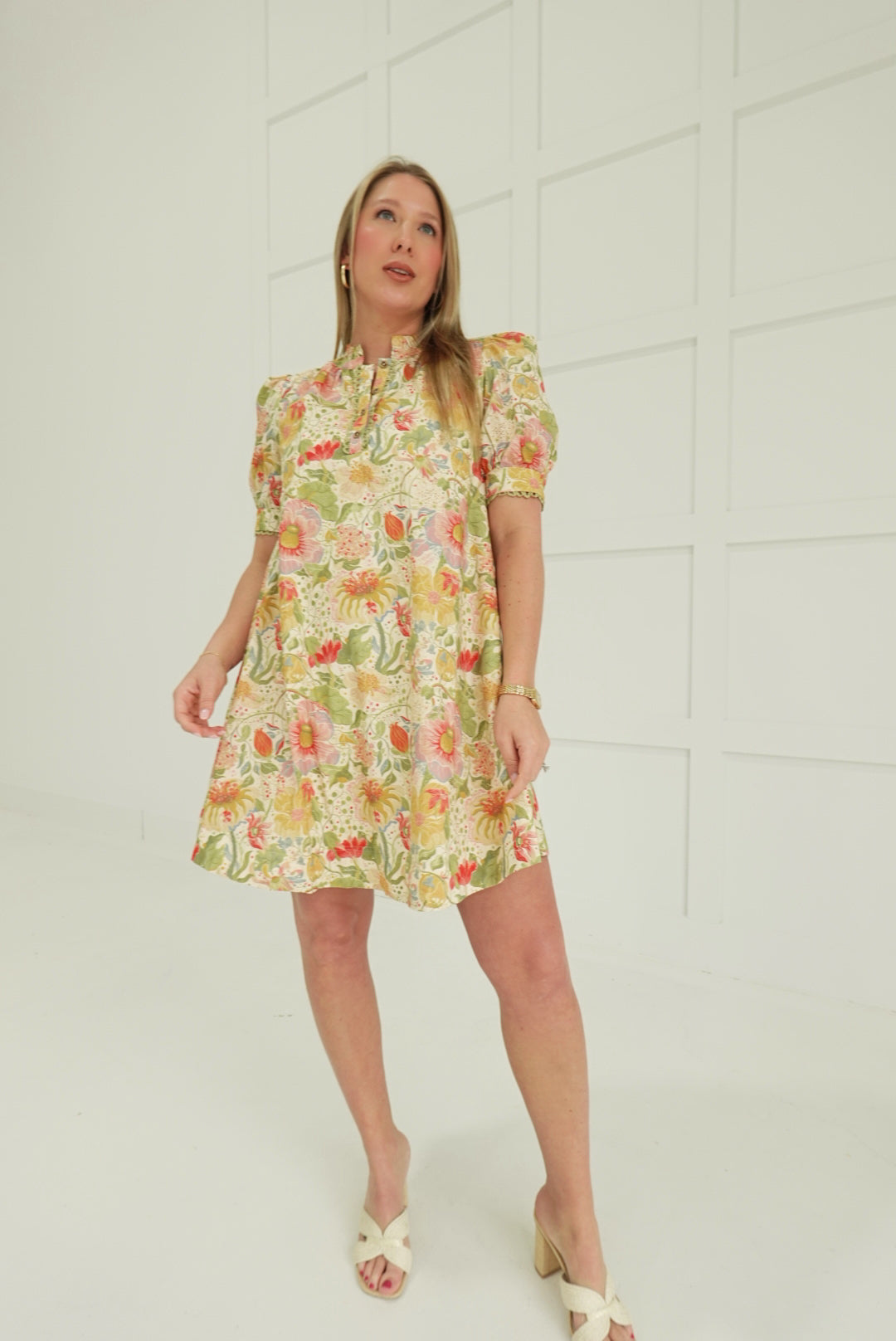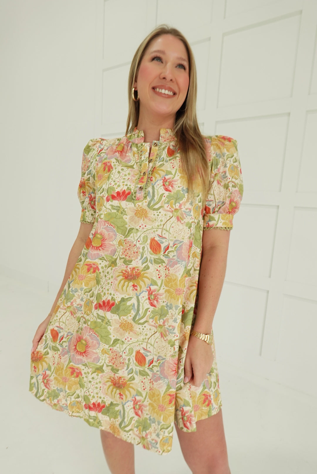 Embrace effortless elegance with this charming mini dress, featuring a soft muted botanic print that brings understated sophistication to your wardrobe. The romantic puff sleeves add a touch of vintage-inspired charm, while delicate smocking details at the bodice create flattering definition. Finished with refined trim accents, this piece transitions seamlessly from casual outings to special occasions. Perfect for those who appreciate timeless style with modern comfort.