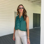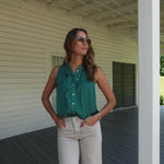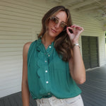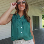 Elevate your wardrobe with the Serene Sleeveless Blouse. Featuring delicate scallop trim and a classic button-up design, this top combines elegance with comfort. Its sleeveless cut keeps you cool and stylish, perfect for layering or wearing on its own. Ideal for both casual days and polished occasions, this blouse offers a graceful touch to any outfit.