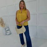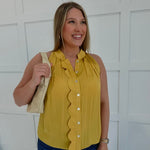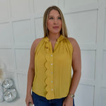 Elevate your wardrobe with the Serene Sleeveless Blouse in Gold. Featuring delicate scallop trim and a classic button-up design, this top combines elegance with comfort. Its sleeveless cut keeps you cool and stylish, perfect for layering or wearing on its own. Ideal for both casual days and polished occasions, this blouse offers a graceful touch to any outfit.