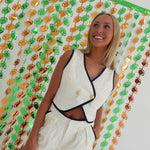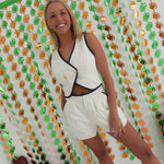 This Set Sail Tailored Set features an asymmetrical contrast binding vest with a back adjuster for a perfect fit, paired with high-waisted double-pleated shorts accented by matching contrast binding. The gold button details on the vest add a touch of elegance, while the tailored design flatters your silhouette, making it a stylish and comfortable choice for any occasion.