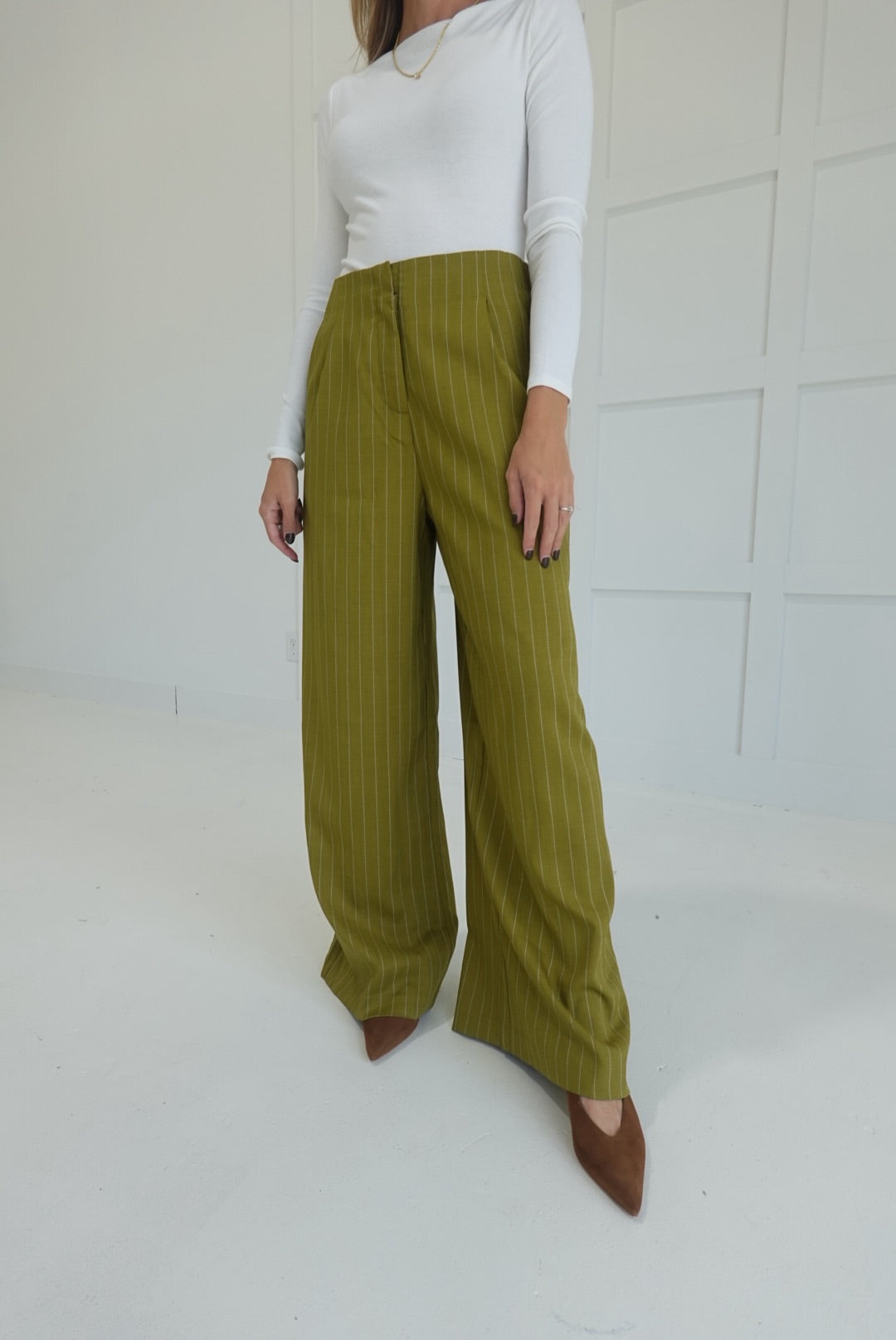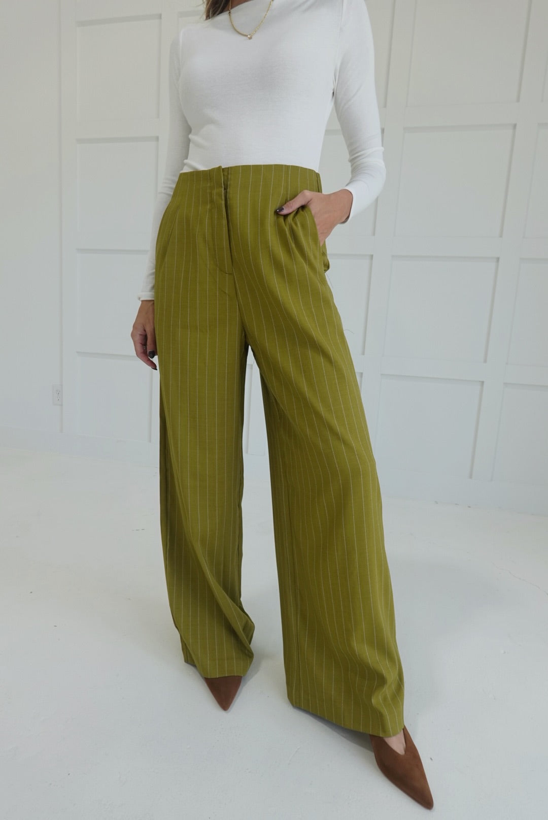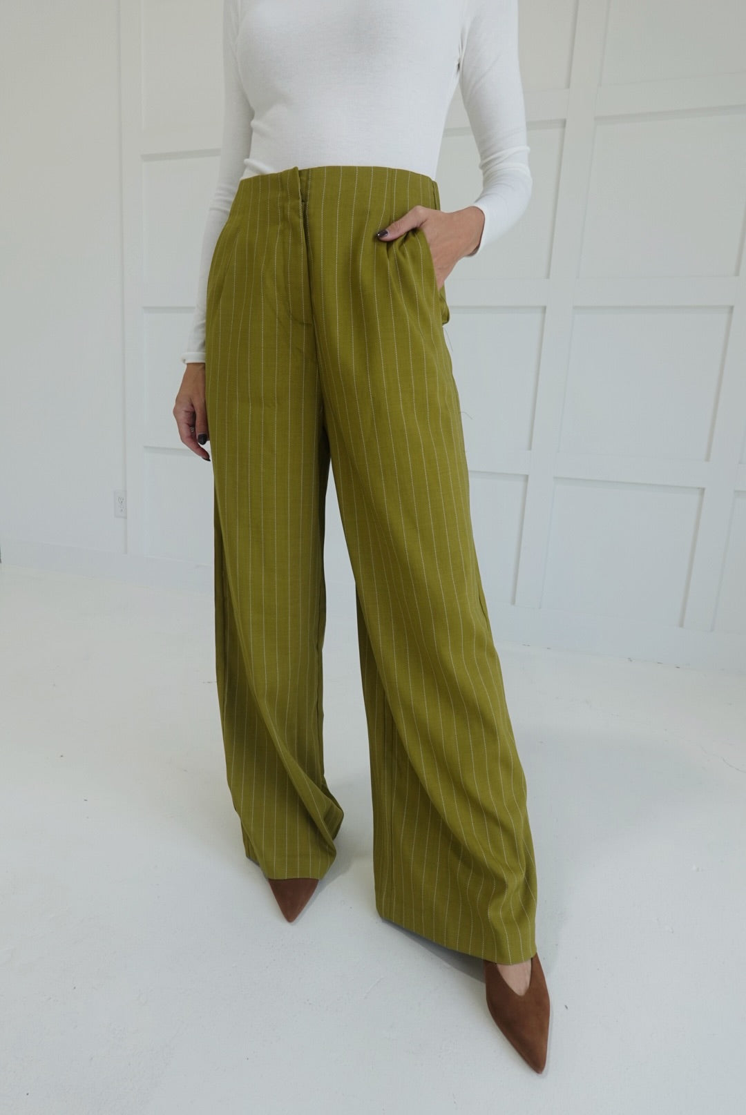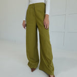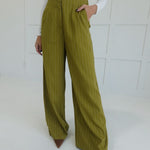 The Sibly Trouser Pants in Olive offer a flattering high-waist fit with a sophisticated pinstripe design, perfect for dressier occasions. Crafted to provide both style and comfort, these pants elevate your look while ensuring a polished silhouette throughout the day. Ideal for pairing with blouses or blazers, they deliver versatile options for work or formal settings.