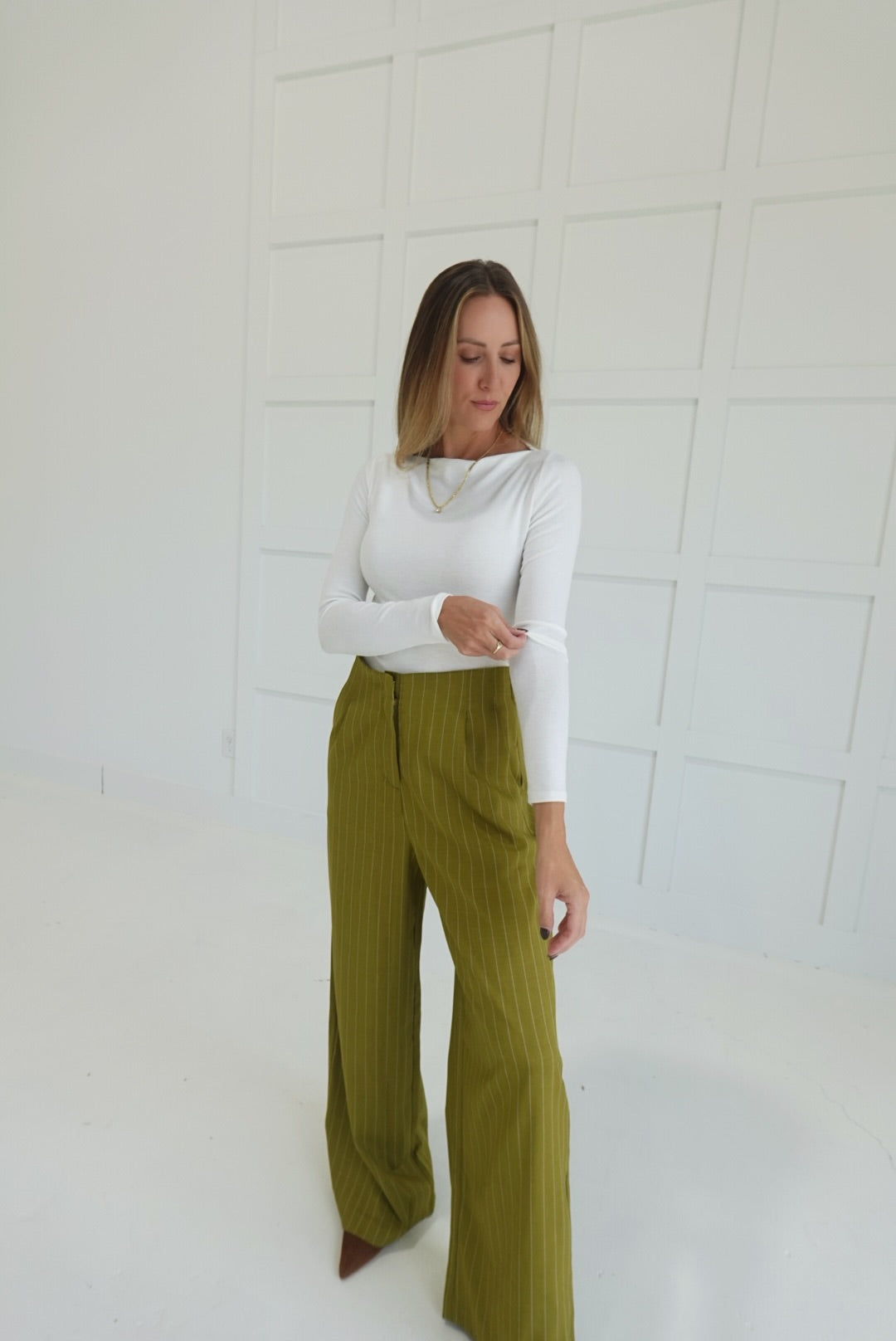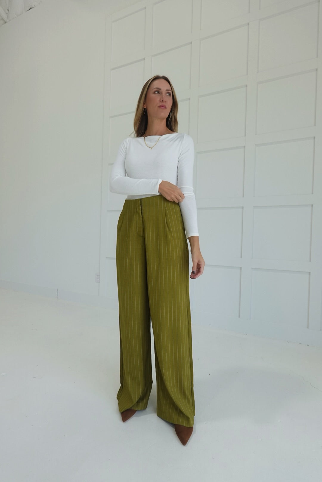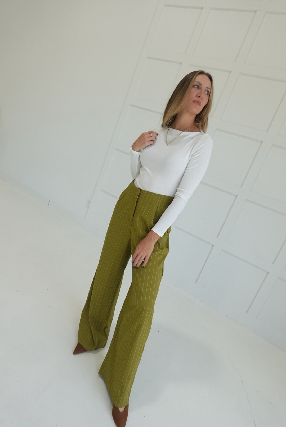 The Sibly Trouser Pants in Olive offer a flattering high-waist fit with a sophisticated pinstripe design, perfect for dressier occasions. Crafted to provide both style and comfort, these pants elevate your look while ensuring a polished silhouette throughout the day. Ideal for pairing with blouses or blazers, they deliver versatile options for work or formal settings.