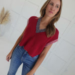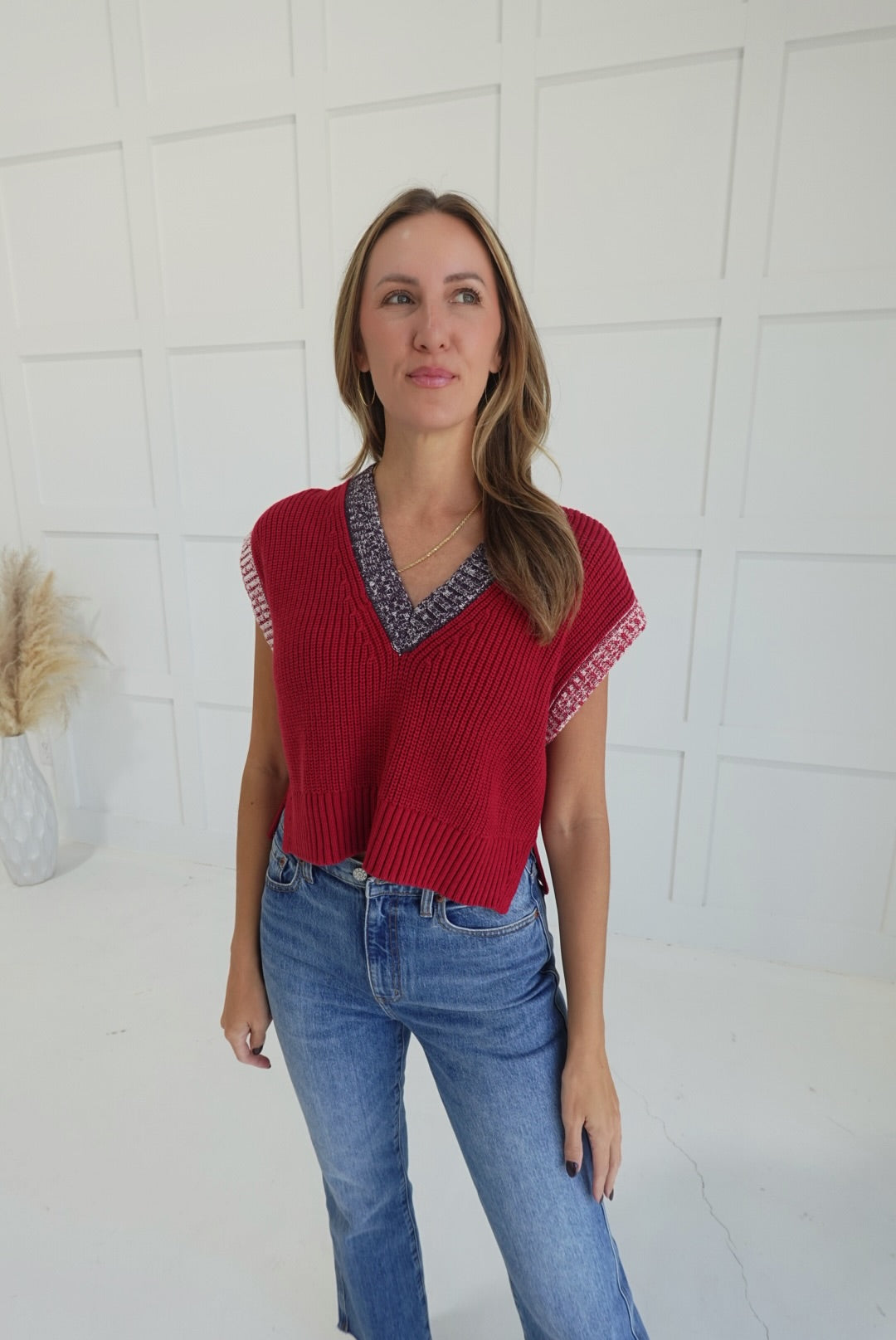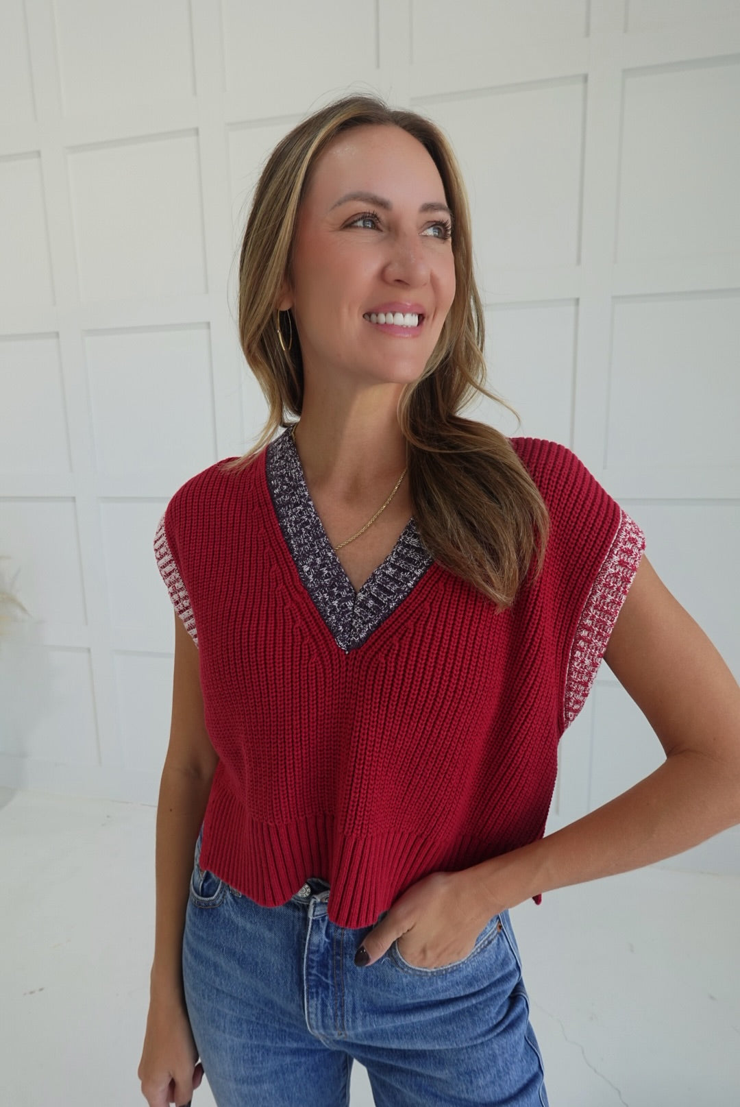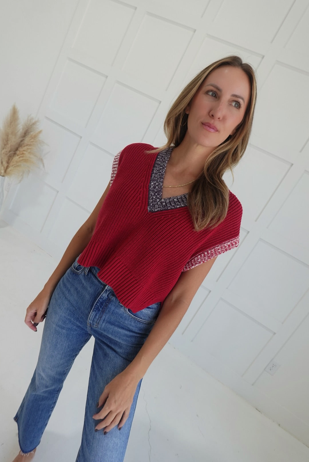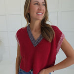 The Simmons Knit Top features a flattering V neckline and a sleeveless cropped design, making it a versatile addition to your wardrobe. Its knit fabric offers comfortable warmth while allowing ease of movement. Perfect for layering or wearing on its own, this top blends style and comfort to keep you looking and feeling confident throughout your day.