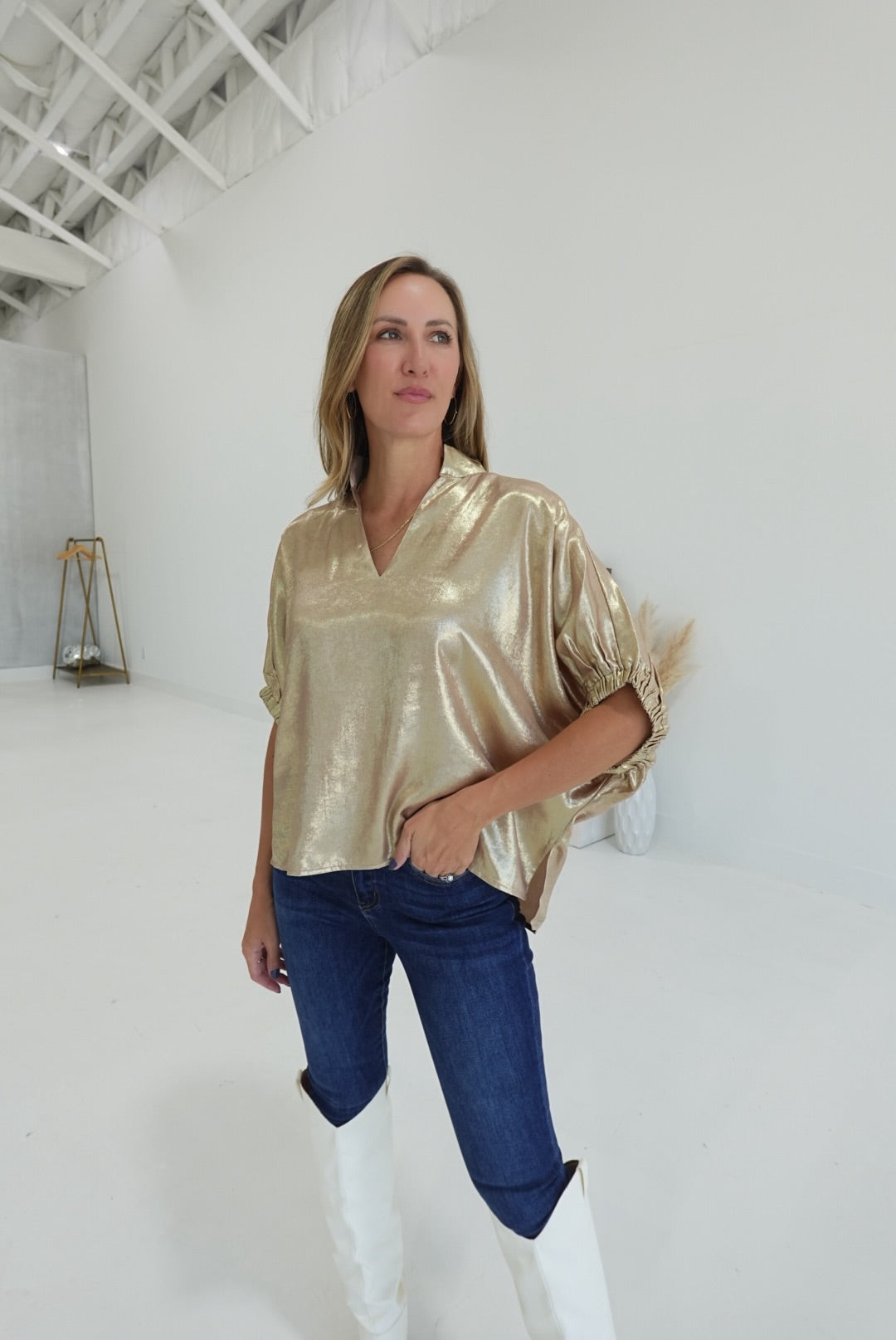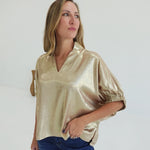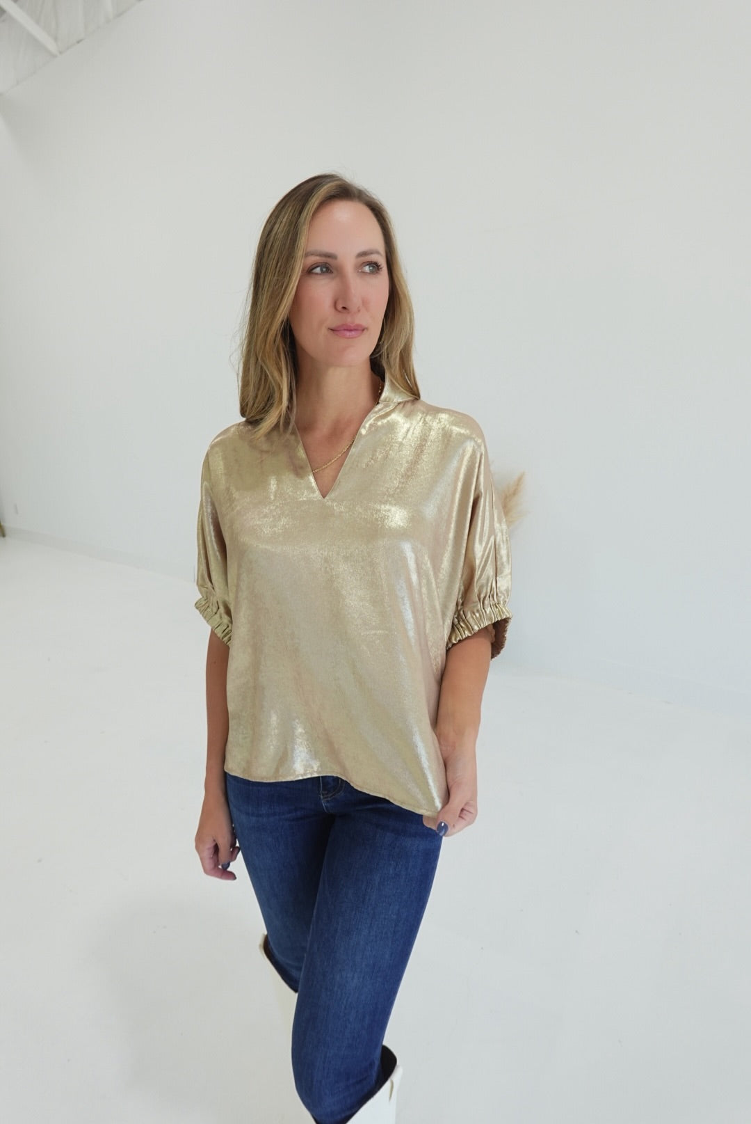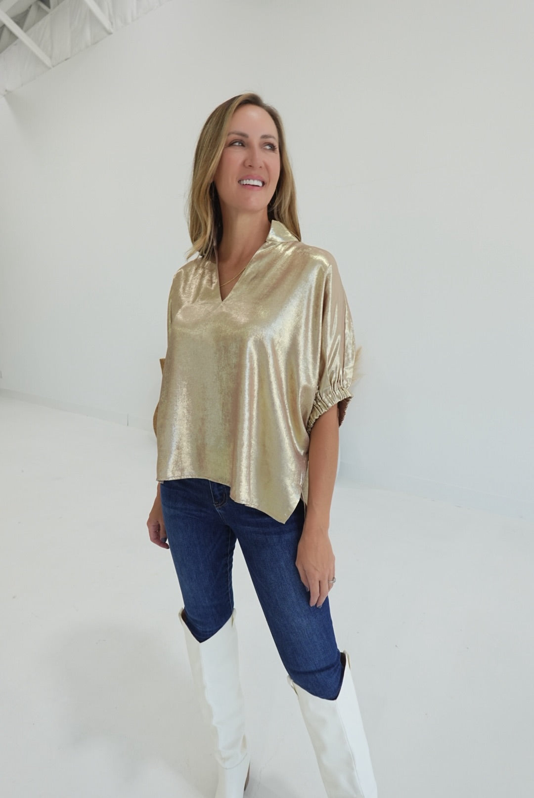 Elevate your wardrobe with the Sipping Bubbly Blouse. This lightweight, woven top features a flattering metallic V-neck band collar and relaxed short dolman sleeves, offering comfort without sacrificing style. Its non-sheer, unlined fabric ensures a breathable fit, perfect for any occasion where you want to feel effortlessly chic and supported.