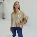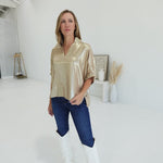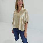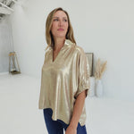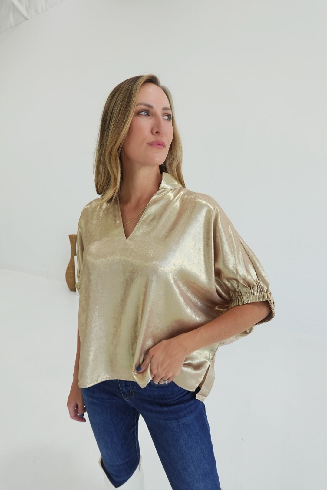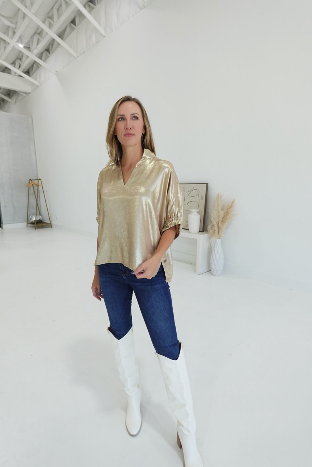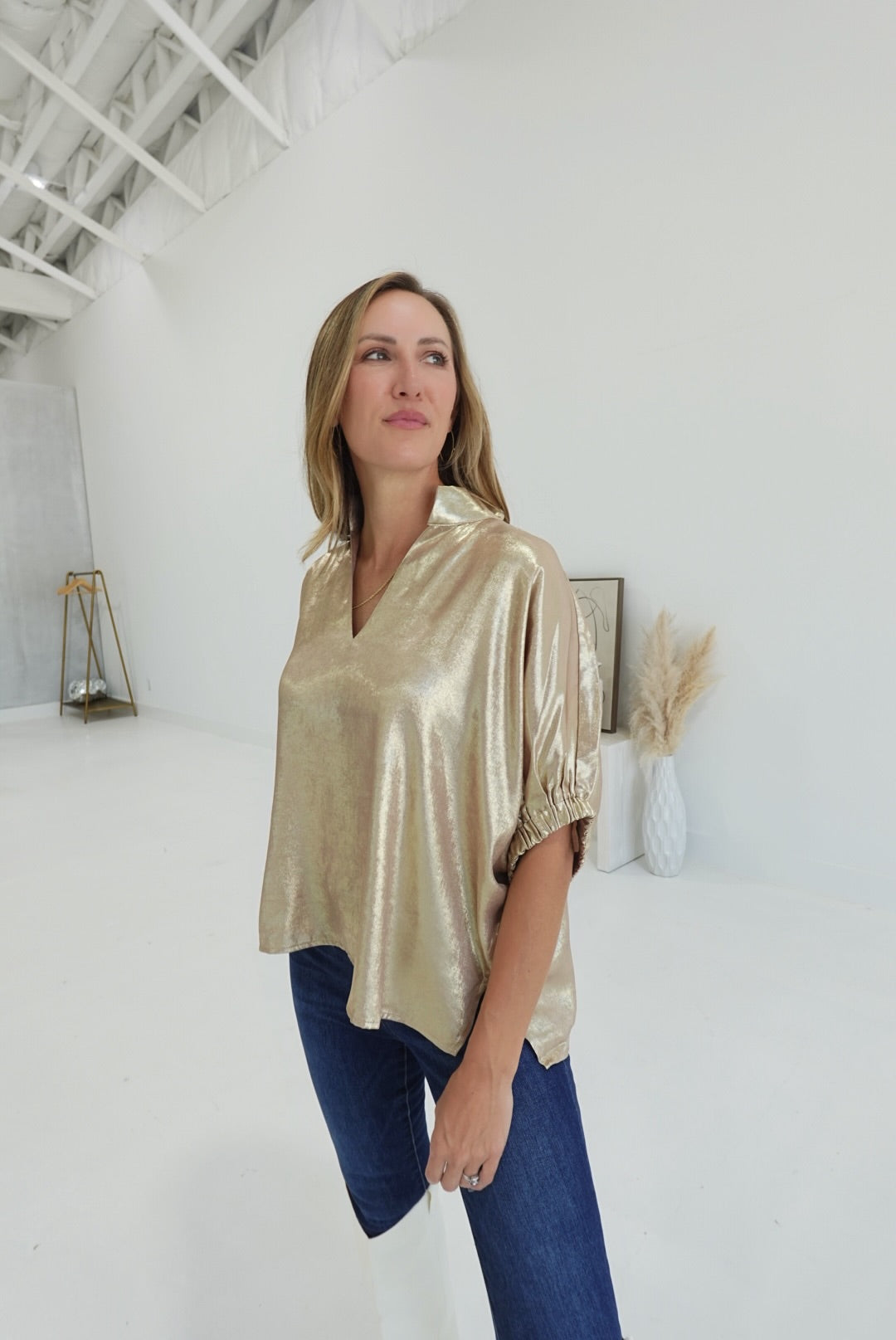 Elevate your wardrobe with the Sipping Bubbly Blouse. This lightweight, woven top features a flattering metallic V-neck band collar and relaxed short dolman sleeves, offering comfort without sacrificing style. Its non-sheer, unlined fabric ensures a breathable fit, perfect for any occasion where you want to feel effortlessly chic and supported.