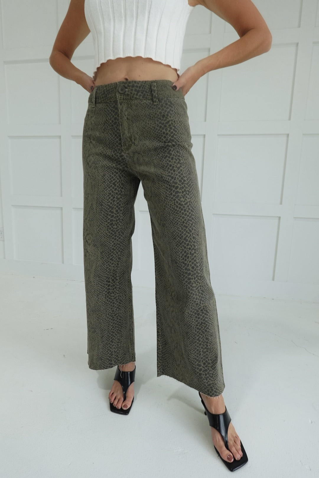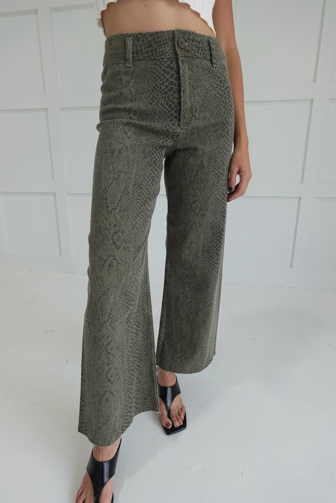 Embrace bold style with the Slyer Ways Pants, featuring a distinctive snake print in a versatile olive shade. These pants combine edgy design with comfortable wear, making them perfect for adding a unique touch to your everyday wardrobe. Whether dressing up or down, they offer a confident look that supports your individual fashion sense.