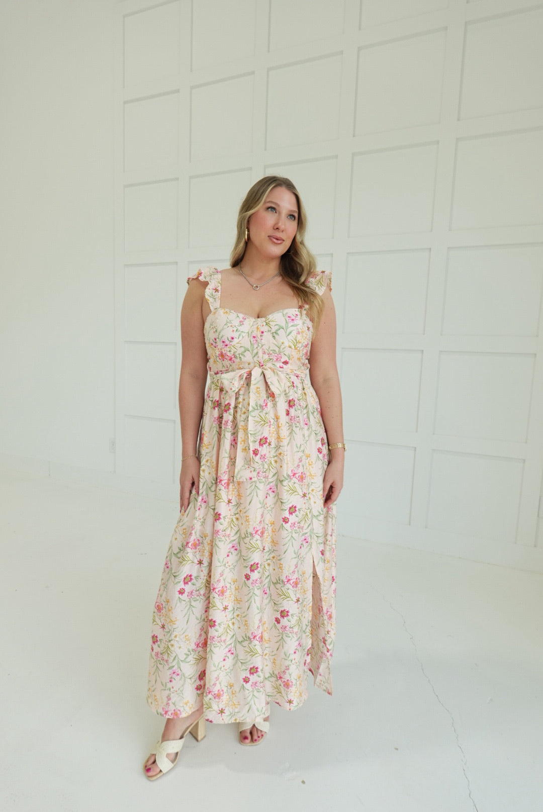 Effortless elegance meets romantic style with this sleeveless midi dress. The floral print brings natural beauty to your wardrobe, while the waist tie cinches your silhouette for a flattering fit. A front slit adds movement and modern flair, making it perfect for warm-weather occasions, casual outings, or layered styling. Versatile enough for day or evening wear.