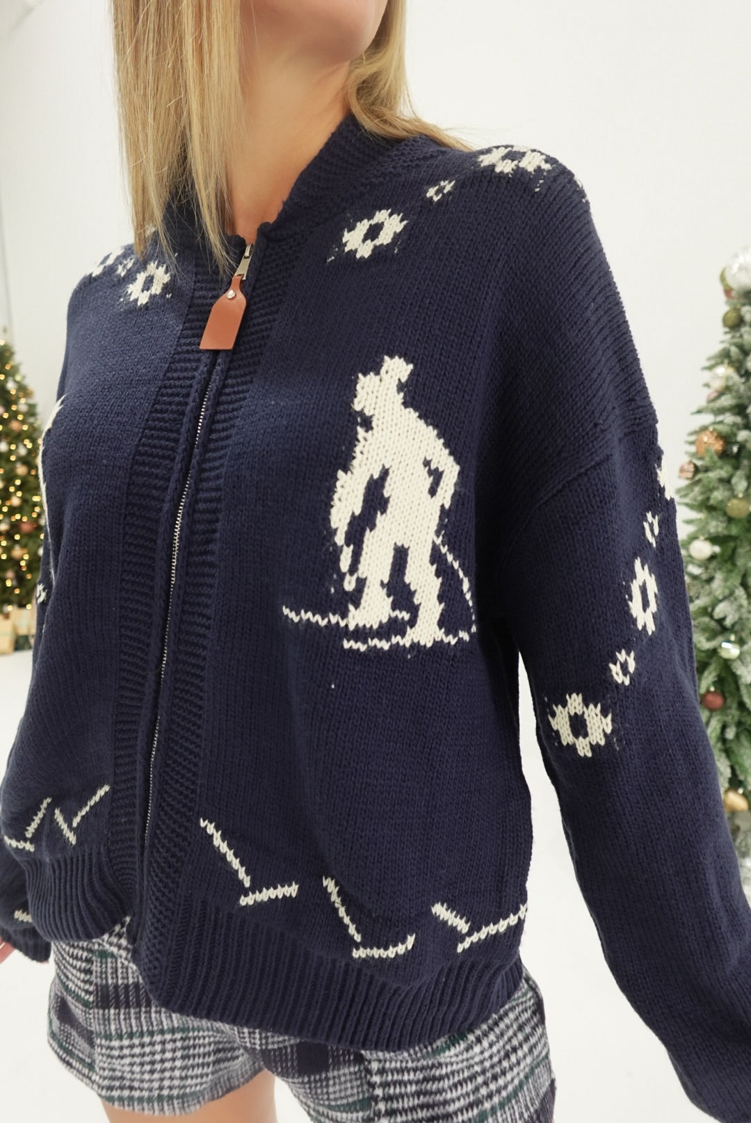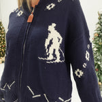 The Snowed In Sweater features a cozy ski pattern and a shawl collar, combining classic style with comforting warmth. Its zip-up design makes it easy to layer, perfect for chilly days. Whether you're relaxing indoors or heading out for winter activities, this cardigan offers both comfort and practical warmth to keep you snug all season long.