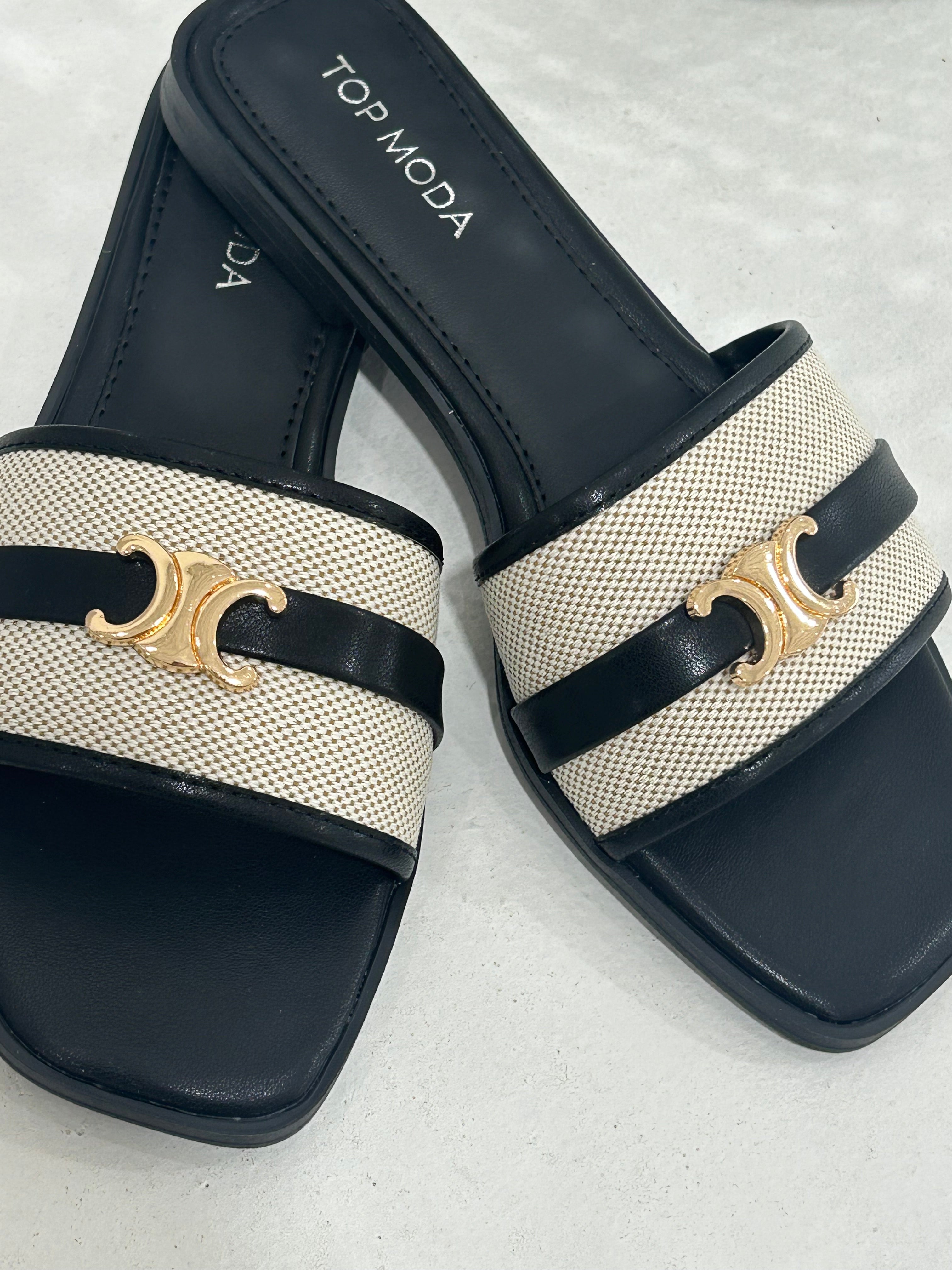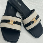Step into bold confidence with the Solana Step Sandal. This striking black design pairs textured canvas with premium faux leather, anchored by iconic gold-tone hardware that catches every glance. The modern square toe silhouette commands attention whether you're navigating your day or turning heads on vacation. Effortlessly versatile, it transitions from casual errands to elevated getaway moments with undeniable edge.