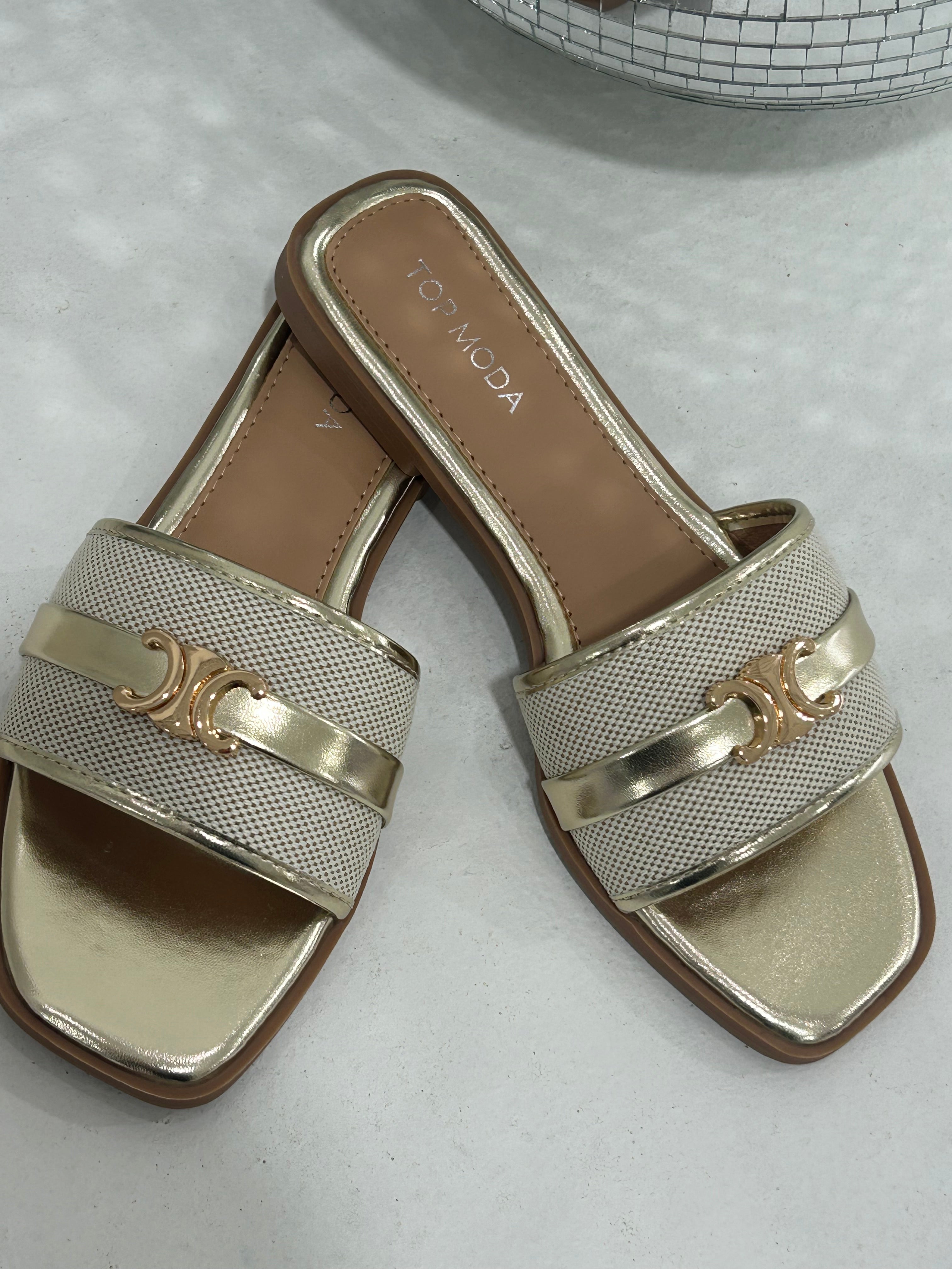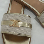 Step into bold confidence with the Solana Step Sandal. This striking black design pairs textured canvas with premium faux leather, anchored by iconic gold-tone hardware that catches every glance. The modern square toe silhouette commands attention whether you're navigating your day or turning heads on vacation. Effortlessly versatile, it transitions from casual errands to elevated getaway moments with undeniable edge.