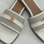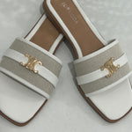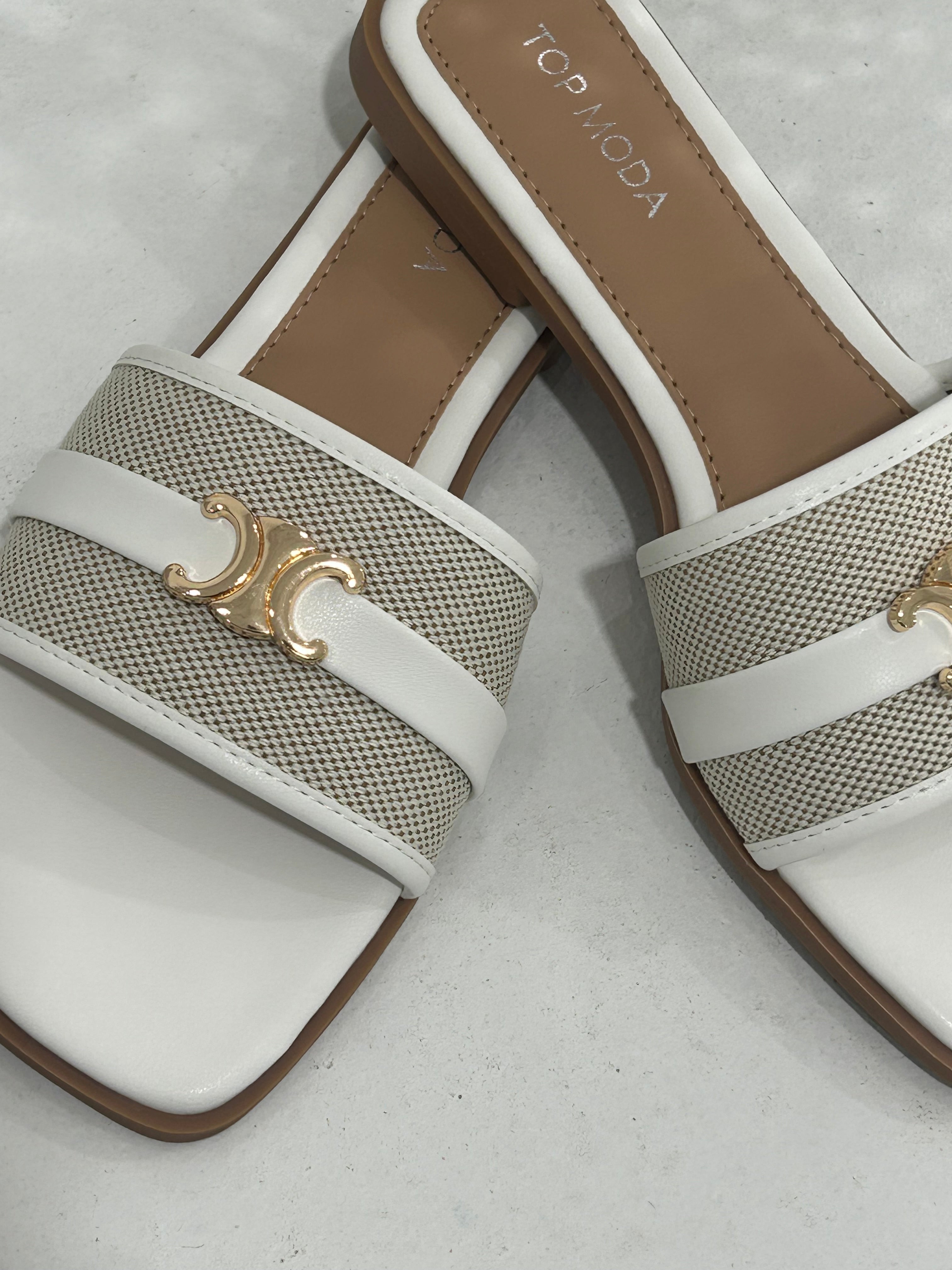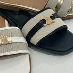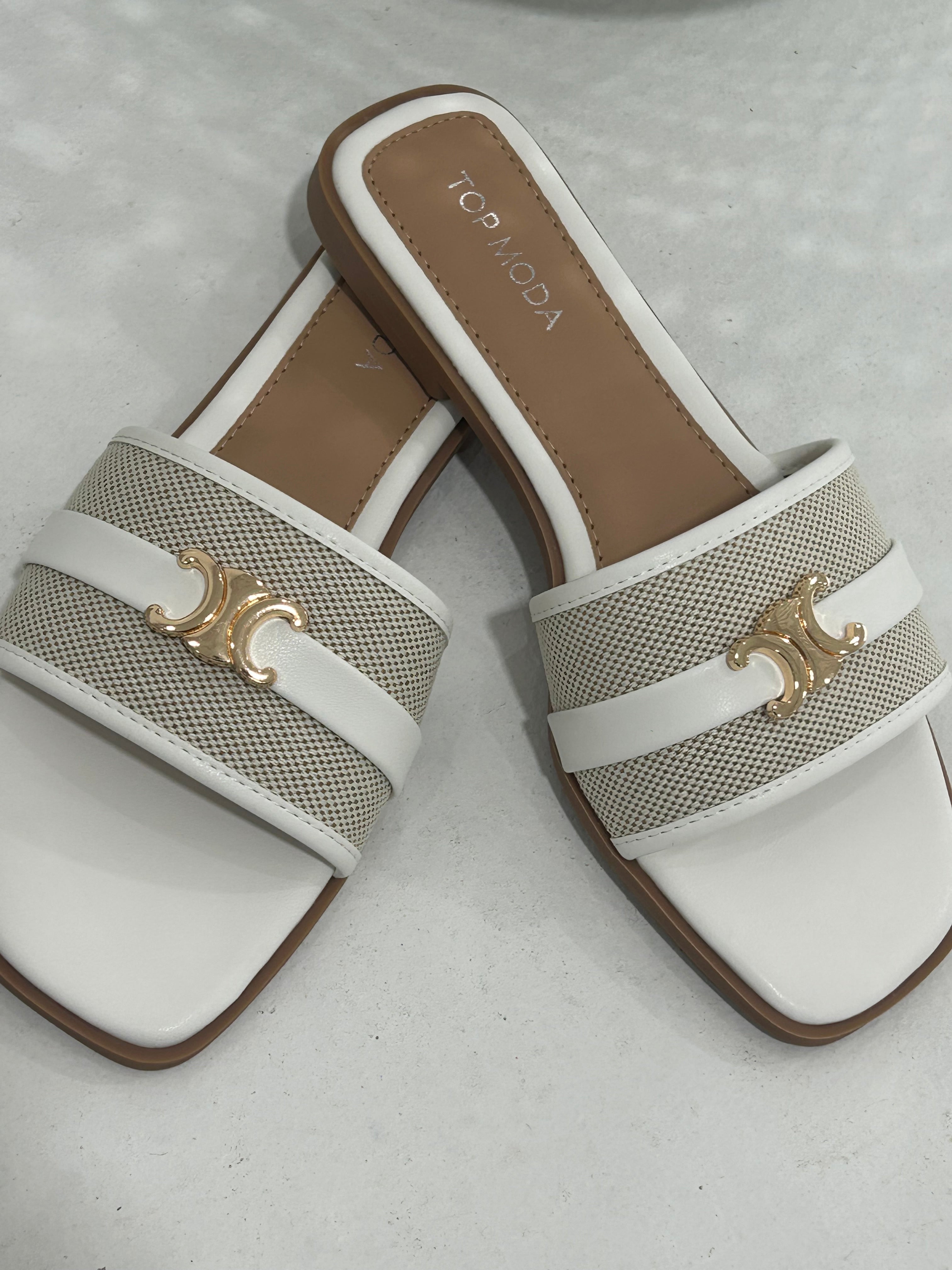 Step into bold confidence with the Solana Step Sandal. This striking design pairs textured canvas with premium faux leather, anchored by iconic gold-tone hardware that catches every glance. The modern square toe silhouette commands attention whether you're navigating your day or turning heads on vacation. Effortlessly versatile, it transitions from casual errands to elevated getaway moments with undeniable edge.
