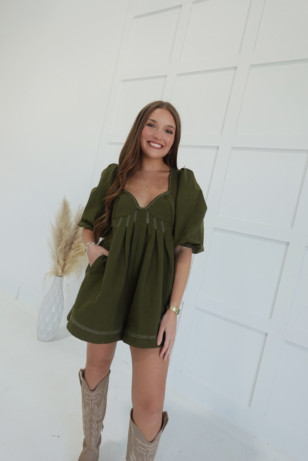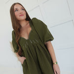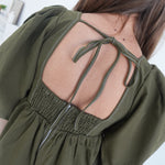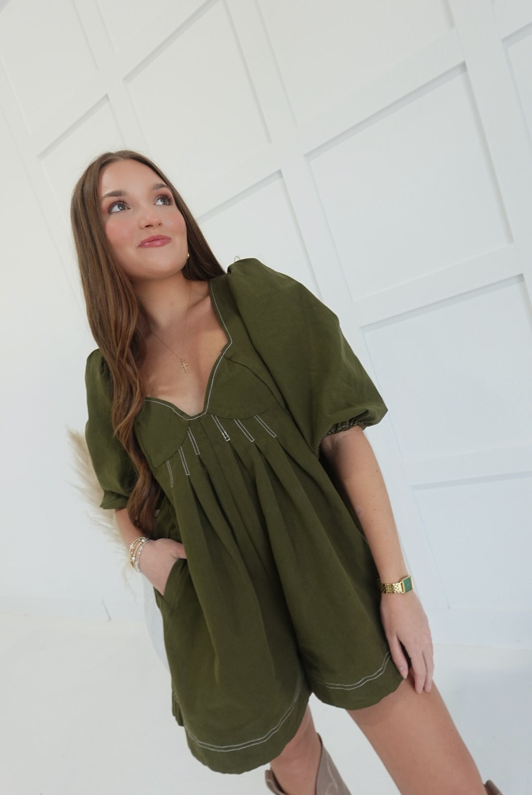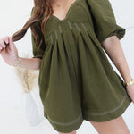 The Sonji Romper features elegant 3/4 puff sleeves and a flattering sweetheart neckline that enhances your natural silhouette. The pleated empire waist creates a comfortable, feminine fit while the back smock detail adds stylish texture. Complete with an adjustable back tie, this versatile romper can be customized to your perfect fit for all-day confidence and comfort.