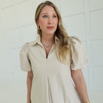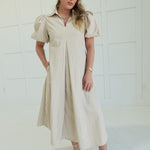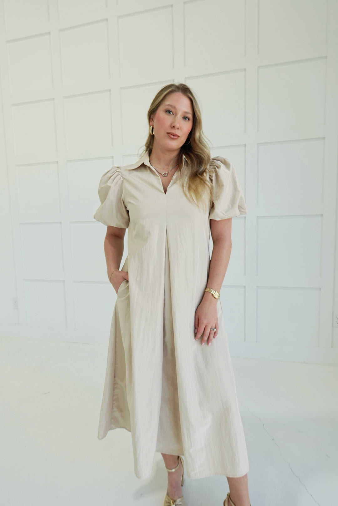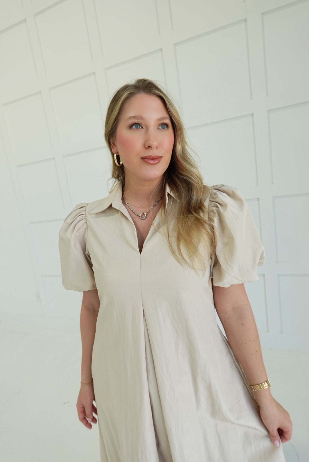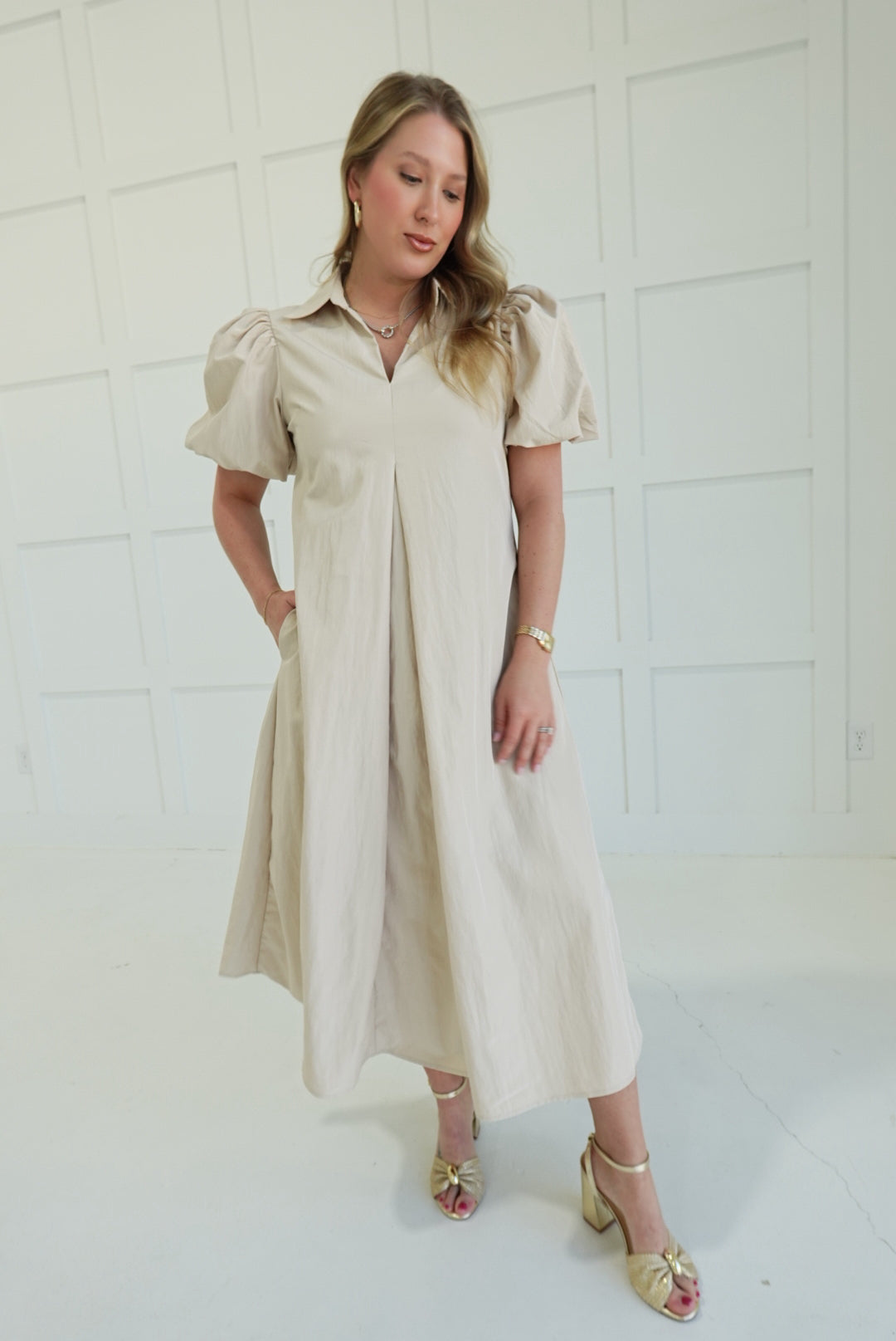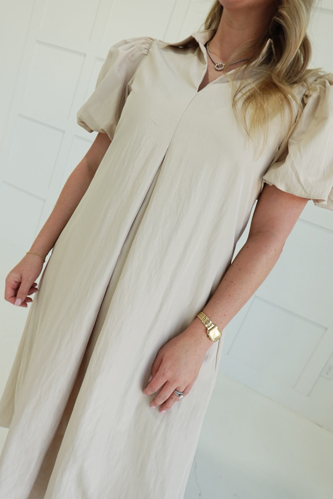 Southern on Sunday Midi Dress Elevate your weekend wardrobe with this striking midi dress that commands attention. The dramatic puff sleeves make a bold statement, while the flattering V-neckline and structured collar add sophistication and edge. Perfect for brunch, date night, or anywhere you want to turn heads, this piece transitions effortlessly from day to evening. The midi length offers timeless elegance with a modern twist—daring enough to stand out, refined enough to wear anywhere.